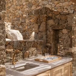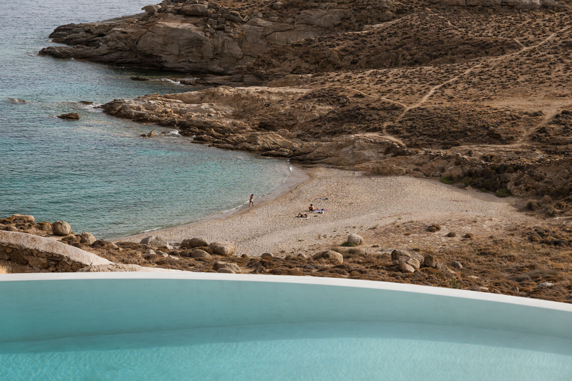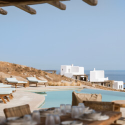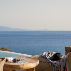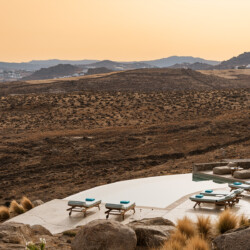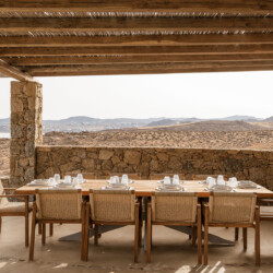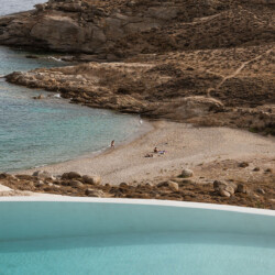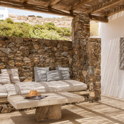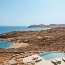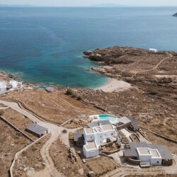 Beach Villa Ermioni, located in the rugged Tsaggari area of Mykonos, is a rare gem offering unmatched tranquility and a profound connection with the island’s untamed beauty. This expansive villa, designed to accommodate up to 20 guests, spans three levels and features several independent sections, ensuring privacy and unparalleled comfort.