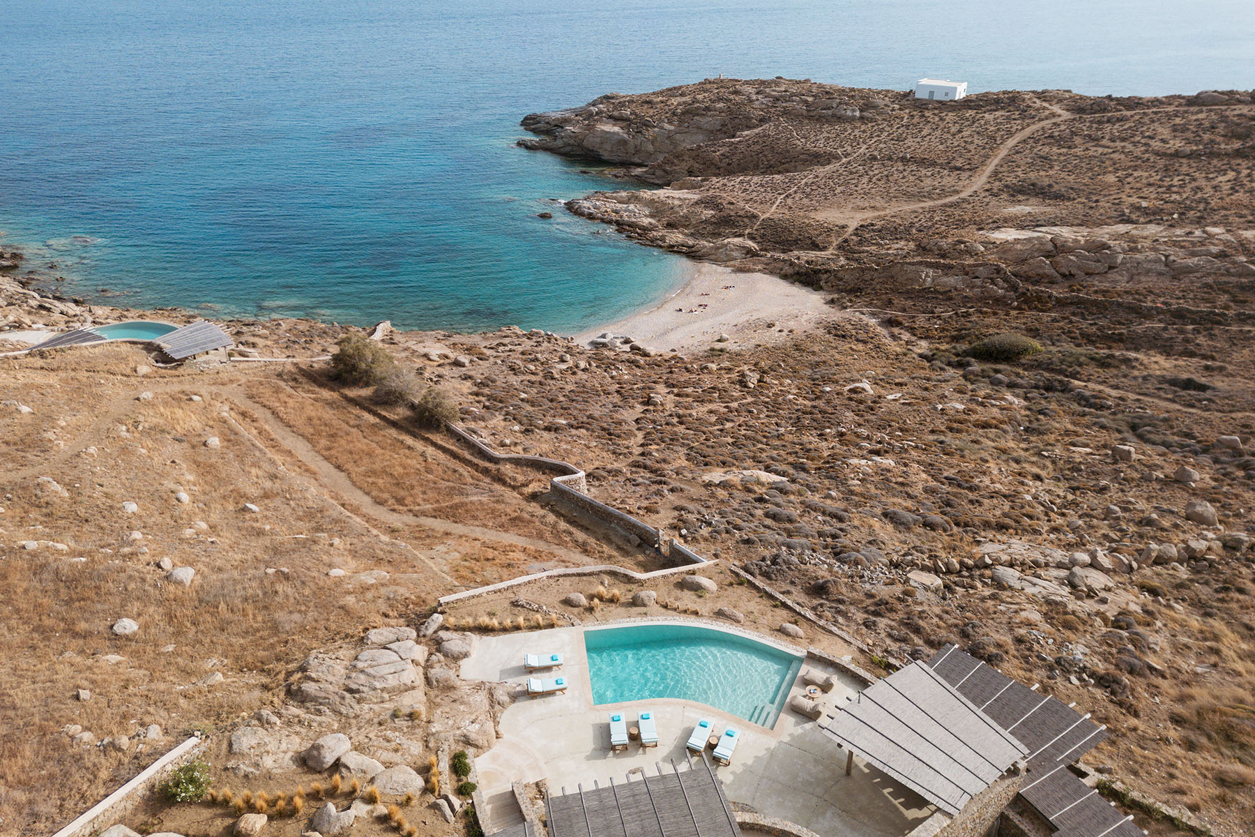 The main house boasts five spacious double bedrooms, each with an en-suite bathroom, alongside a large living and dining area and a fully equipped kitchen. On the lower level, three additional double bedrooms and a second kitchen form a separate, self-contained unit perfect for groups of friends. The upper level is reserved for the master bedroom, offering breathtaking panoramic views of the Aegean Sea. Scattered around the property are additional independent bedroom suites, designed to enhance the sense of seclusion and relaxation.