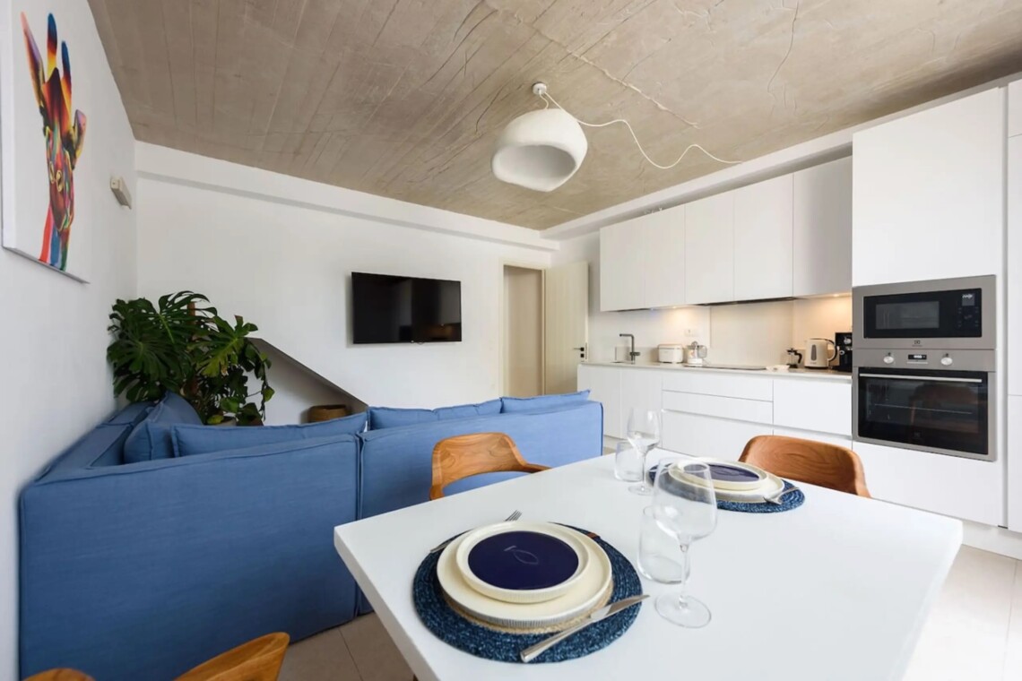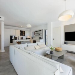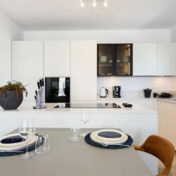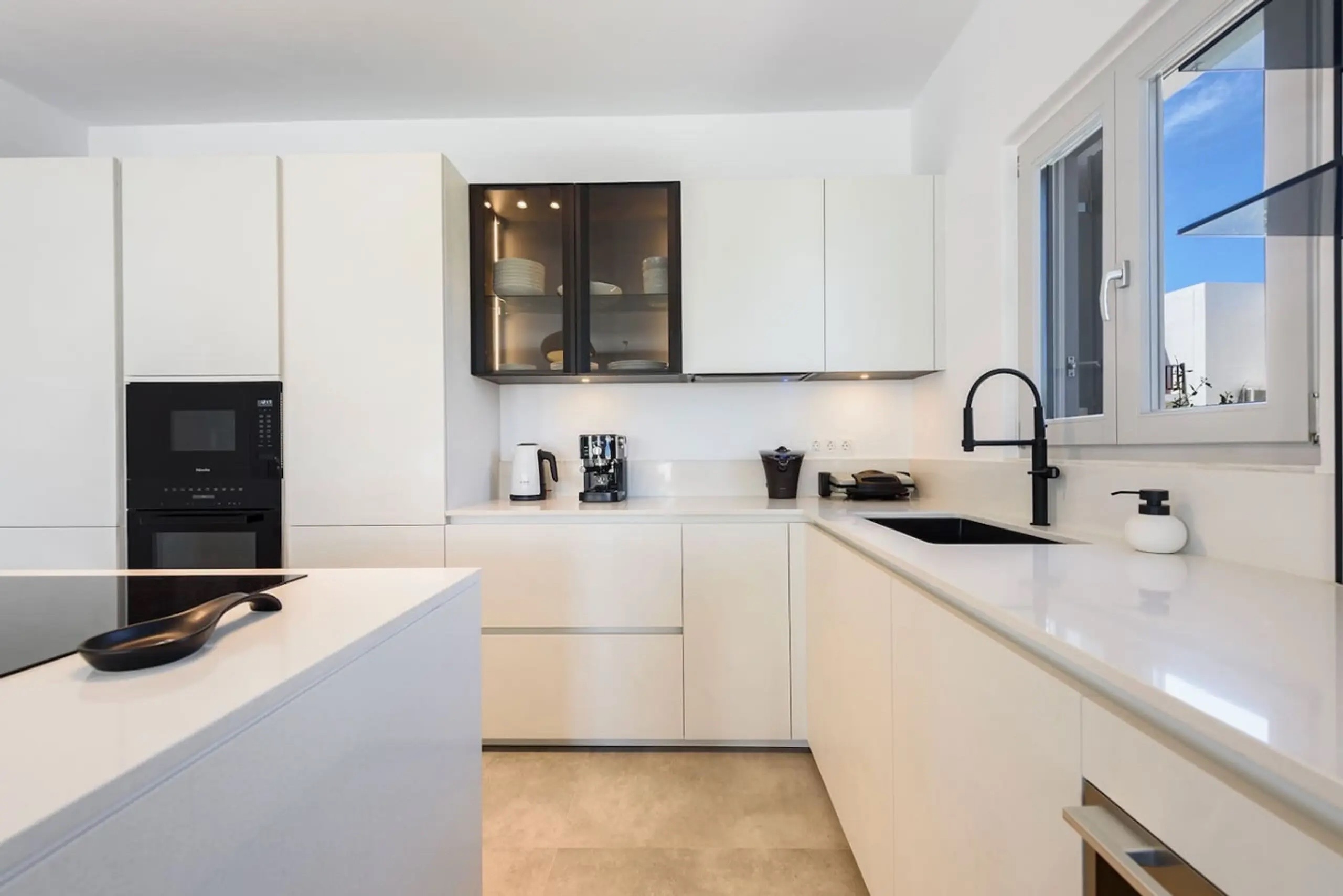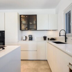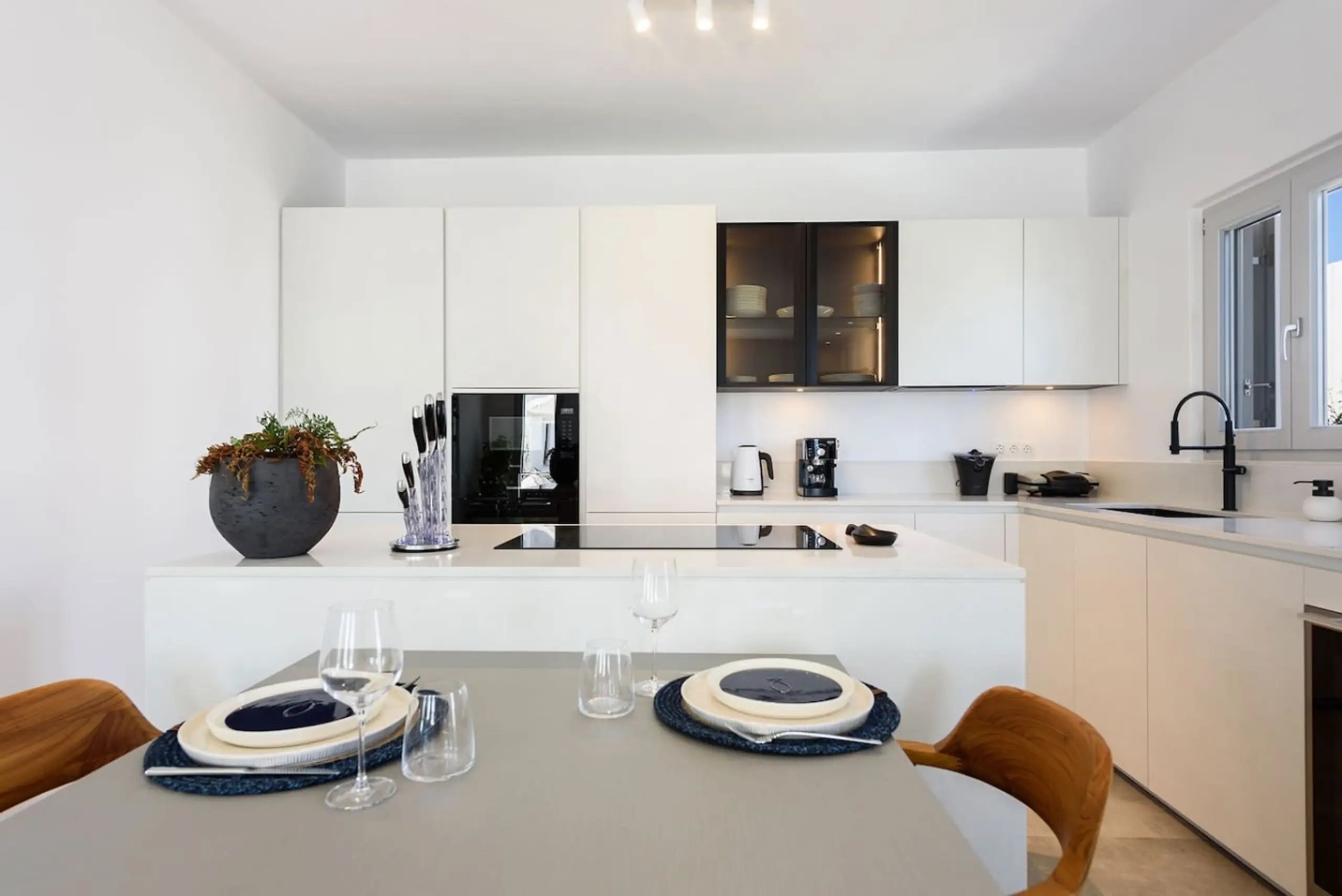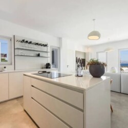 The villa features three beautifully appointed bedrooms – two with king-size beds and one with twin beds that can be separated – along with a versatile basement apartment ideal for additional guests. This apartment includes two twin beds, a sofa bed, a fully equipped kitchen, and a spacious living area, ensuring both privacy and convenience. The open-plan main kitchen, complete with a central island, connects seamlessly to the living room and offers stunning sea views, perfect for socializing and entertaining.