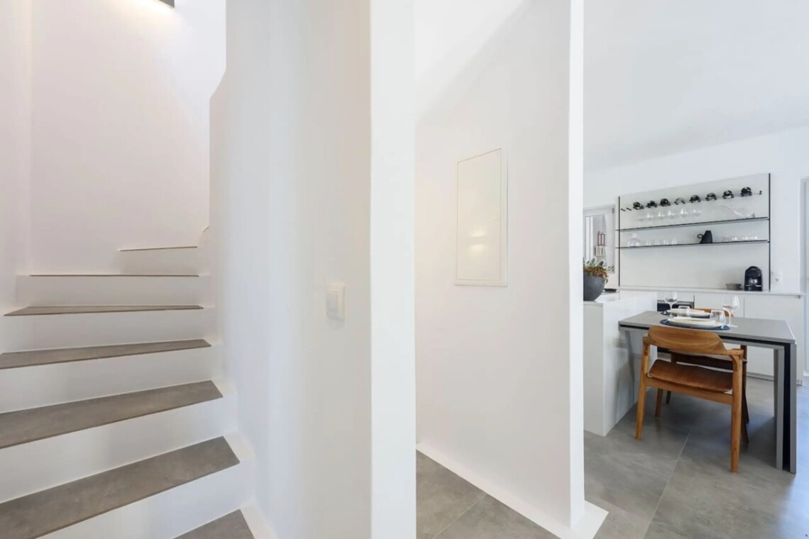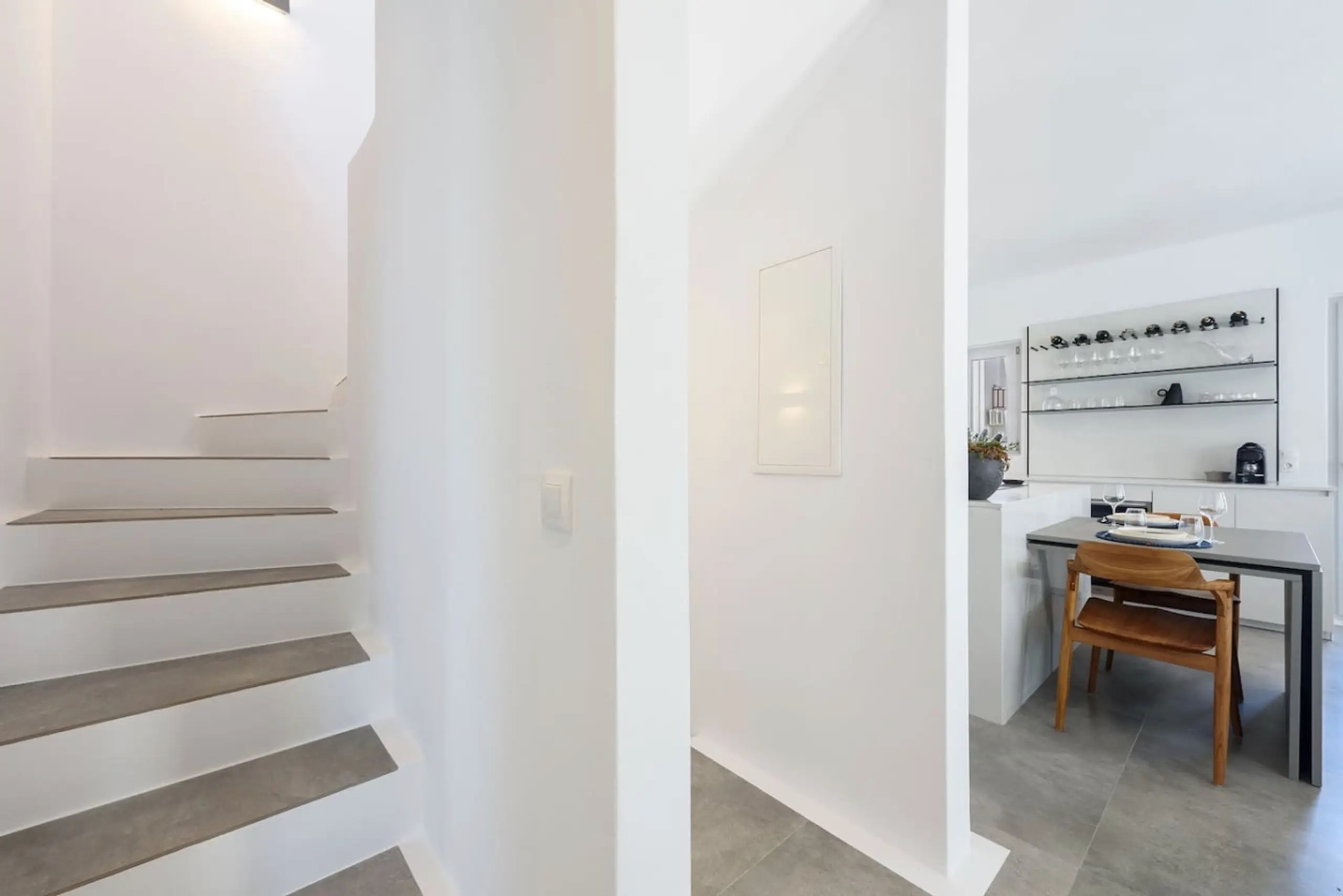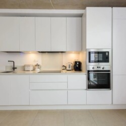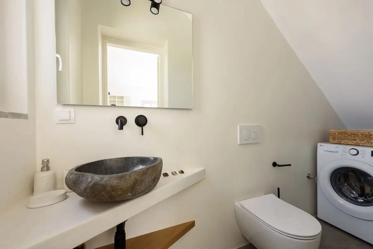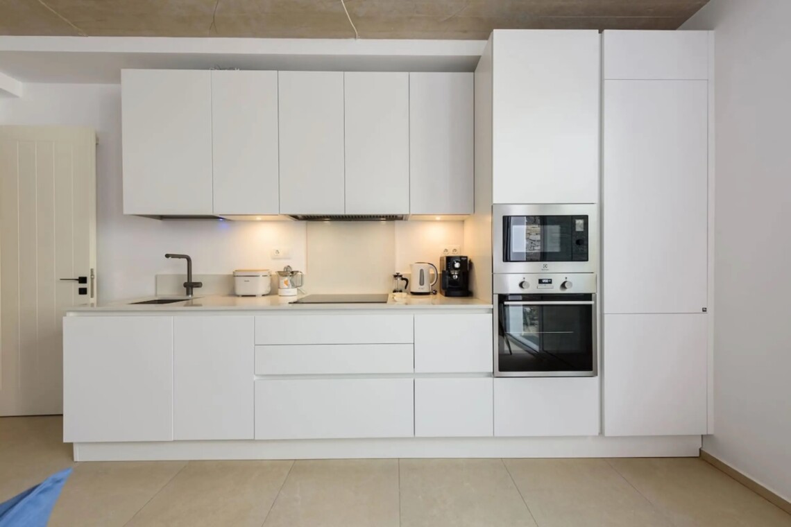 The villa features three beautifully appointed bedrooms – two with king-size beds and one with twin beds that can be separated – along with a versatile basement apartment ideal for additional guests. This apartment includes two twin beds, a sofa bed, a fully equipped kitchen, and a spacious living area, ensuring both privacy and convenience. The open-plan main kitchen, complete with a central island, connects seamlessly to the living room and offers stunning sea views, perfect for socializing and entertaining.