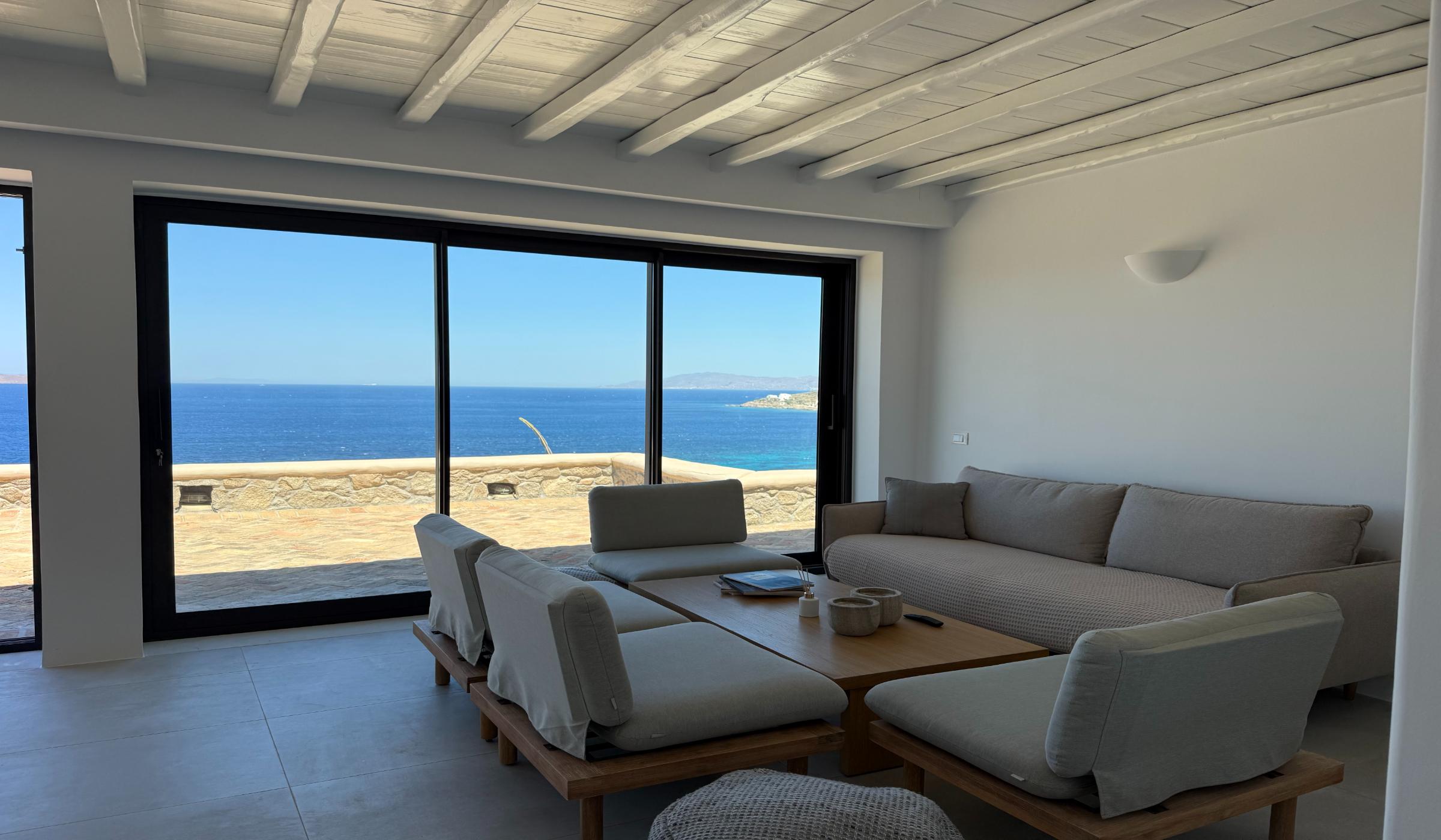 Outdoor living is at the heart of Blue Sky Villa, where sunset views can be enjoyed from every exterior space. A private swimming pool, al fresco dining area, and inviting lounge settings provide the perfect backdrop for relaxed days, sunset cocktails, and memorable evenings overlooking the endless blue of the Aegean.