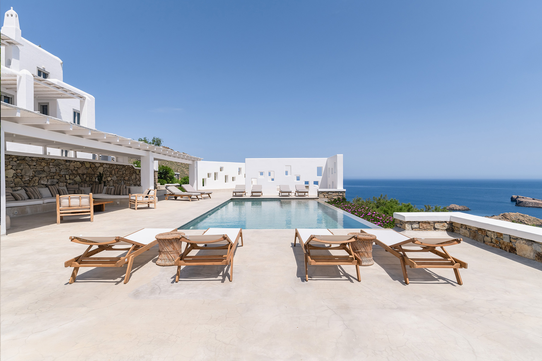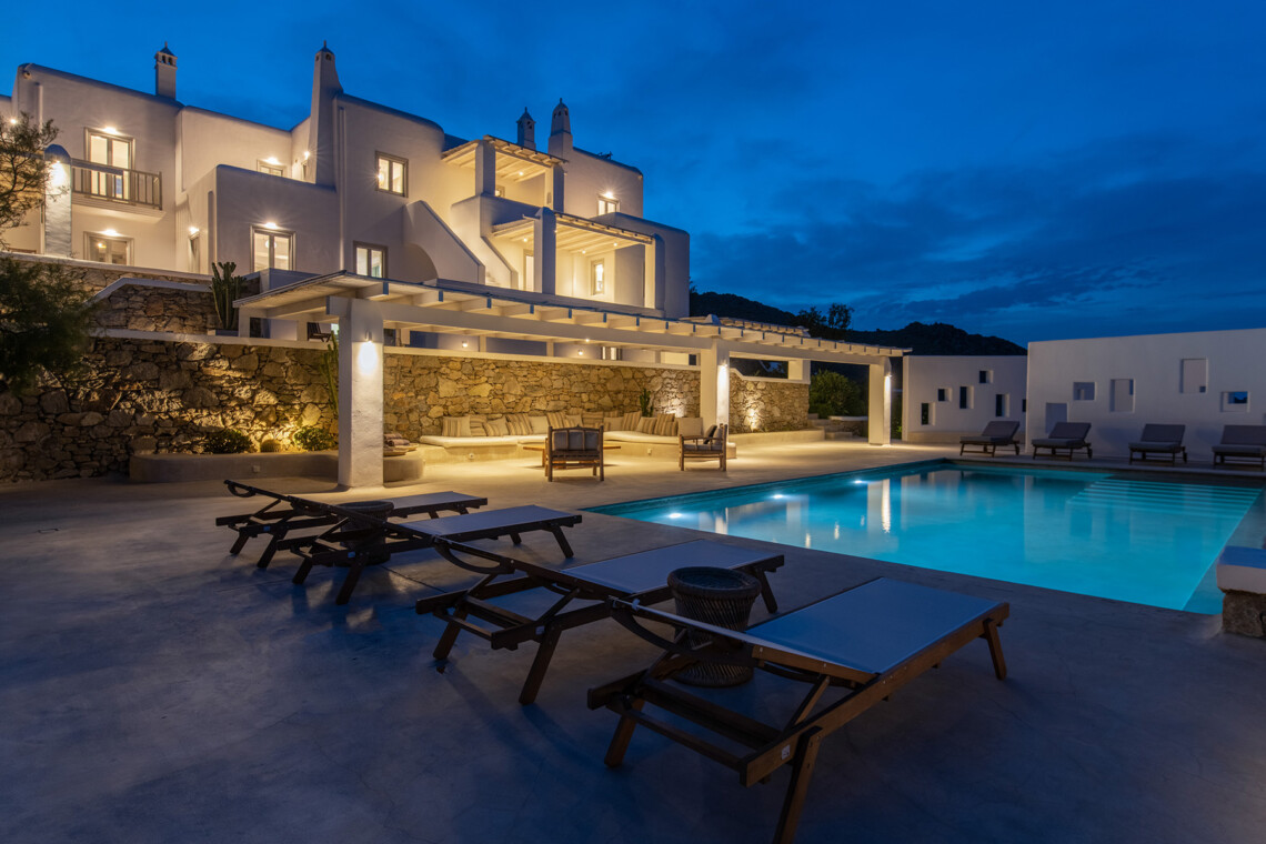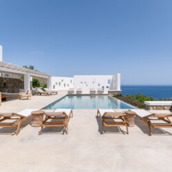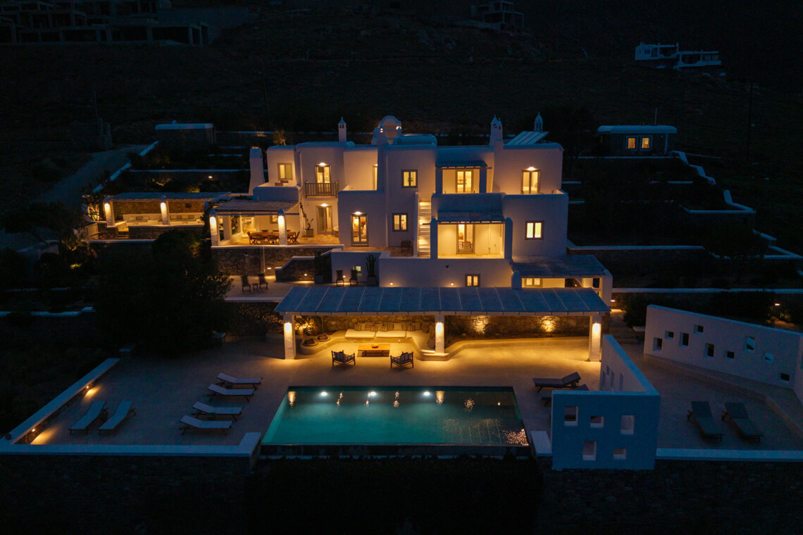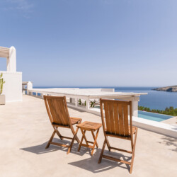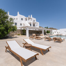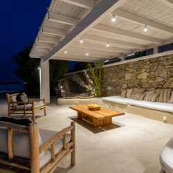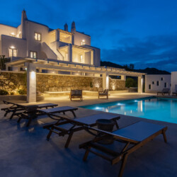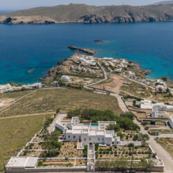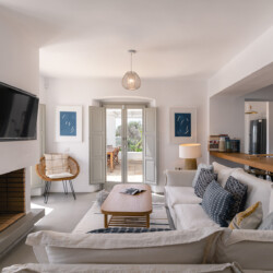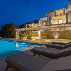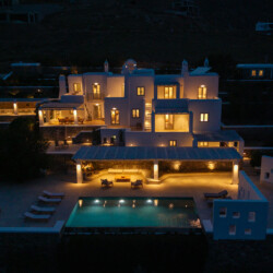 Perched above Agios Sostis beach, Villa Boho offers privacy and stunning views of Panormos bay. Just a short walk away, this quiet, undeveloped beach provides a serene escape. The villa features seven en-suite bedrooms, a renovated interior, and a private pool surrounded by landscaped gardens.