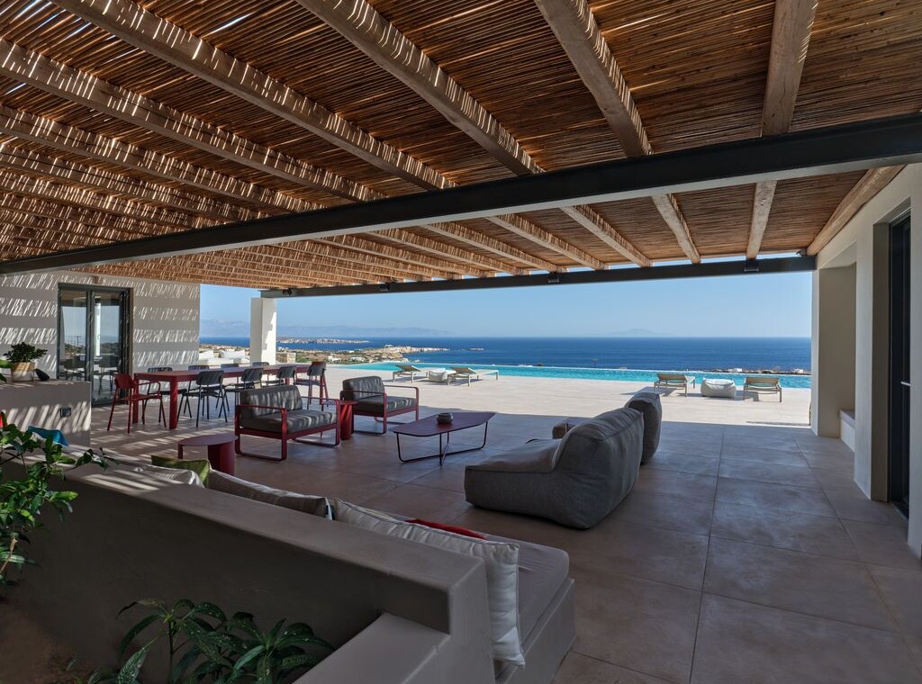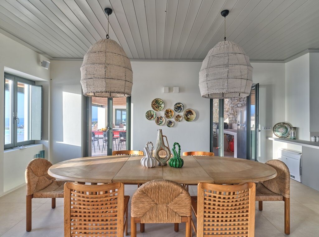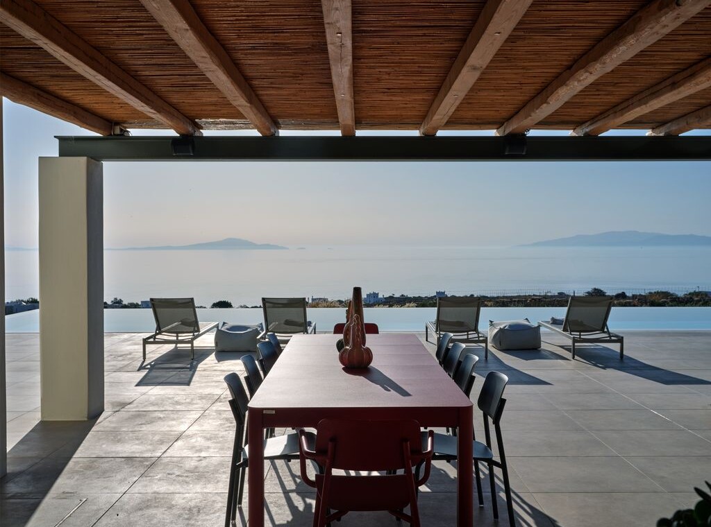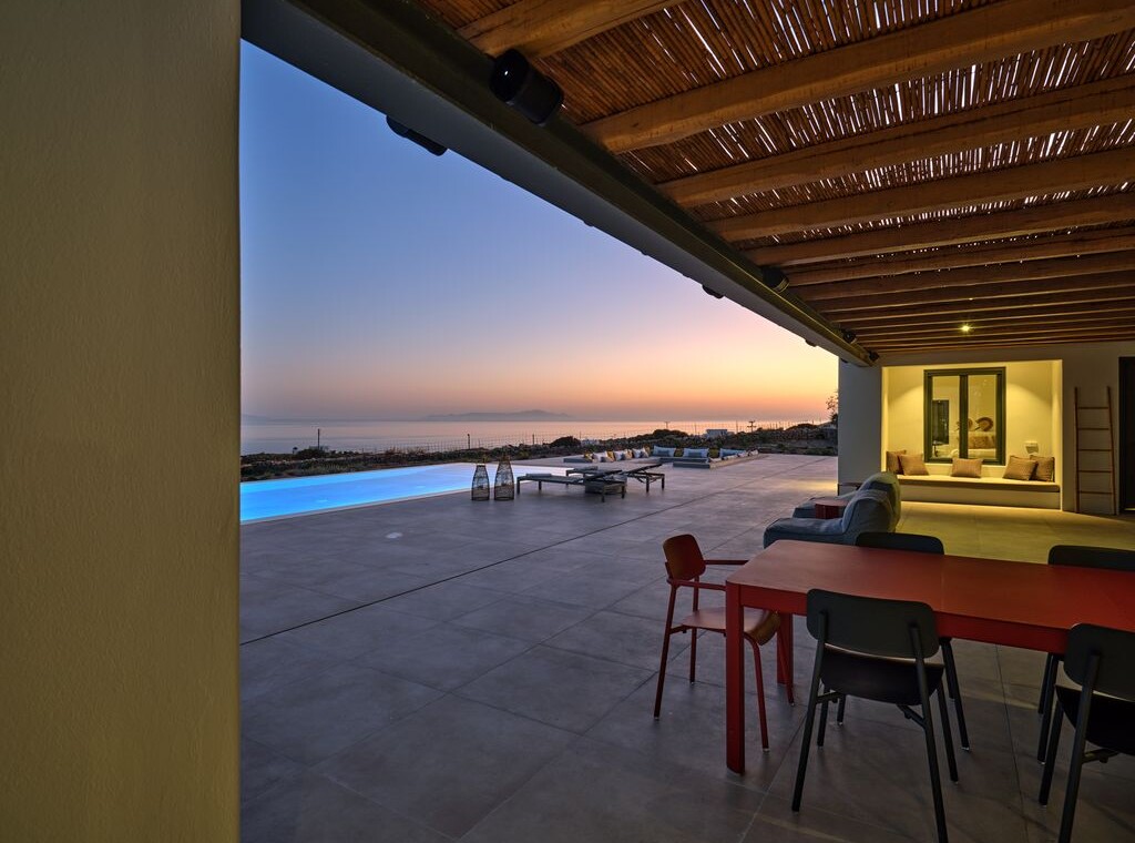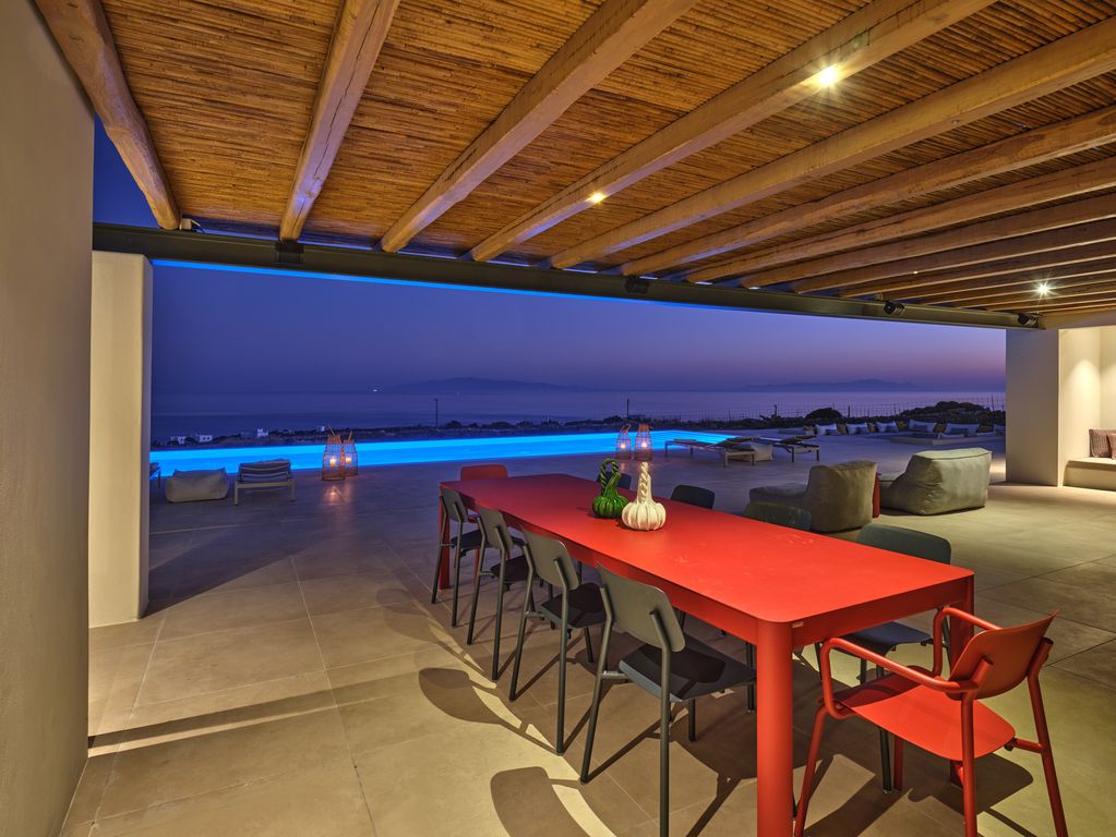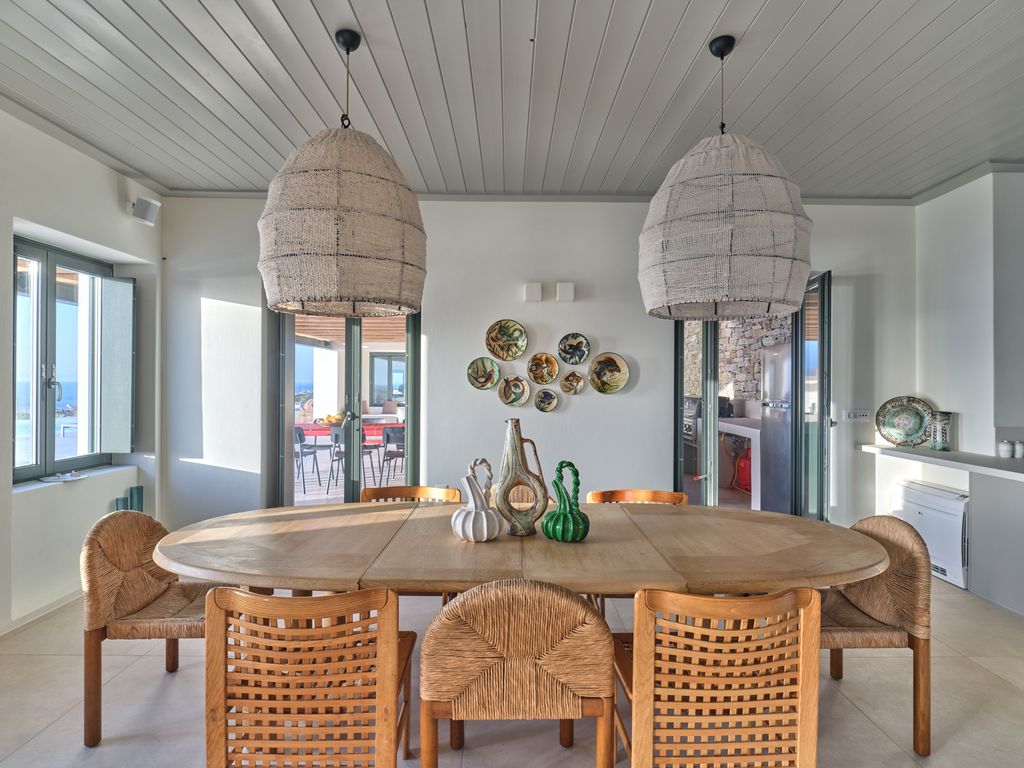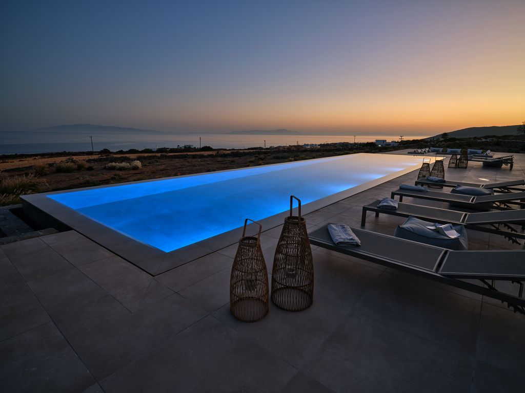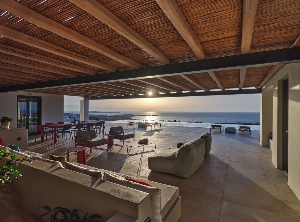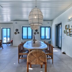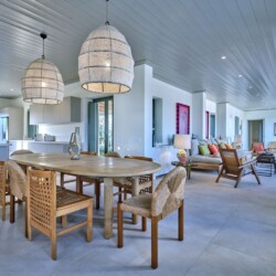 The outdoor area is a postcard-perfect sanctuary, featuring an infinity pool that seems to merge with the sea, inviting guests to swim, unwind, or simply take in the horizon. Elegant shaded lounges, al fresco dining areas, and lush gardens surround the property, creating an intimate oasis of peace and privacy. Every detail, from the minimalist architecture to the harmonious landscaping, reflects a deep connection to the island’s tranquil spirit.
