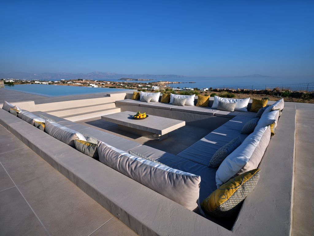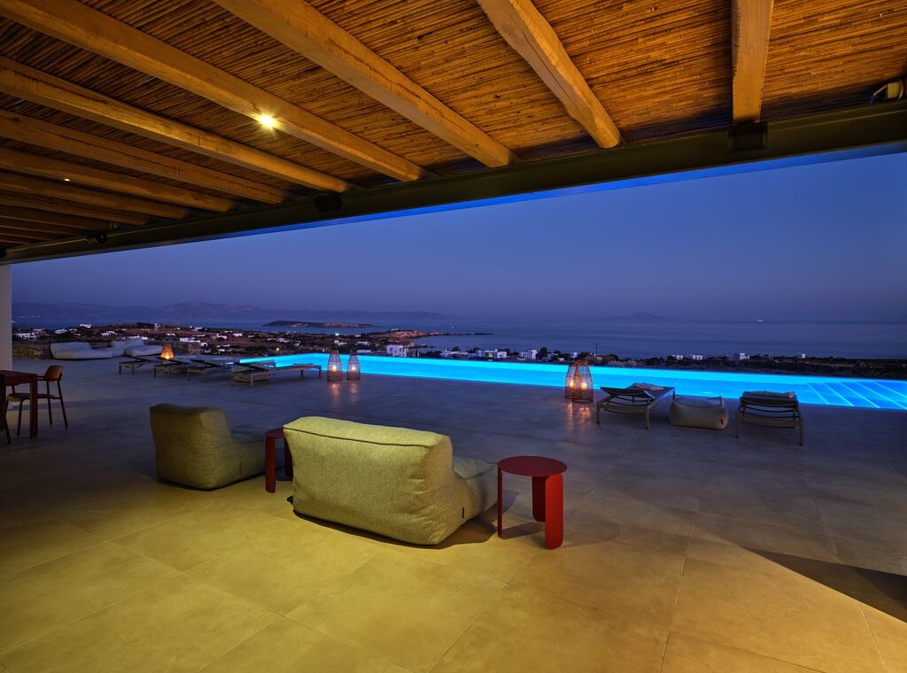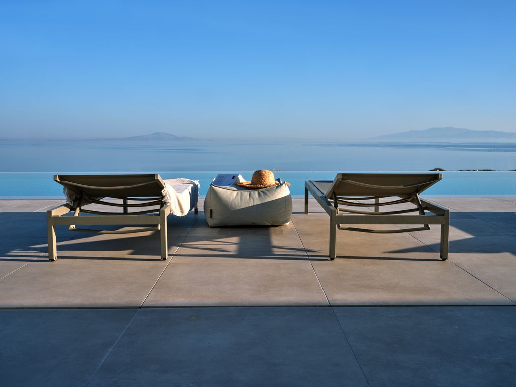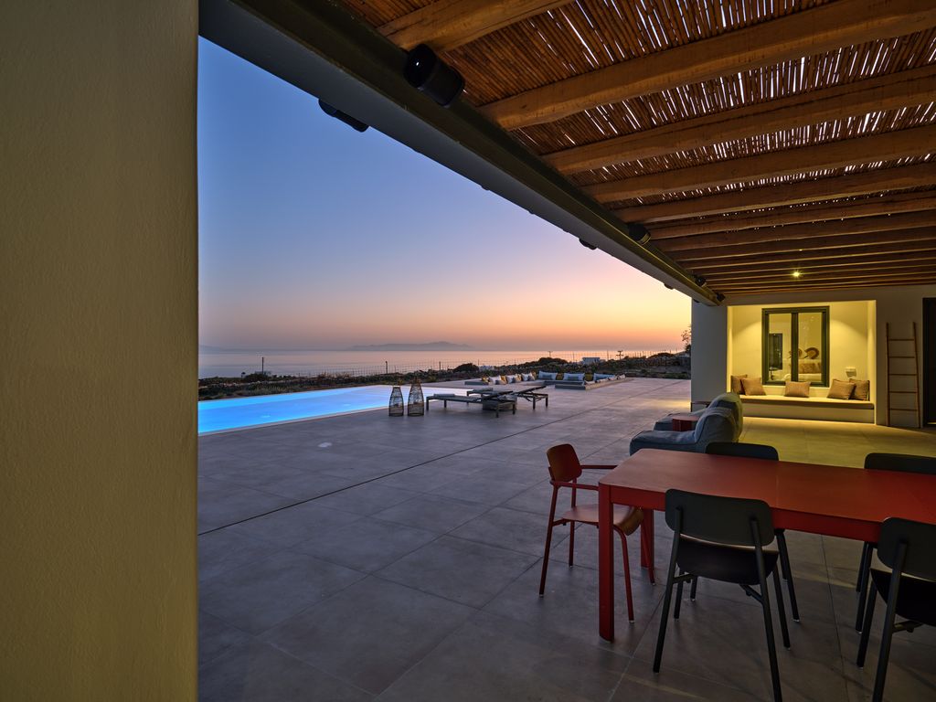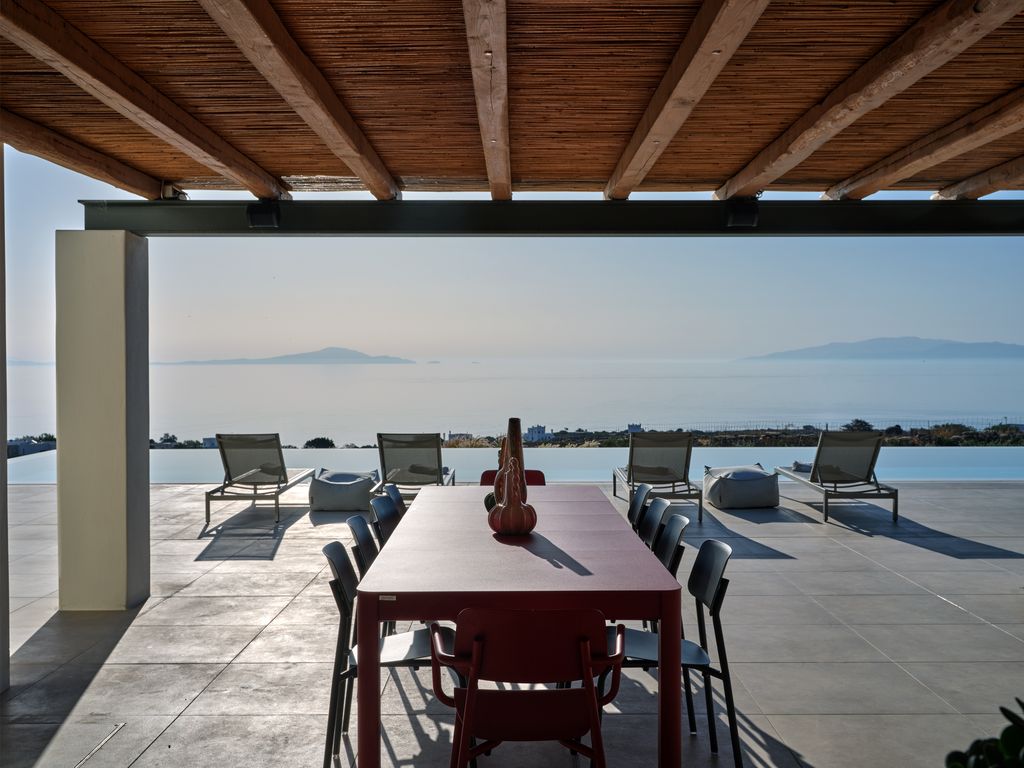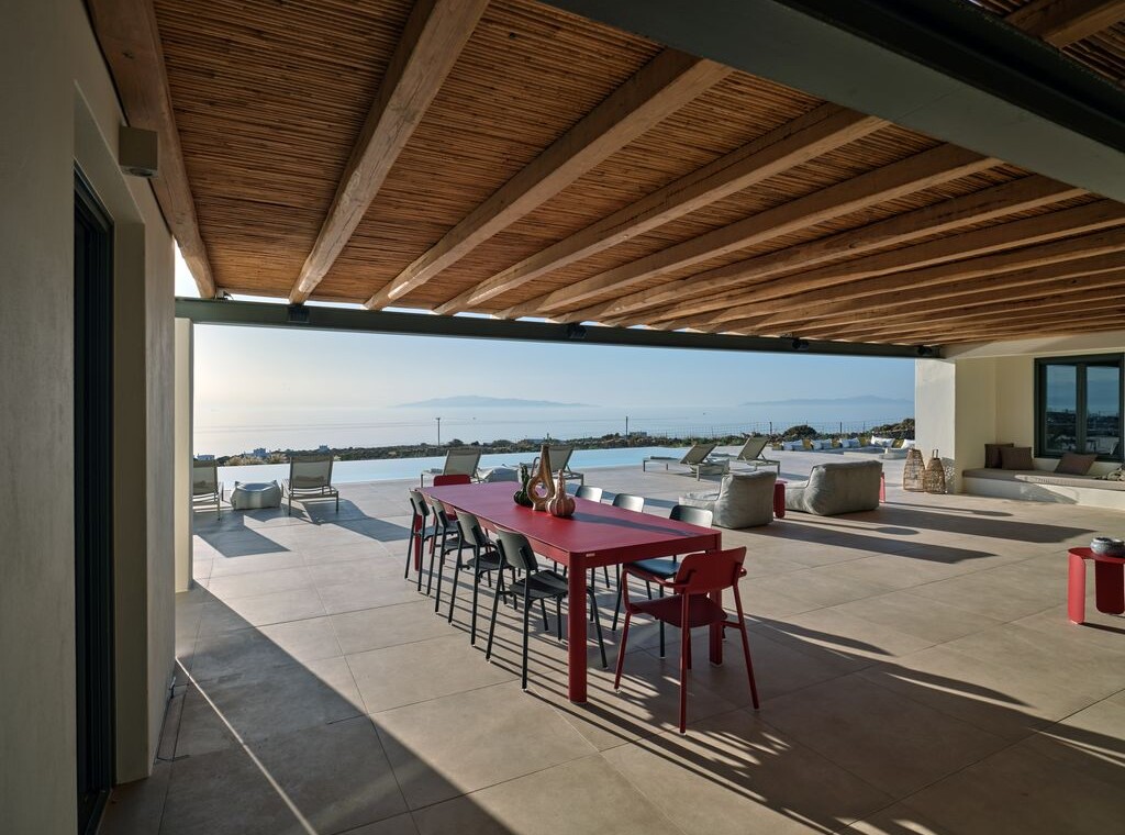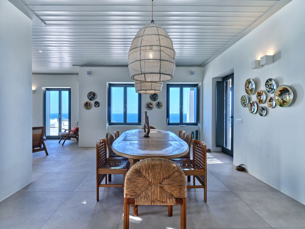 The outdoor area is a postcard-perfect sanctuary, featuring an infinity pool that seems to merge with the sea, inviting guests to swim, unwind, or simply take in the horizon. Elegant shaded lounges, al fresco dining areas, and lush gardens surround the property, creating an intimate oasis of peace and privacy. Every detail, from the minimalist architecture to the harmonious landscaping, reflects a deep connection to the island’s tranquil spirit.