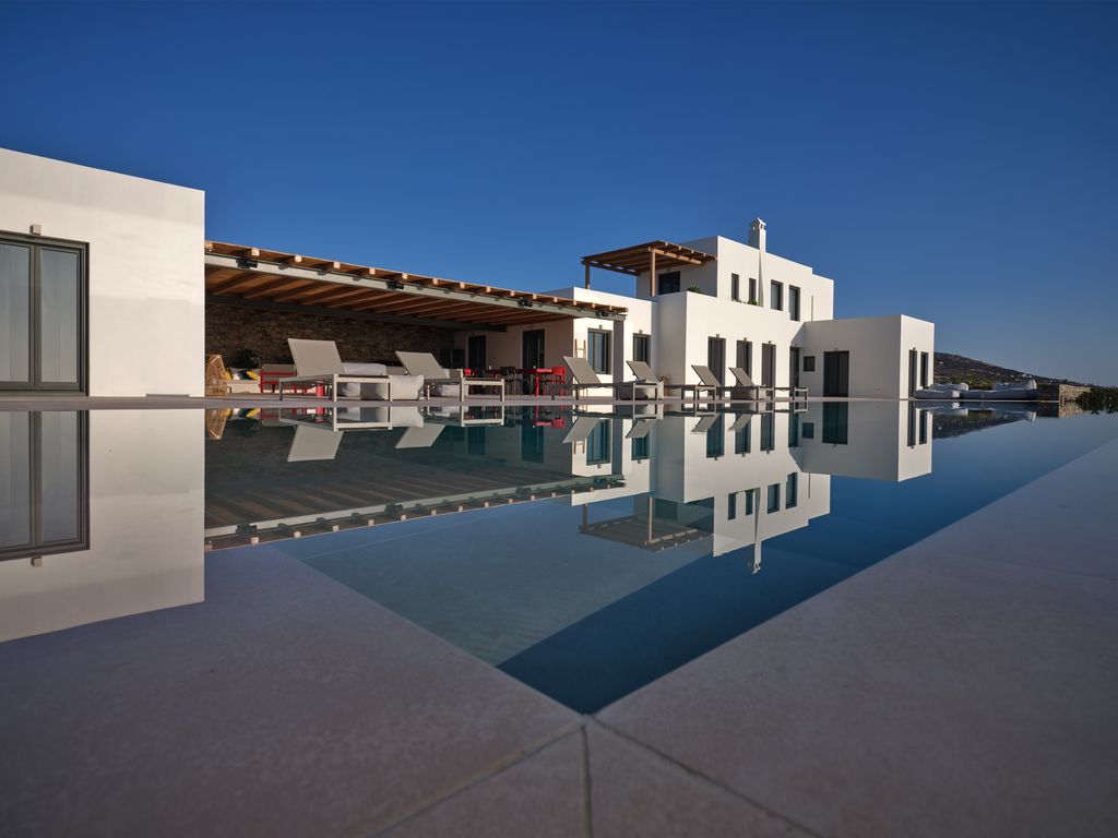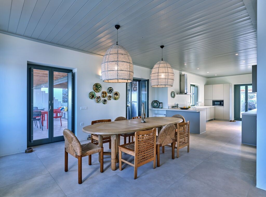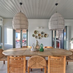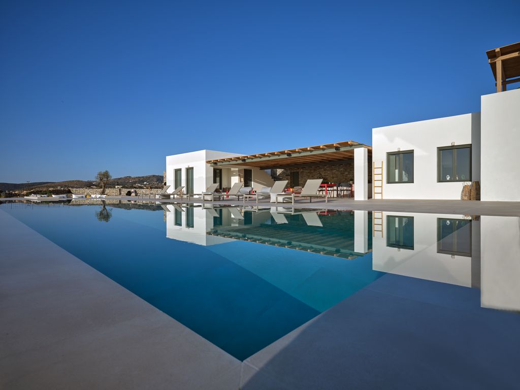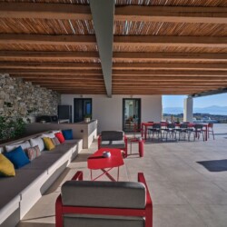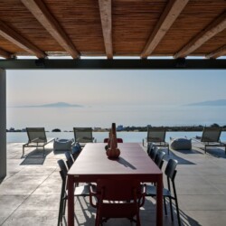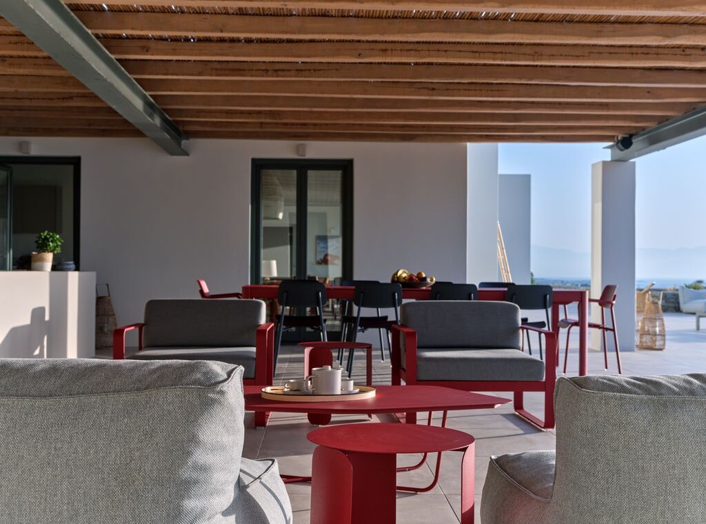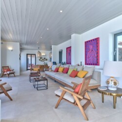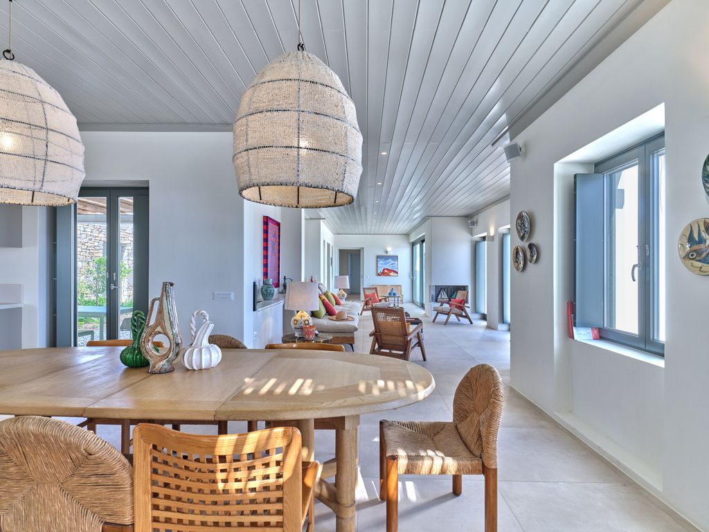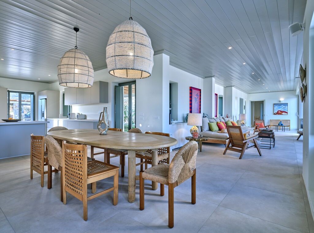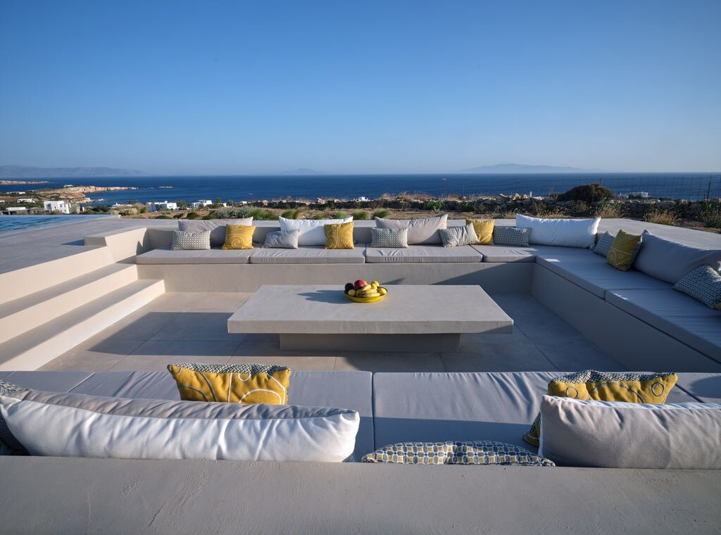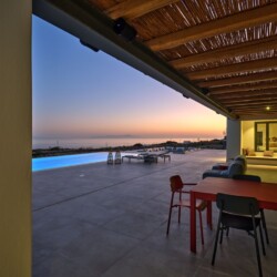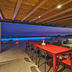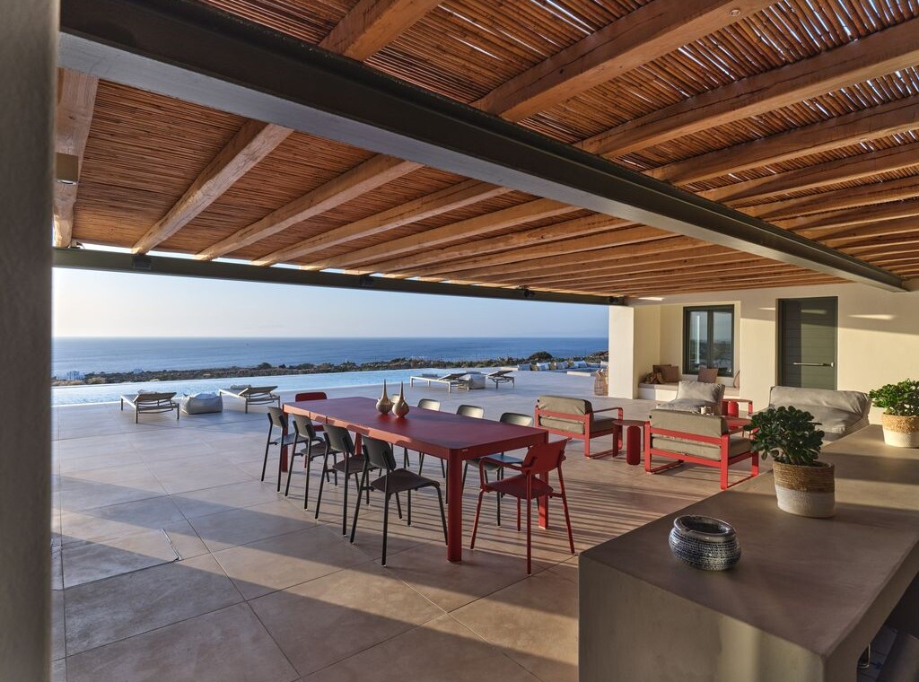 The outdoor area is a postcard-perfect sanctuary, featuring an infinity pool that seems to merge with the sea, inviting guests to swim, unwind, or simply take in the horizon. Elegant shaded lounges, al fresco dining areas, and lush gardens surround the property, creating an intimate oasis of peace and privacy. Every detail, from the minimalist architecture to the harmonious landscaping, reflects a deep connection to the island’s tranquil spirit.