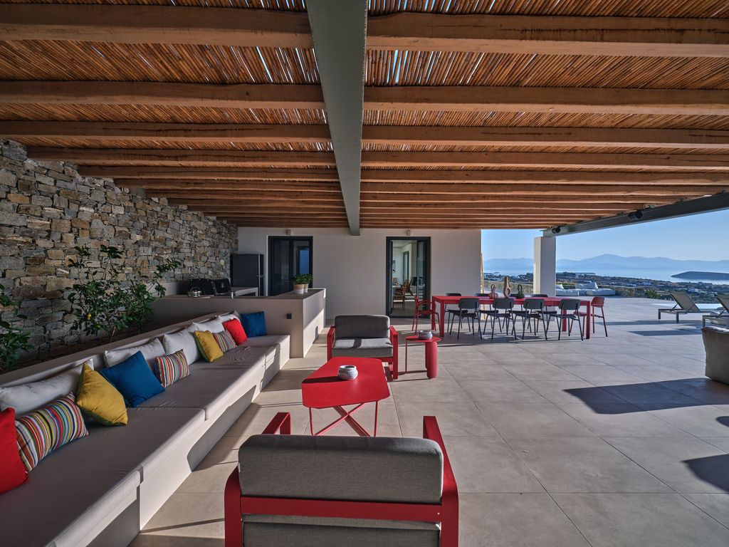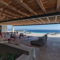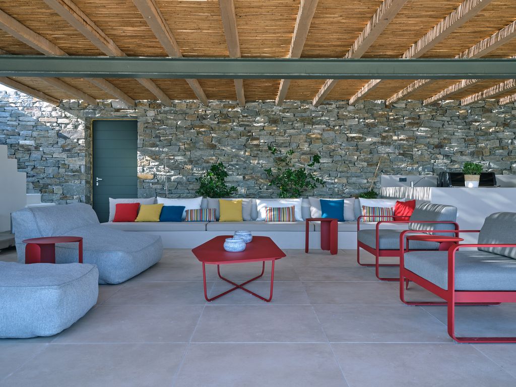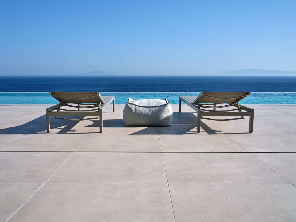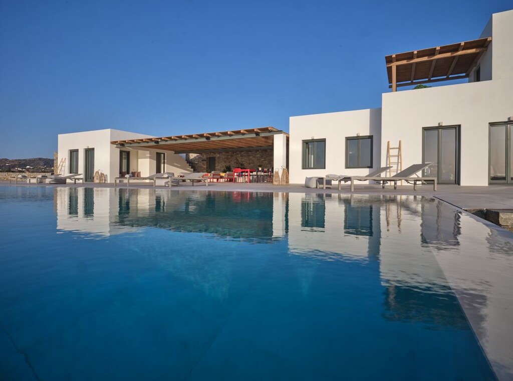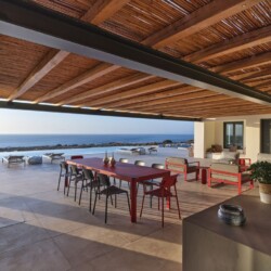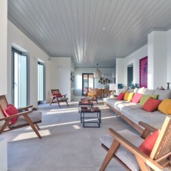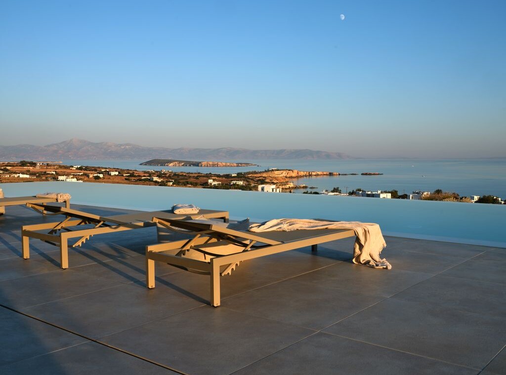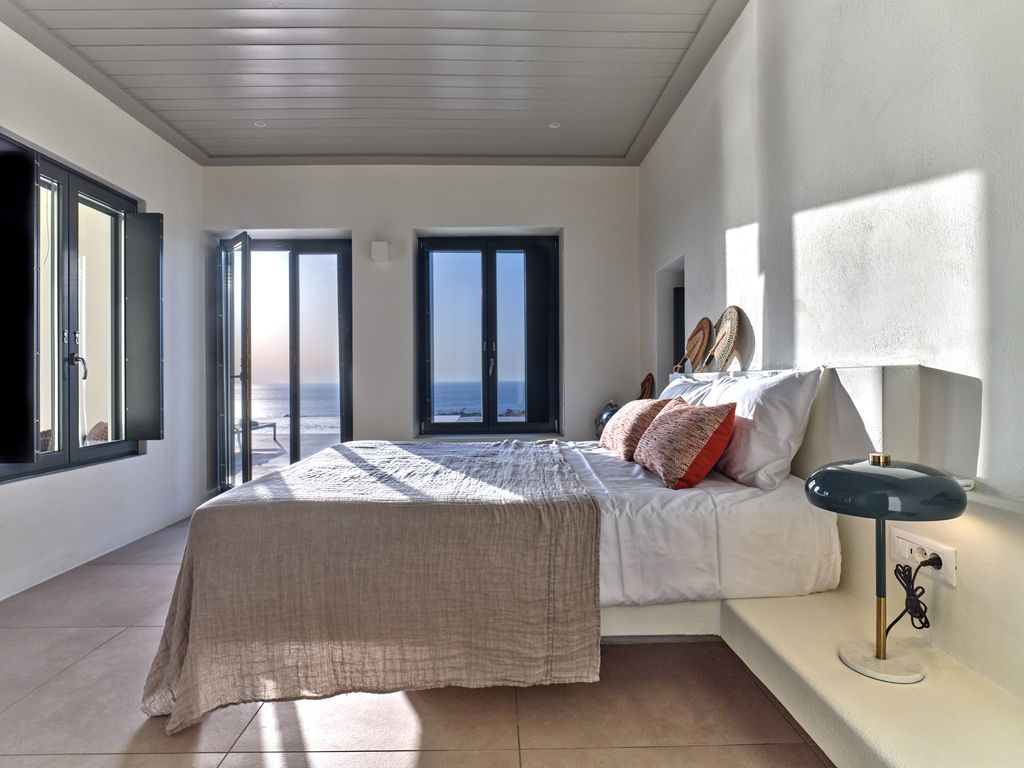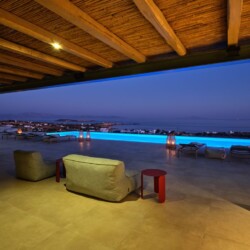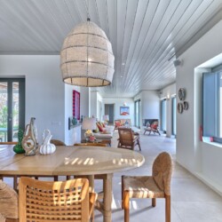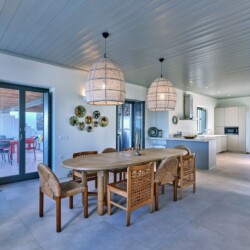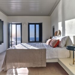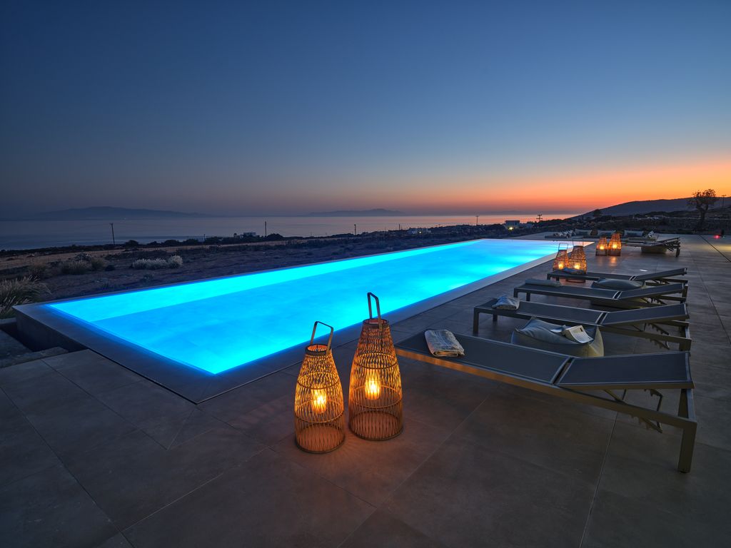 The outdoor area is a postcard-perfect sanctuary, featuring an infinity pool that seems to merge with the sea, inviting guests to swim, unwind, or simply take in the horizon. Elegant shaded lounges, al fresco dining areas, and lush gardens surround the property, creating an intimate oasis of peace and privacy. Every detail, from the minimalist architecture to the harmonious landscaping, reflects a deep connection to the island’s tranquil spirit.