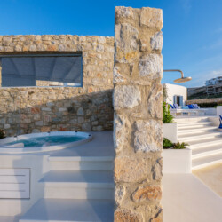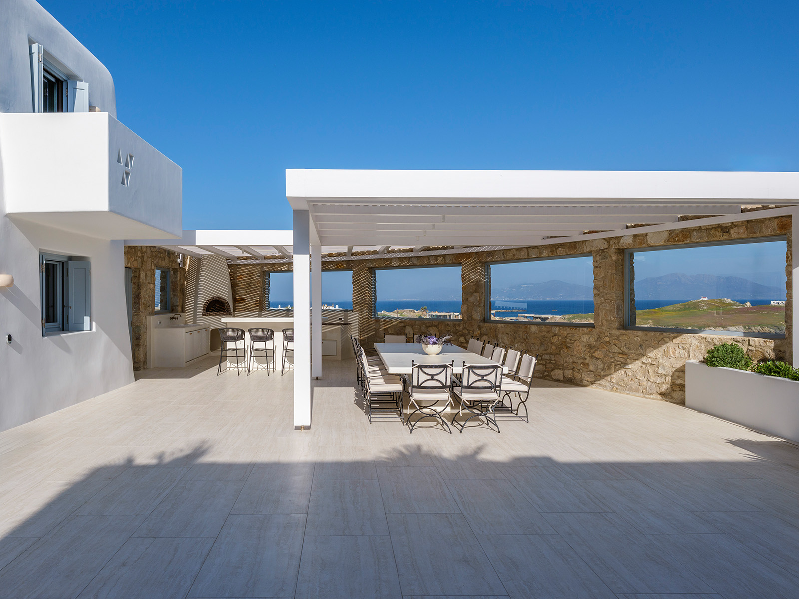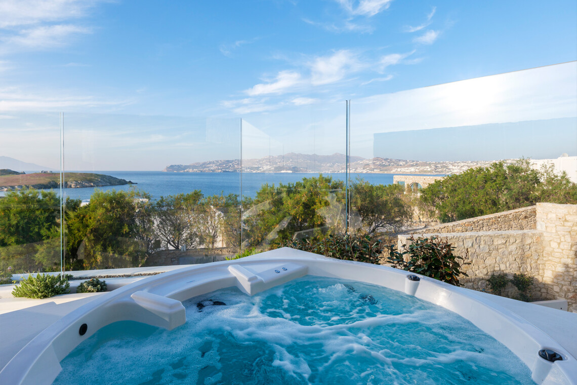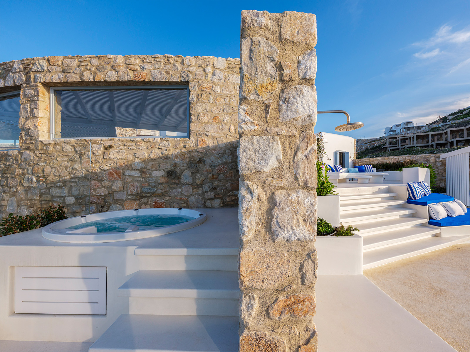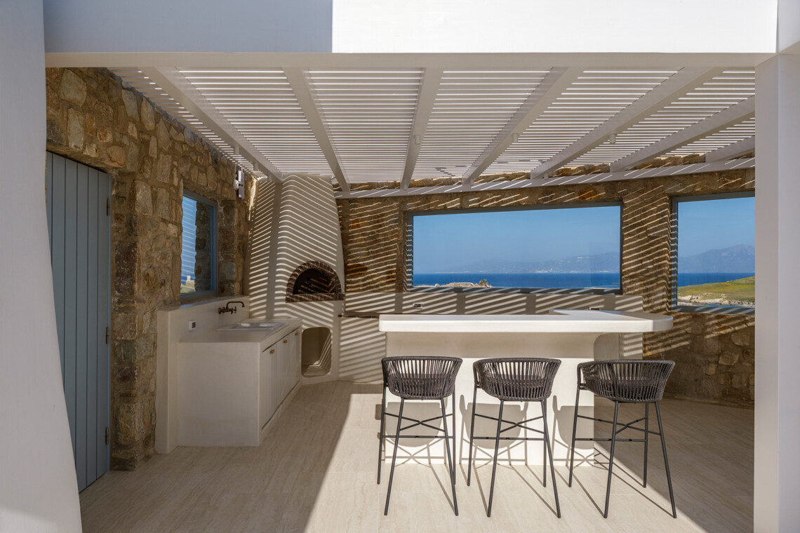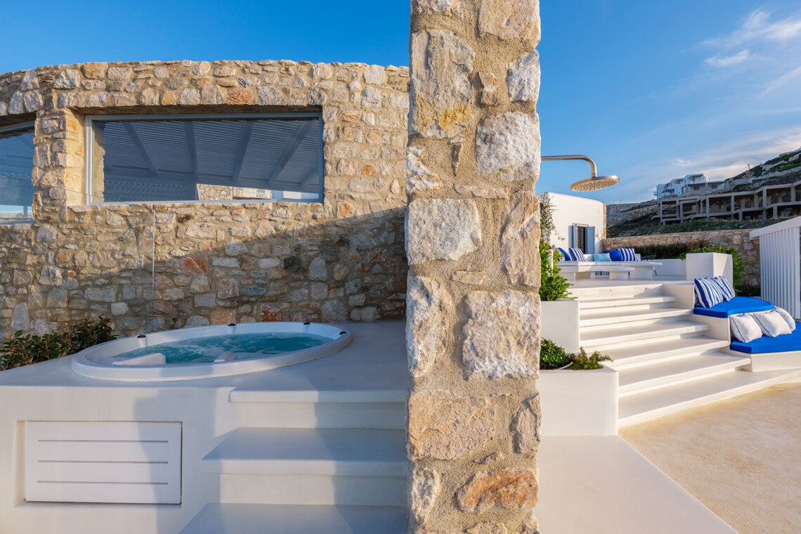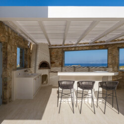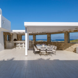 Outdoor living is the heart of the experience, with a private pool overlooking the bay, a sunset lounge, and a fully equipped al fresco dining area featuring a BBQ, wood-fired pizza oven, and a large dining table. A shared panoramic Jacuzzi completes this refined Mykonos retreat, ideal for relaxed gatherings and unforgettable sunsets.