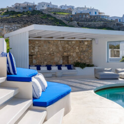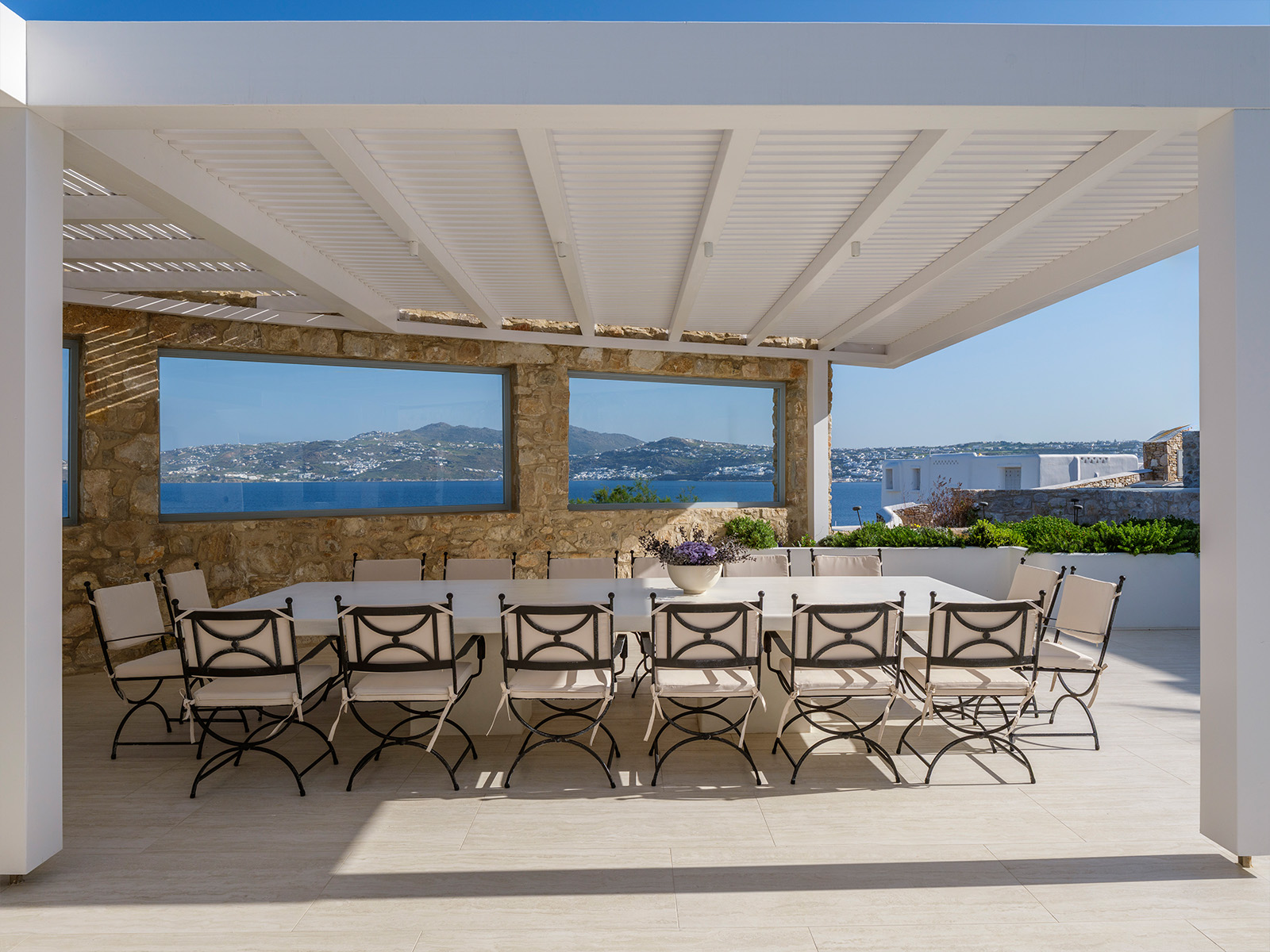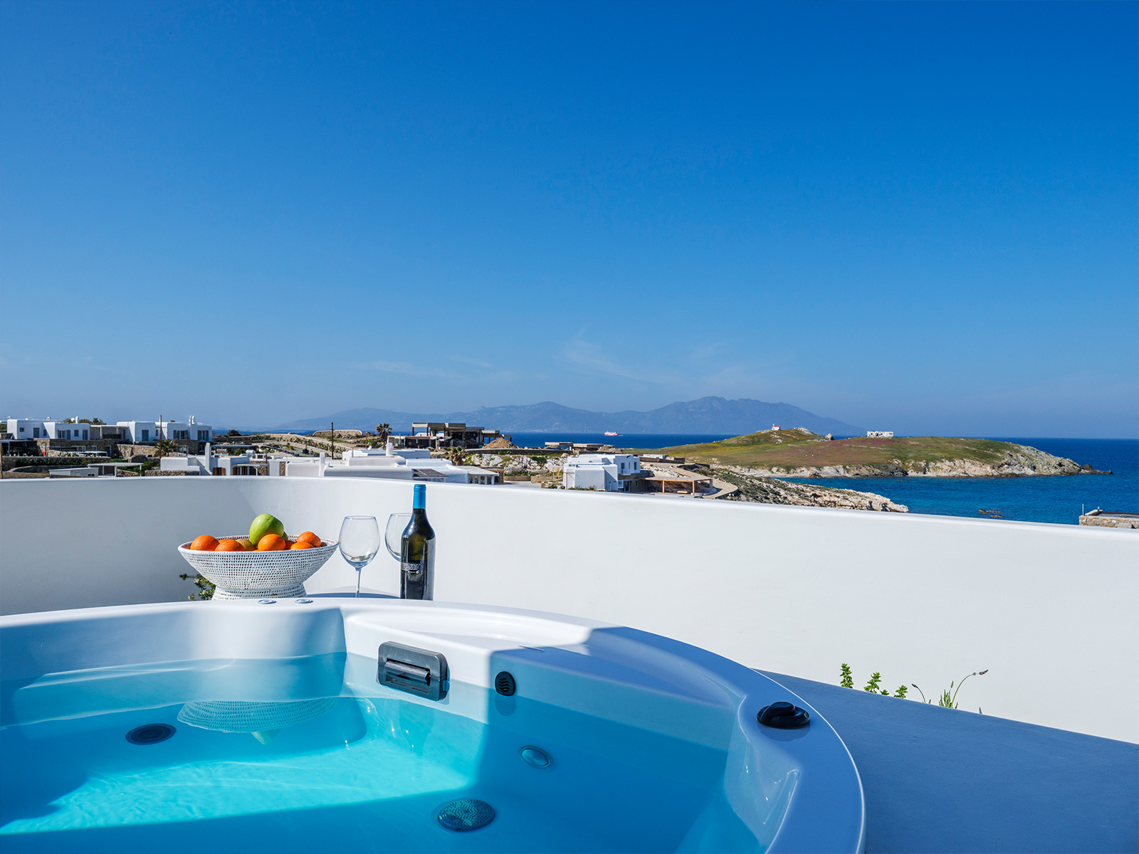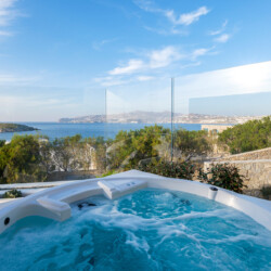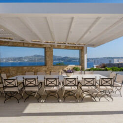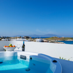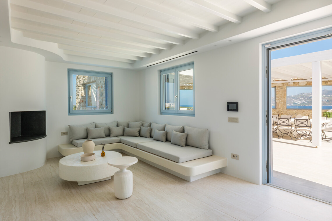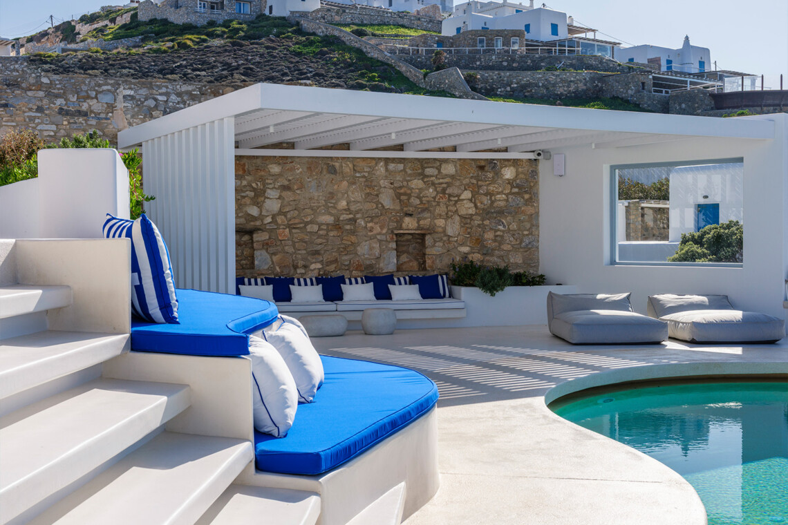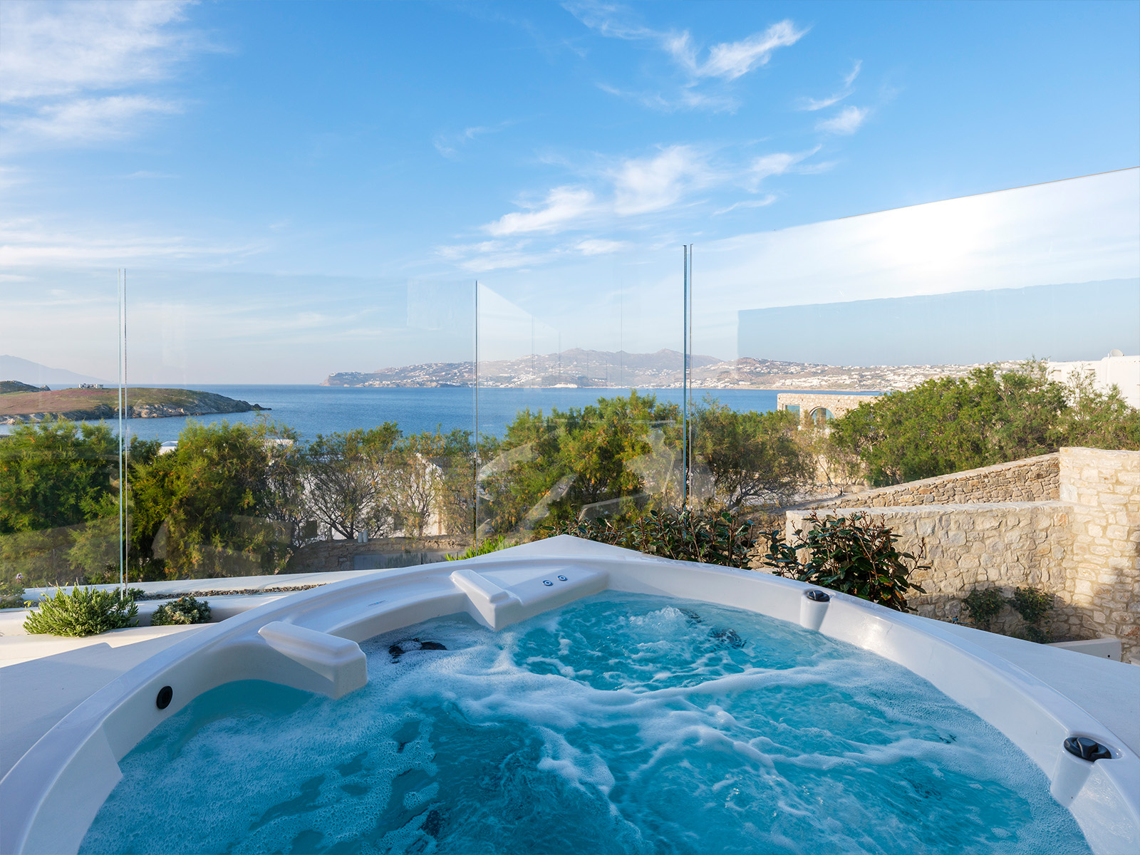 Outdoor living is the heart of the experience, with a private pool overlooking the bay, a sunset lounge, and a fully equipped al fresco dining area featuring a BBQ, wood-fired pizza oven, and a large dining table. A shared panoramic Jacuzzi completes this refined Mykonos retreat, ideal for relaxed gatherings and unforgettable sunsets.