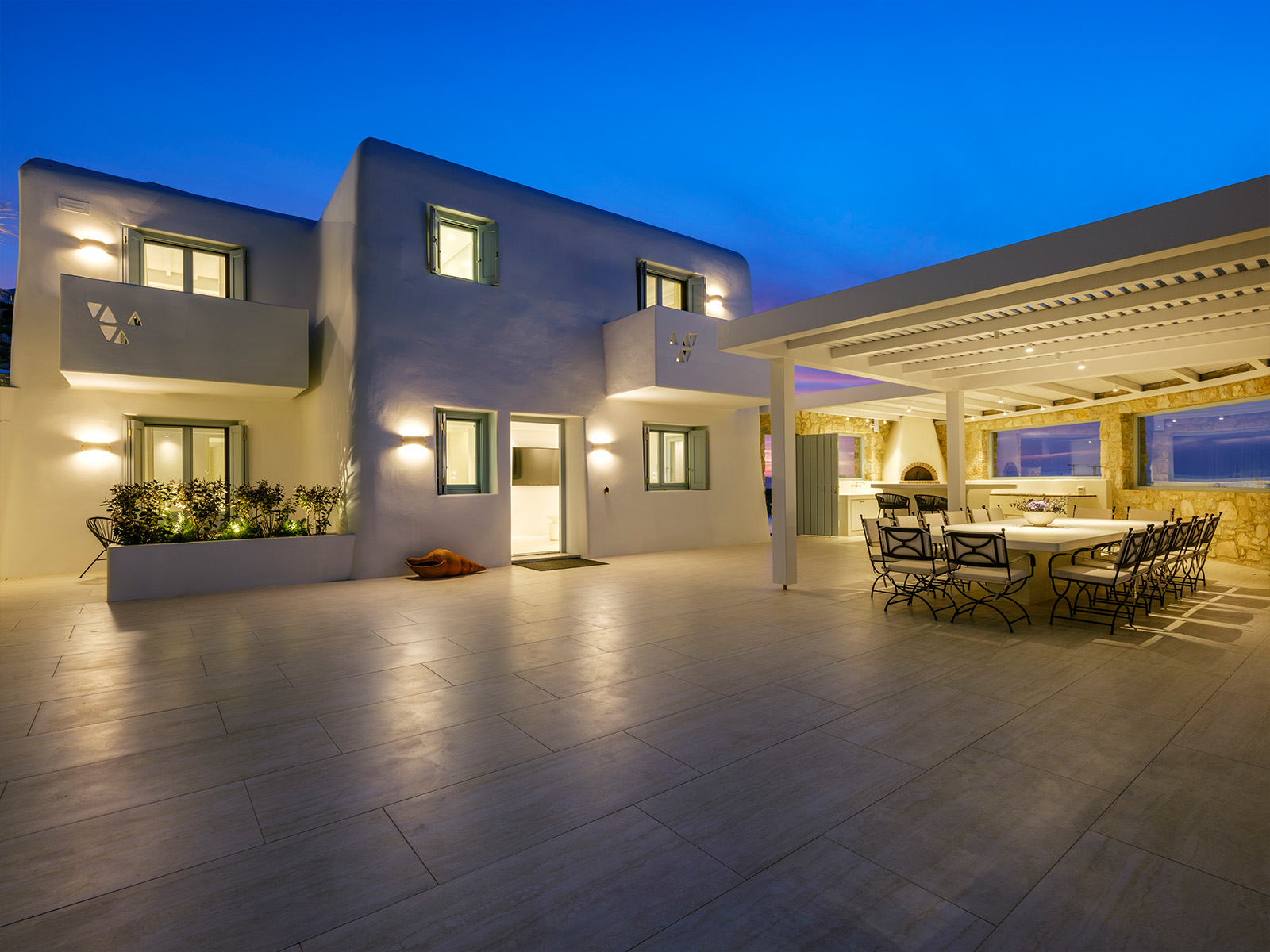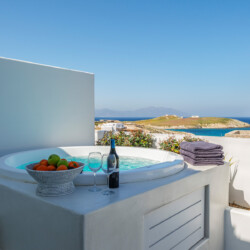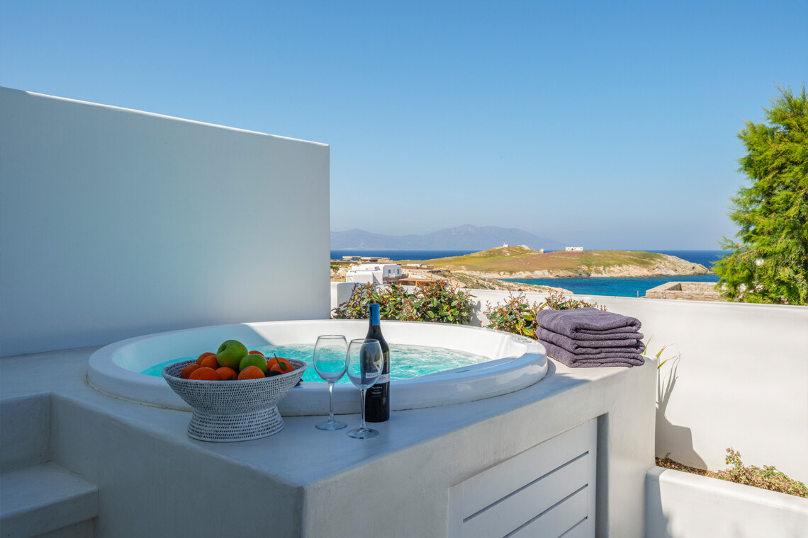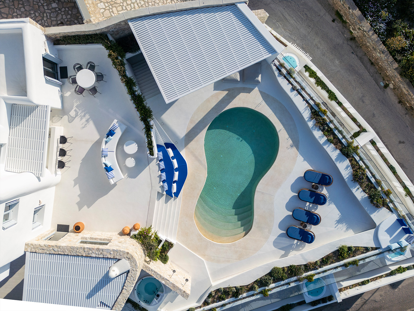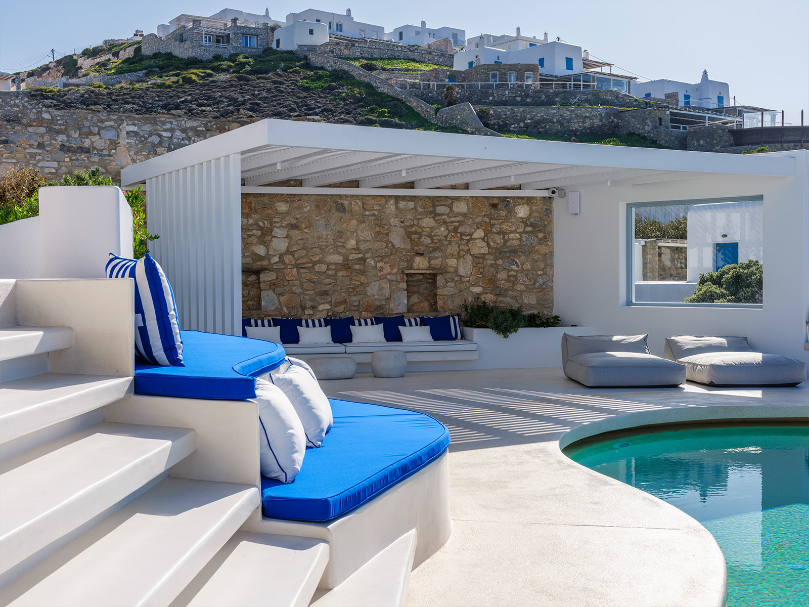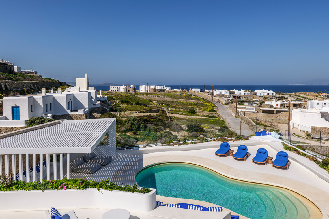 Outdoor living is the heart of the experience, with a private pool overlooking the bay, a sunset lounge, and a fully equipped al fresco dining area featuring a BBQ, wood-fired pizza oven, and a large dining table. A shared panoramic Jacuzzi completes this refined Mykonos retreat, ideal for relaxed gatherings and unforgettable sunsets.