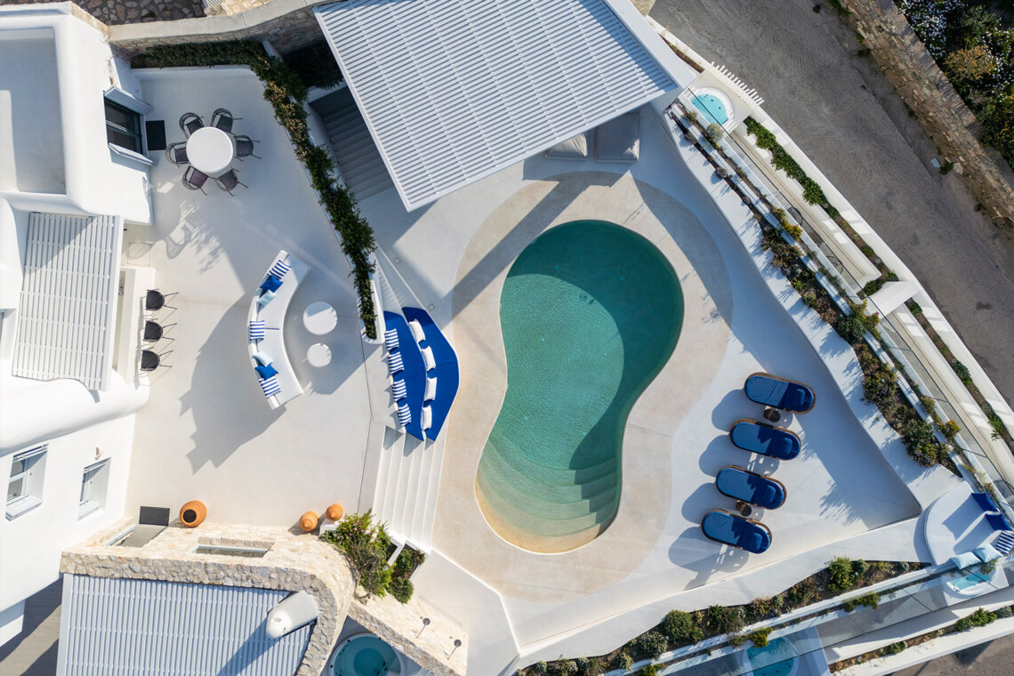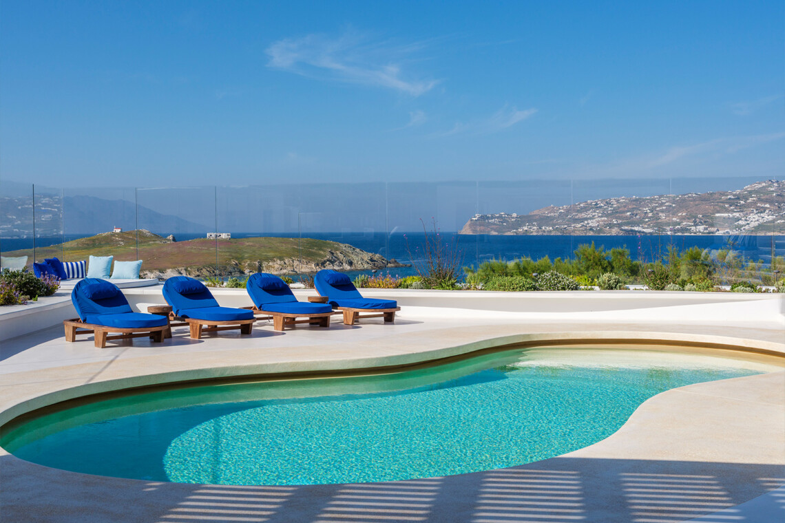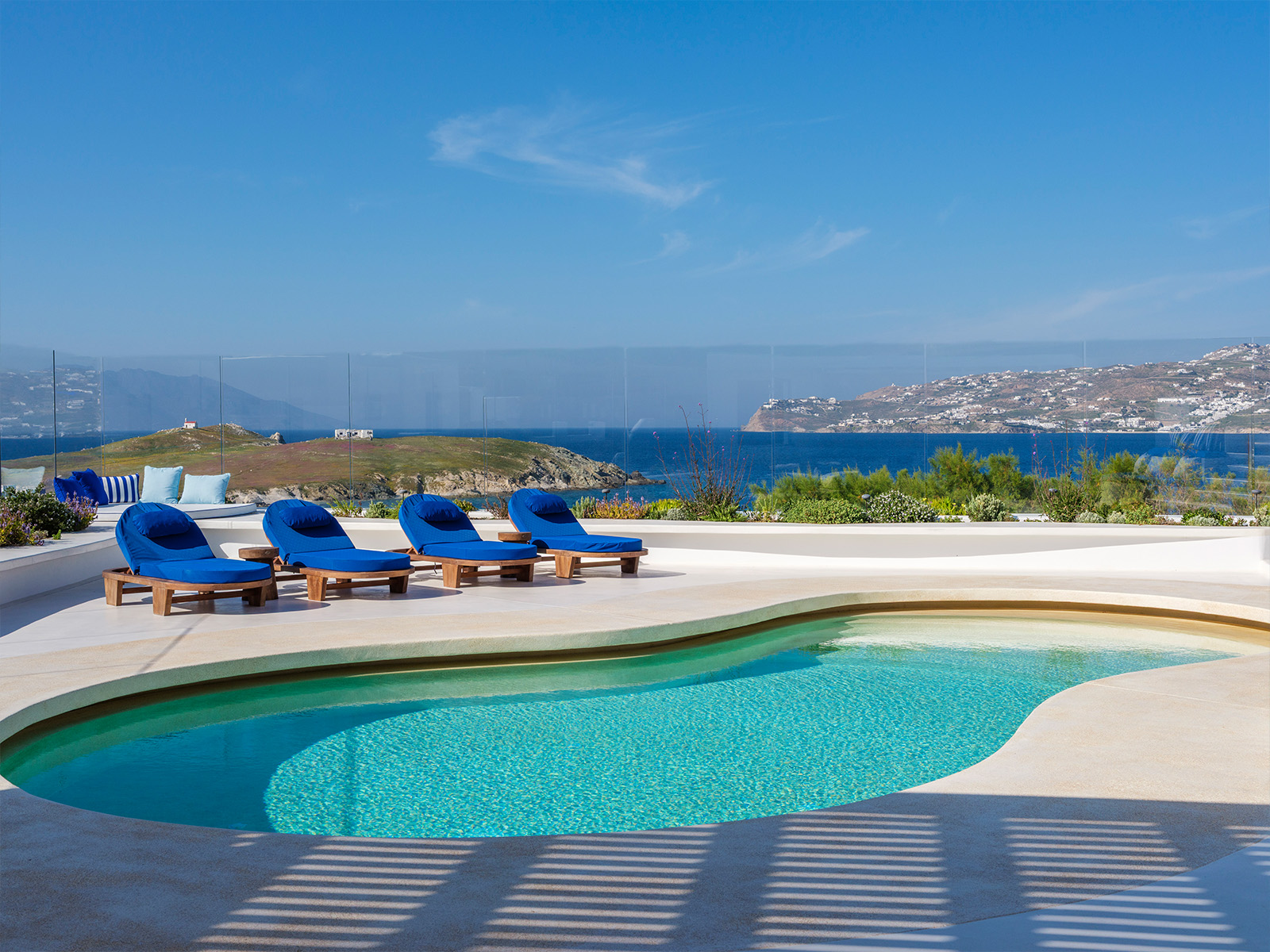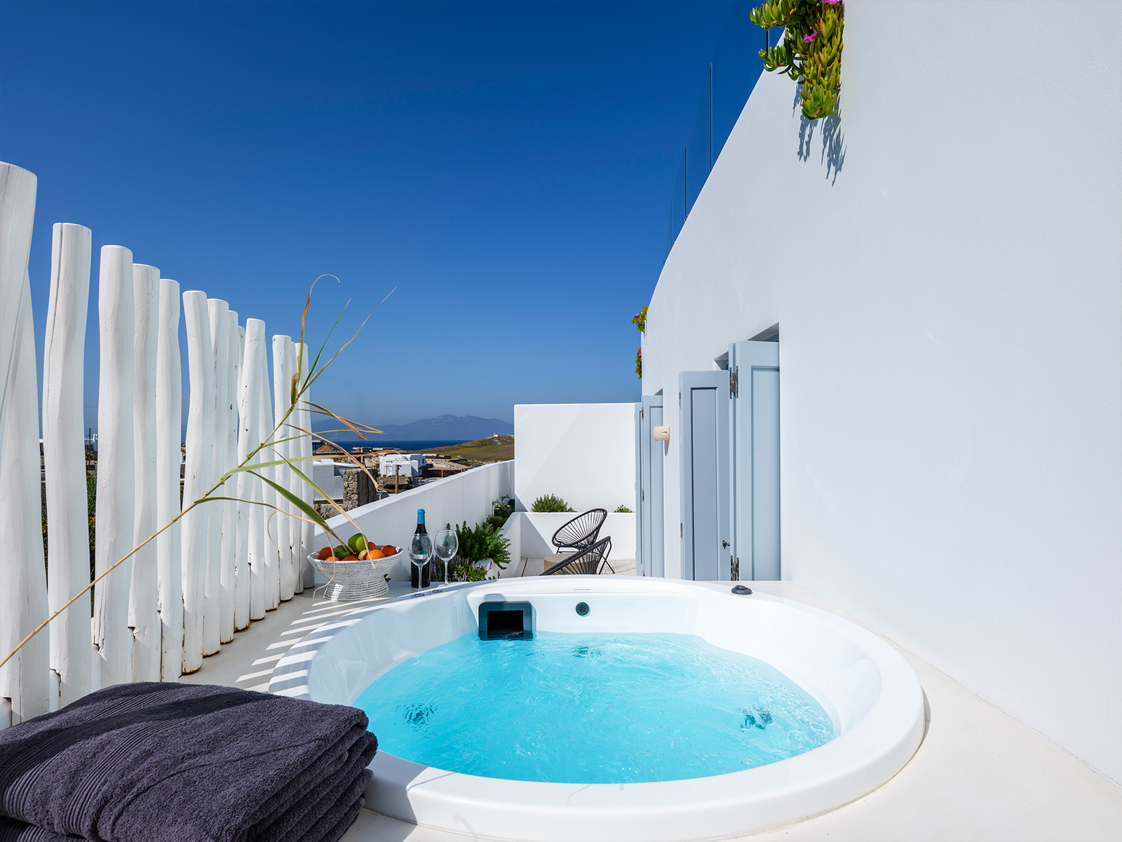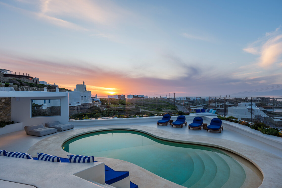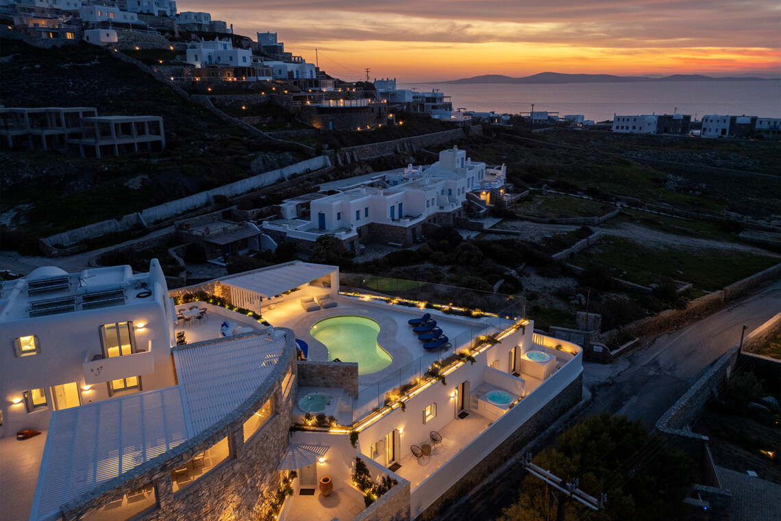 Outdoor living is the heart of the experience, with a private pool overlooking the bay, a sunset lounge, and a fully equipped al fresco dining area featuring a BBQ, wood-fired pizza oven, and a large dining table. A shared panoramic Jacuzzi completes this refined Mykonos retreat, ideal for relaxed gatherings and unforgettable sunsets.