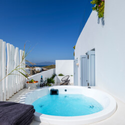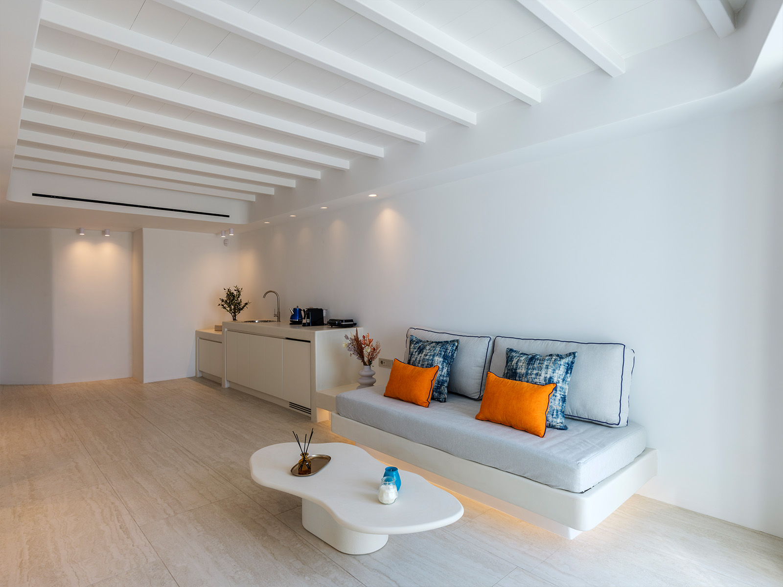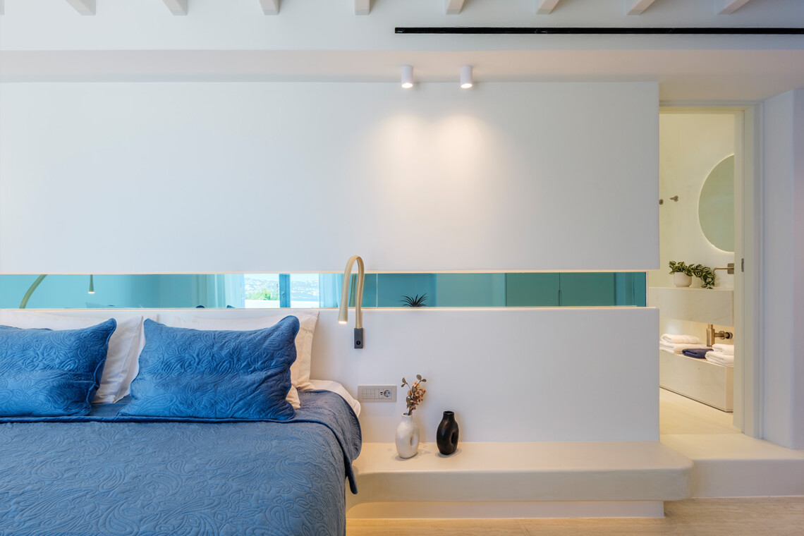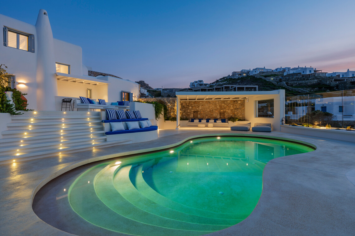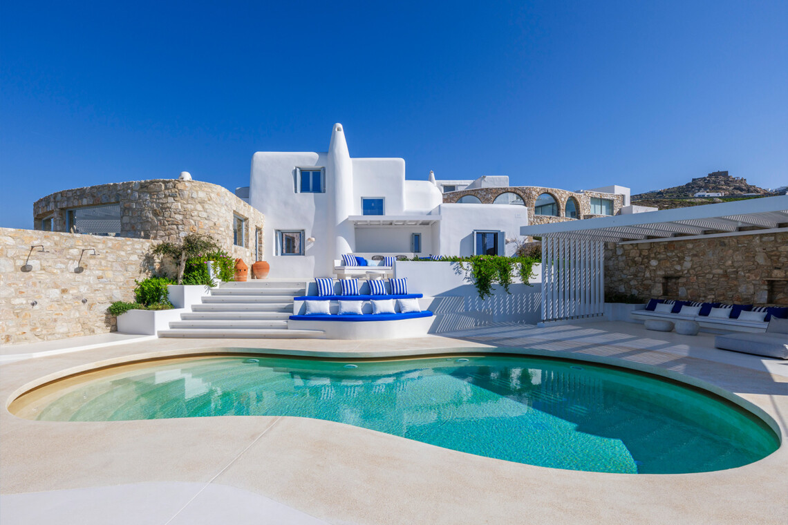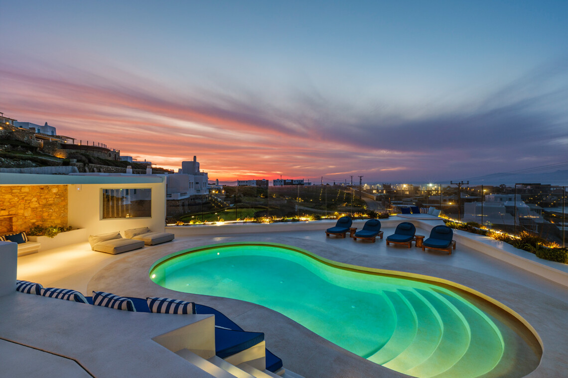 Outdoor living is the heart of the experience, with a private pool overlooking the bay, a sunset lounge, and a fully equipped al fresco dining area featuring a BBQ, wood-fired pizza oven, and a large dining table. A shared panoramic Jacuzzi completes this refined Mykonos retreat, ideal for relaxed gatherings and unforgettable sunsets.