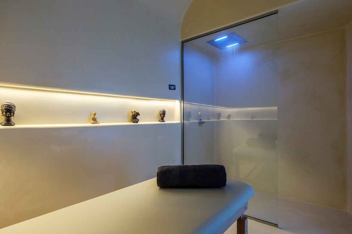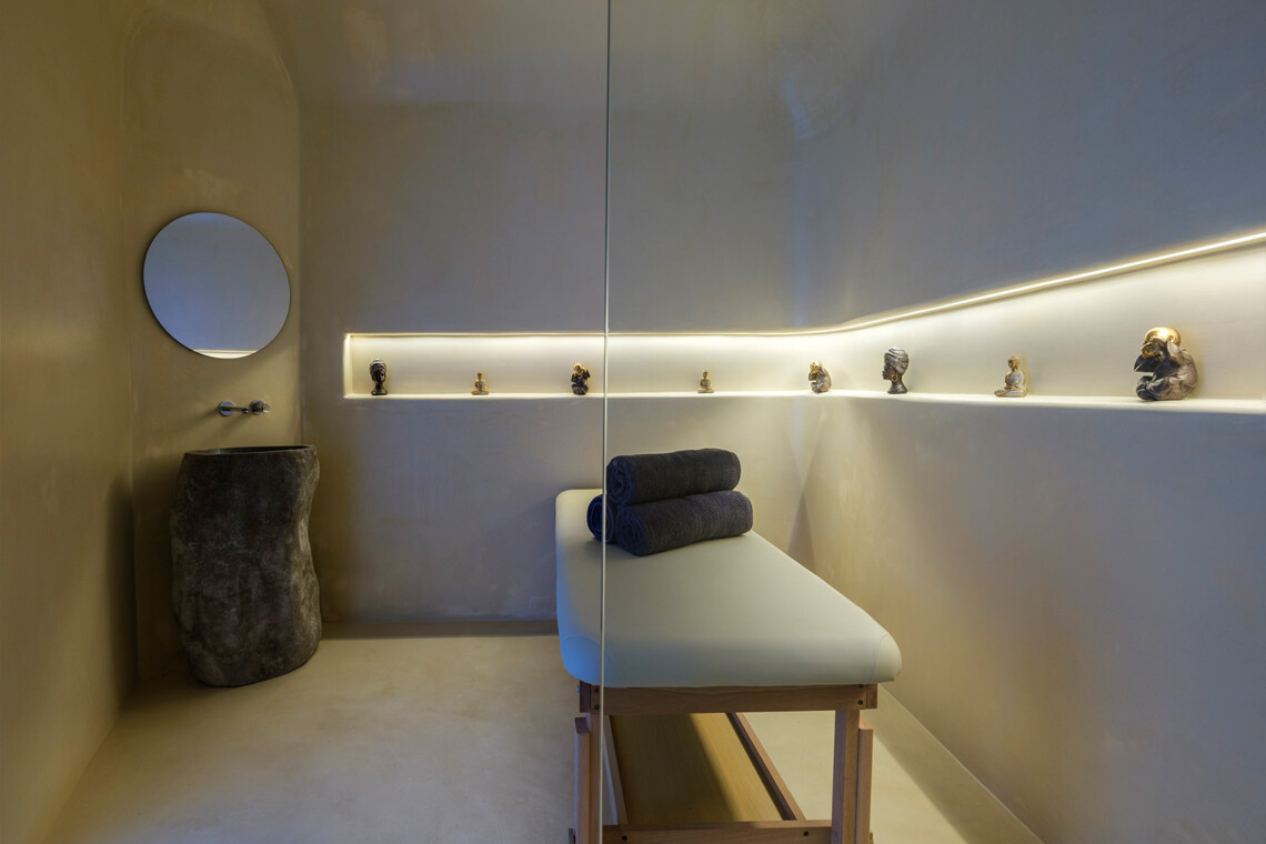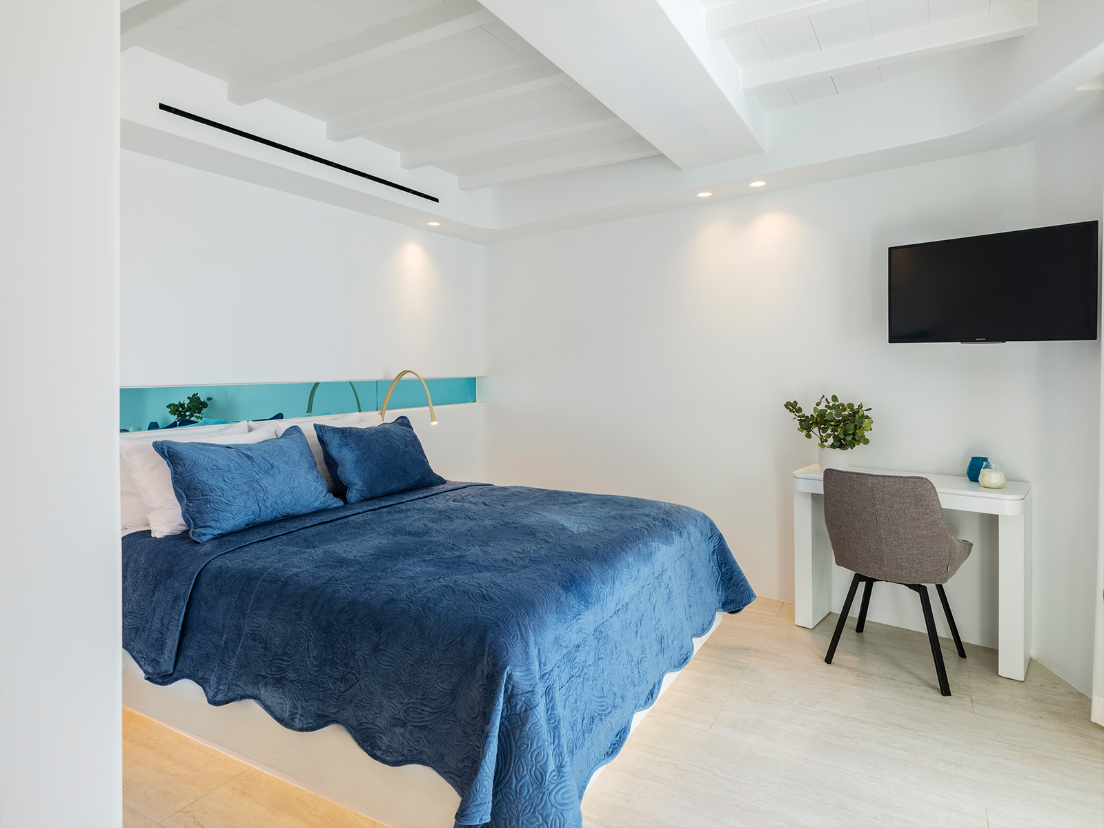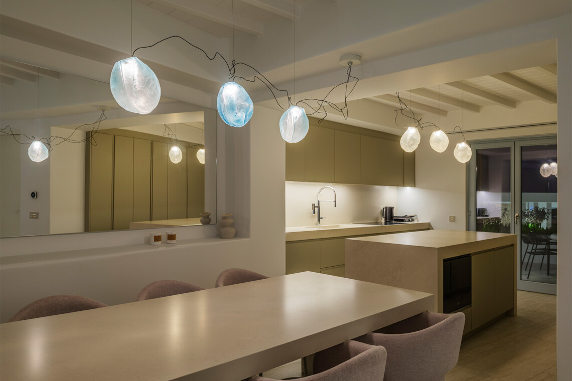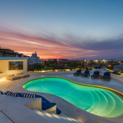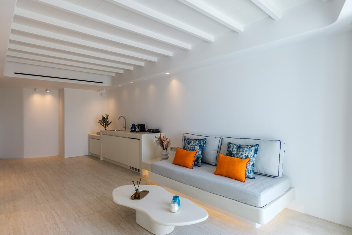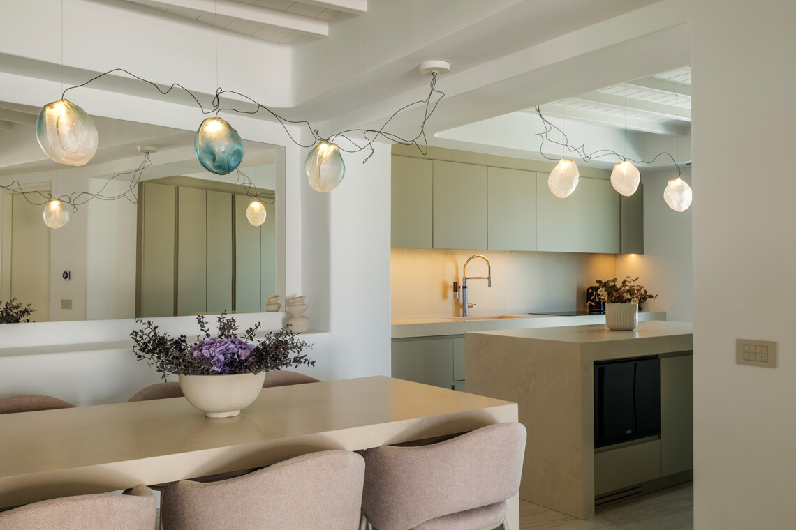 Outdoor living is the heart of the experience, with a private pool overlooking the bay, a sunset lounge, and a fully equipped al fresco dining area featuring a BBQ, wood-fired pizza oven, and a large dining table. A shared panoramic Jacuzzi completes this refined Mykonos retreat, ideal for relaxed gatherings and unforgettable sunsets.