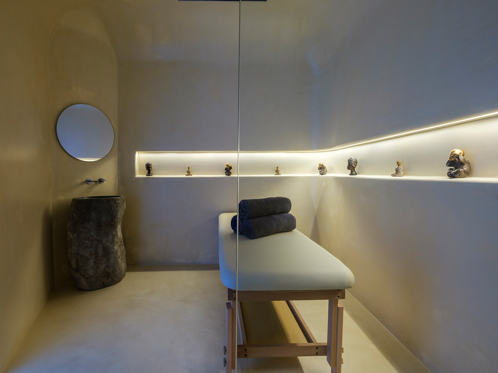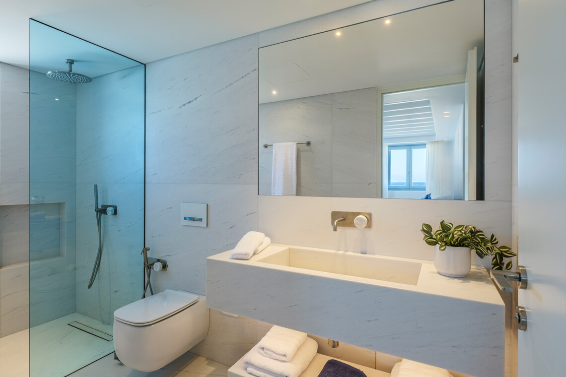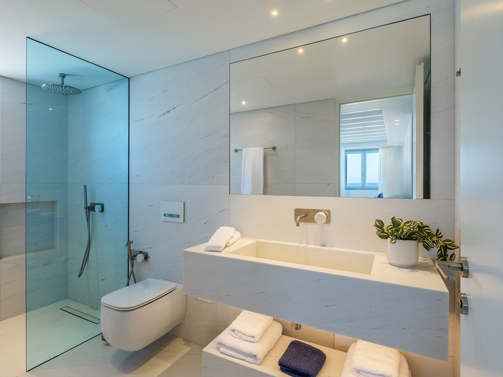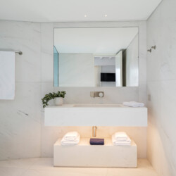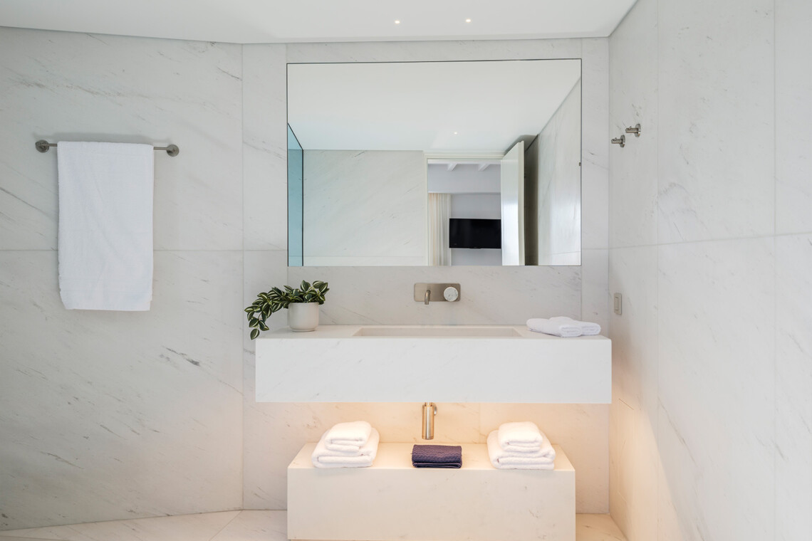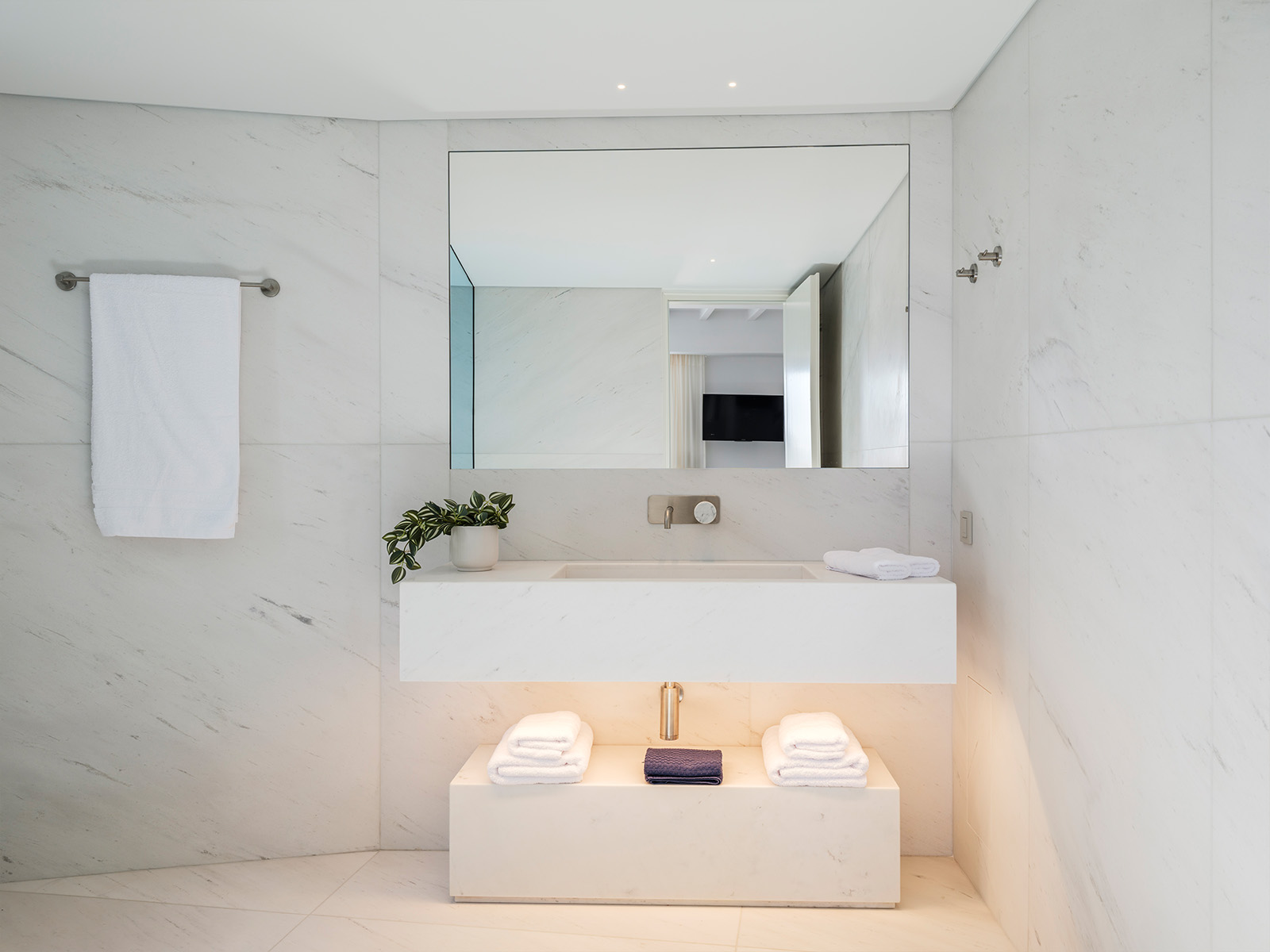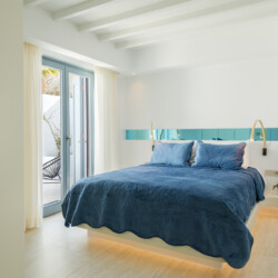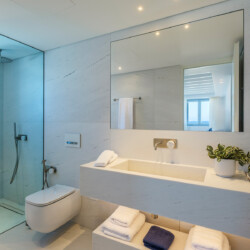 The villa accommodates up to 15 guests across six en-suite bedrooms and three independent guest suites, all featuring Coco-Mat beds and marble bathrooms. The main house includes an elegant open-plan living area and a fully equipped designer kitchen, while the detached suites each offer private entrances, outdoor patios, and private Jacuzzis with sea views.