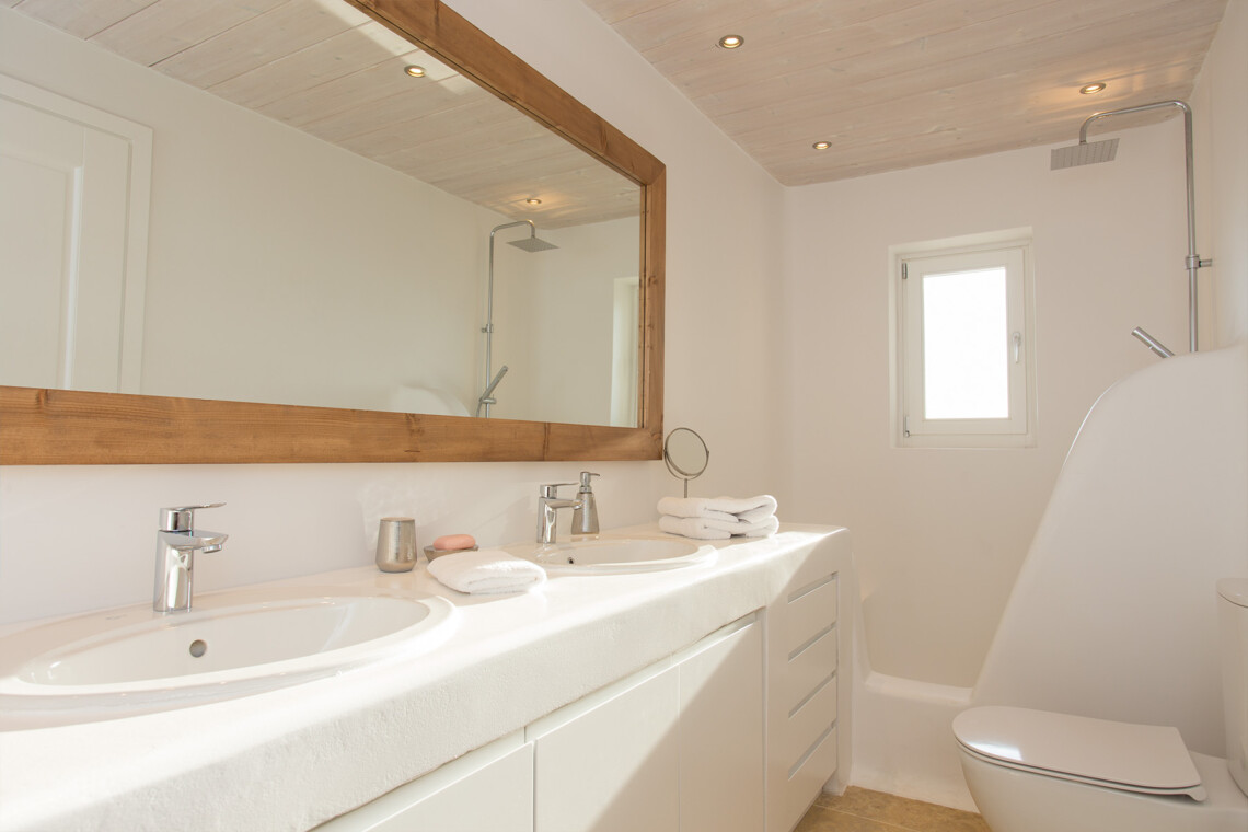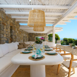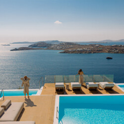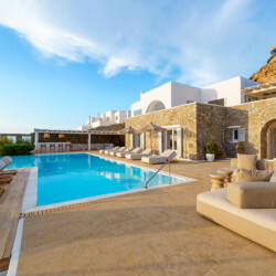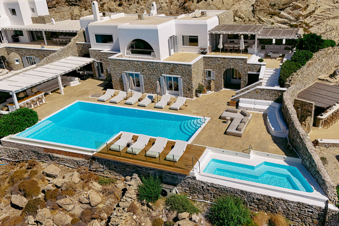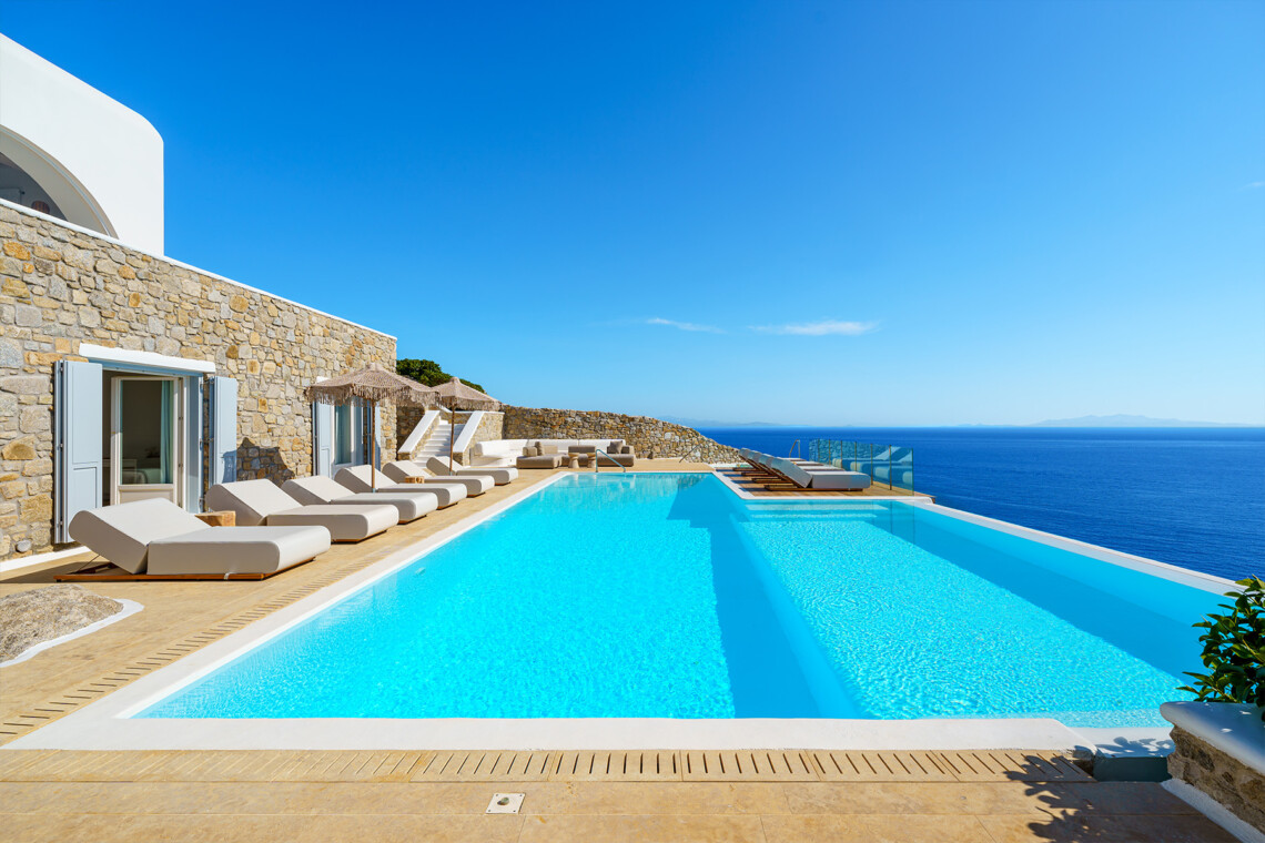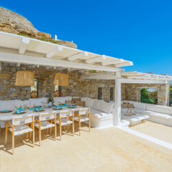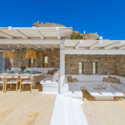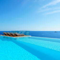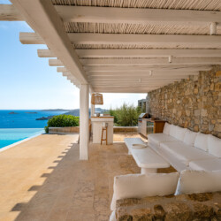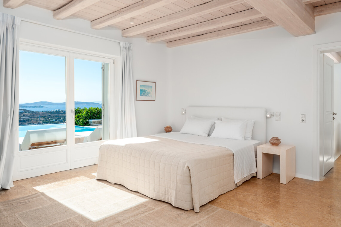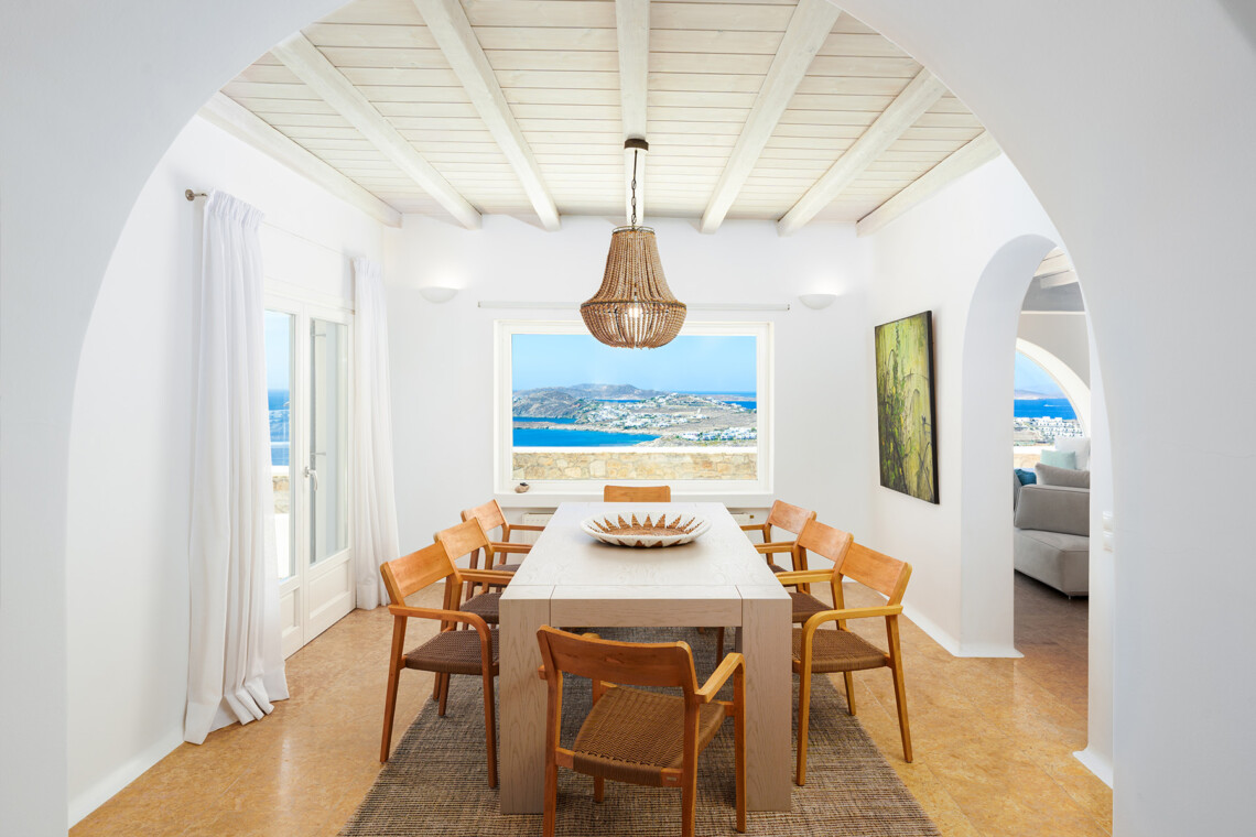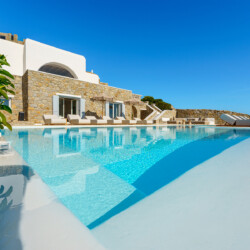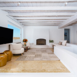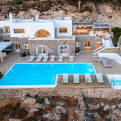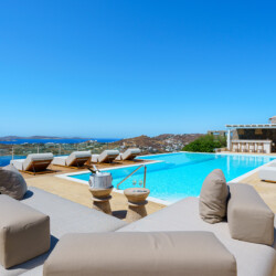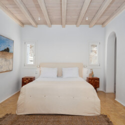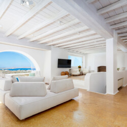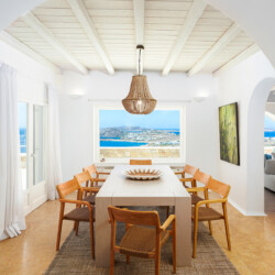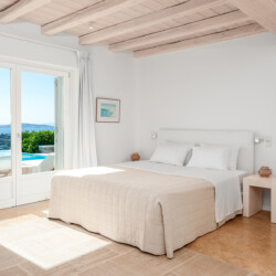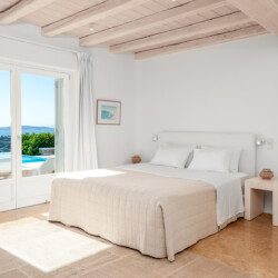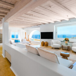 Inside, the elegant interiors are designed with meticulous attention to detail, blending Cycladic architecture with modern aesthetics and contemporary art. The result is a harmonious fusion of style and comfort that perfectly complements the villa’s breathtaking surroundings.