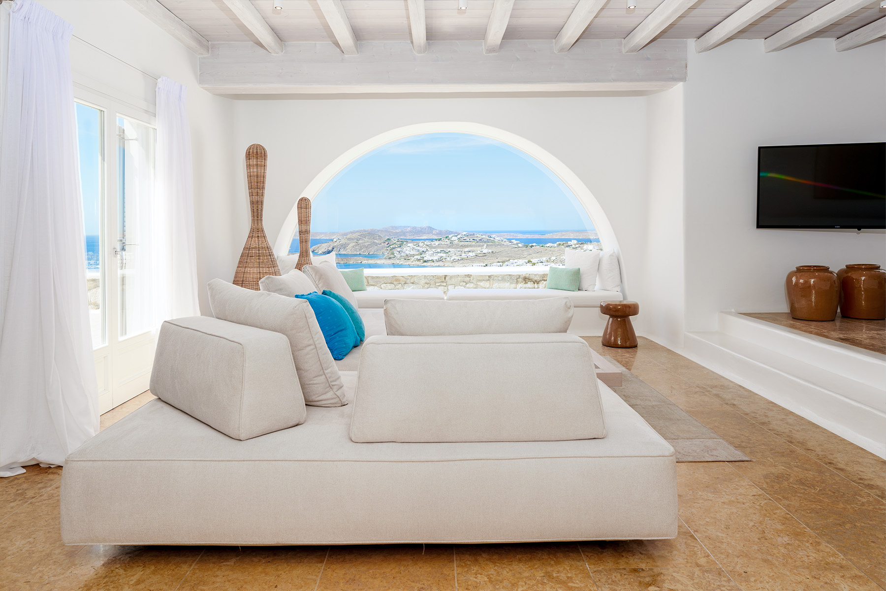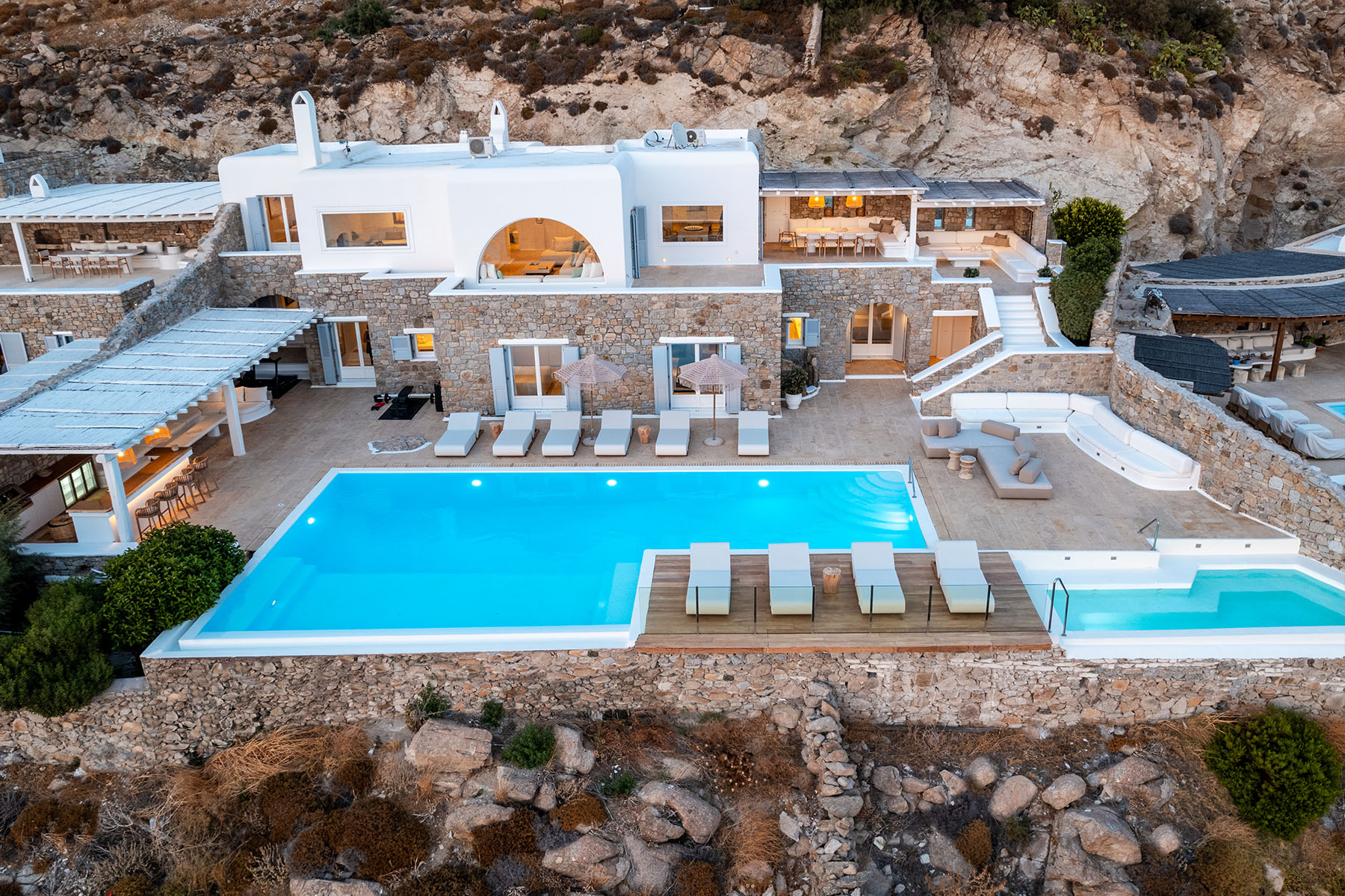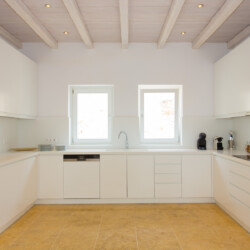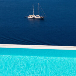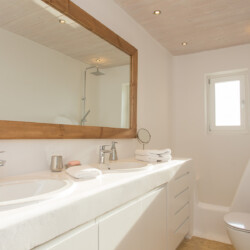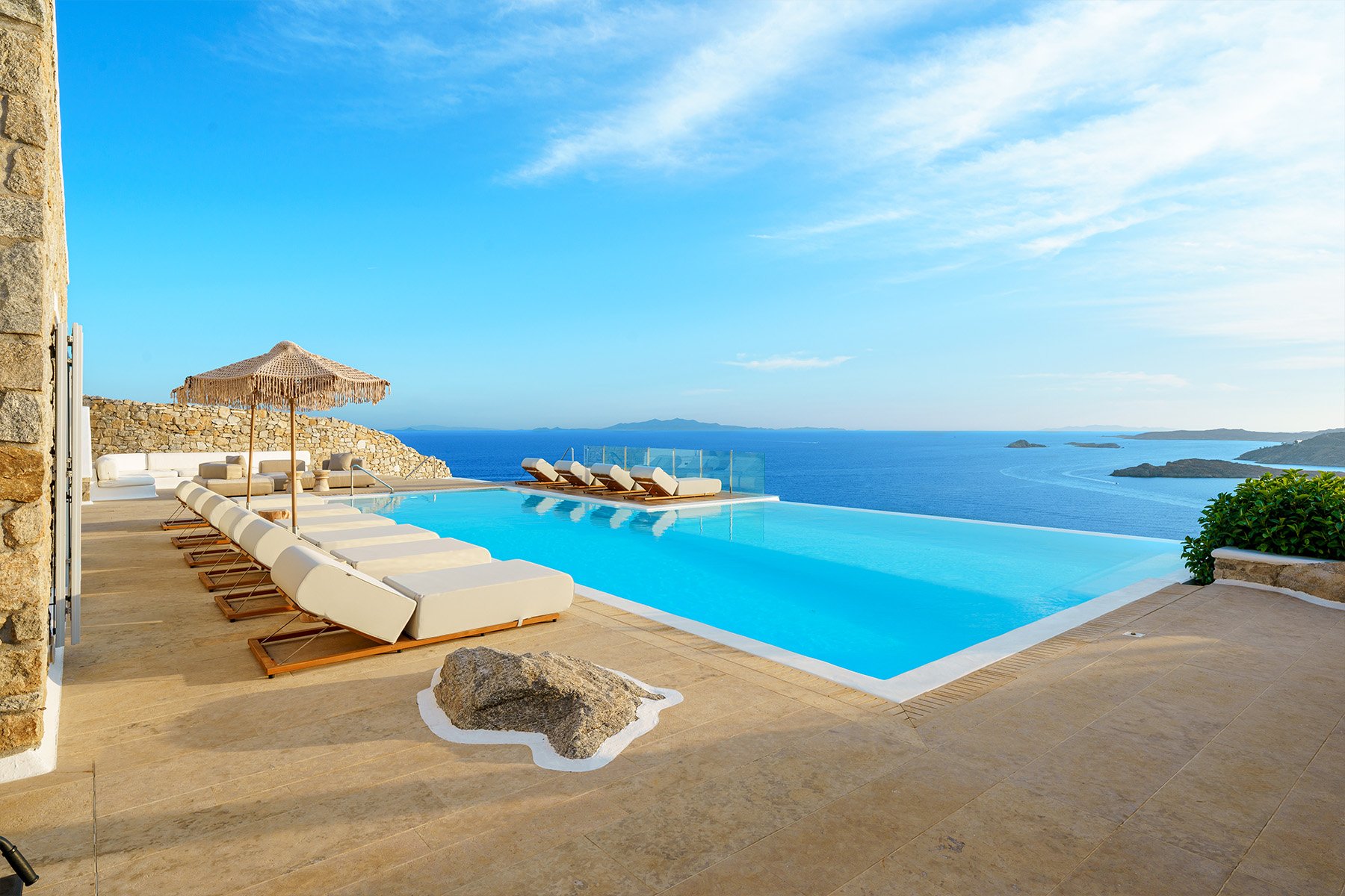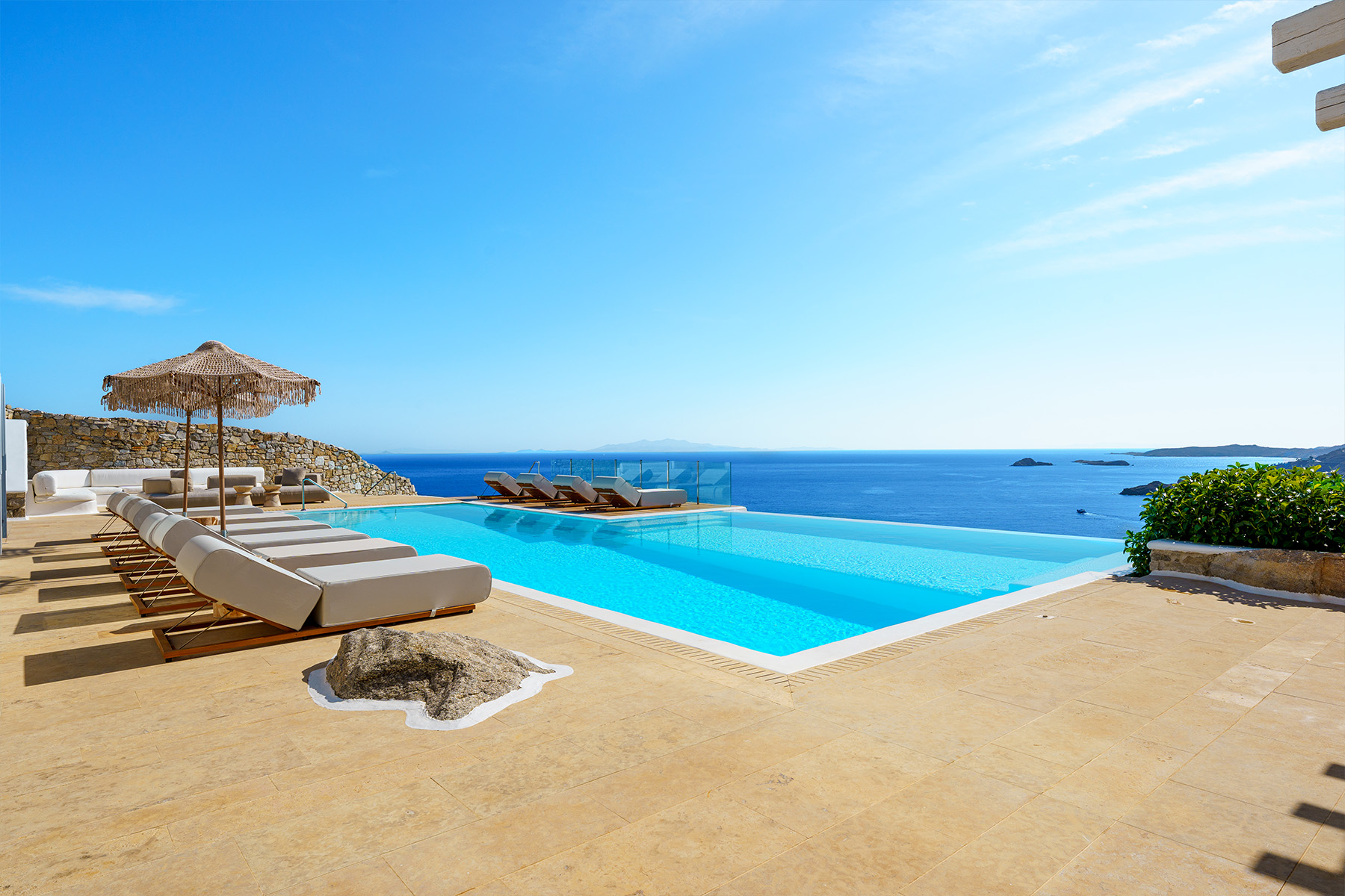 Inside, the elegant interiors are designed with meticulous attention to detail, blending Cycladic architecture with modern aesthetics and contemporary art. The result is a harmonious fusion of style and comfort that perfectly complements the villa’s breathtaking surroundings.