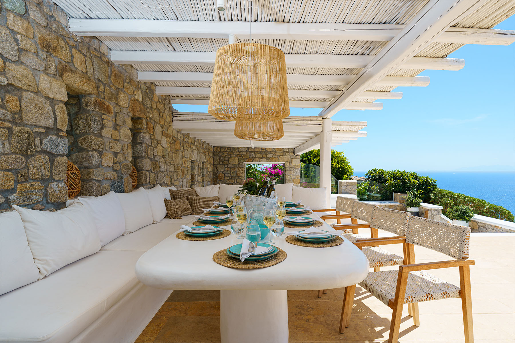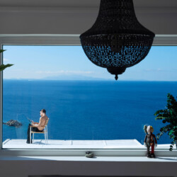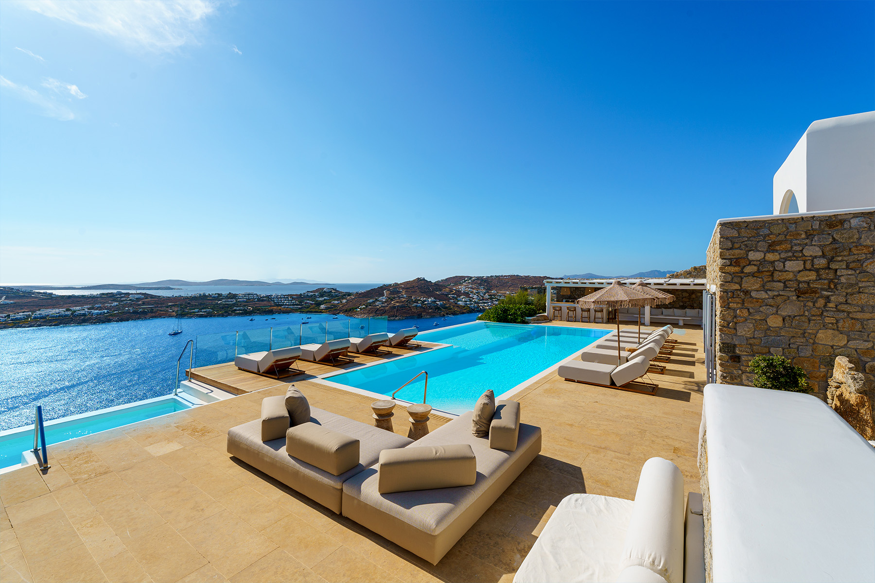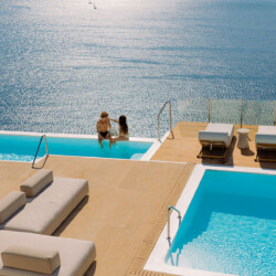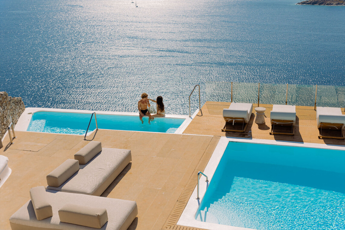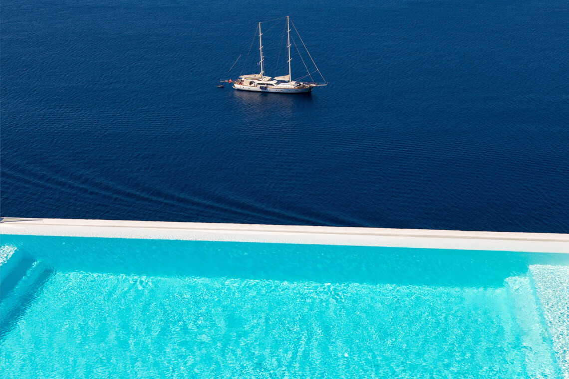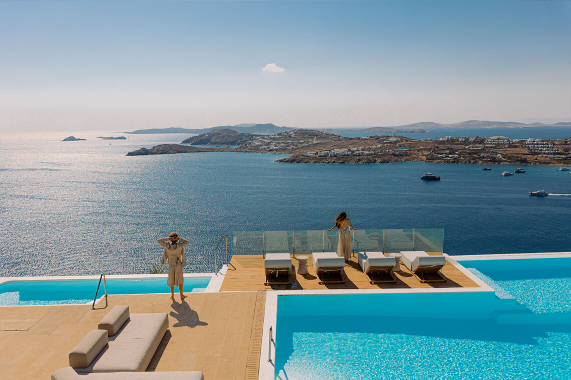 Inside, the elegant interiors are designed with meticulous attention to detail, blending Cycladic architecture with modern aesthetics and contemporary art. The result is a harmonious fusion of style and comfort that perfectly complements the villa’s breathtaking surroundings.