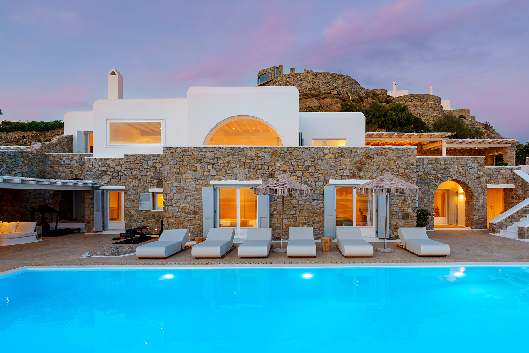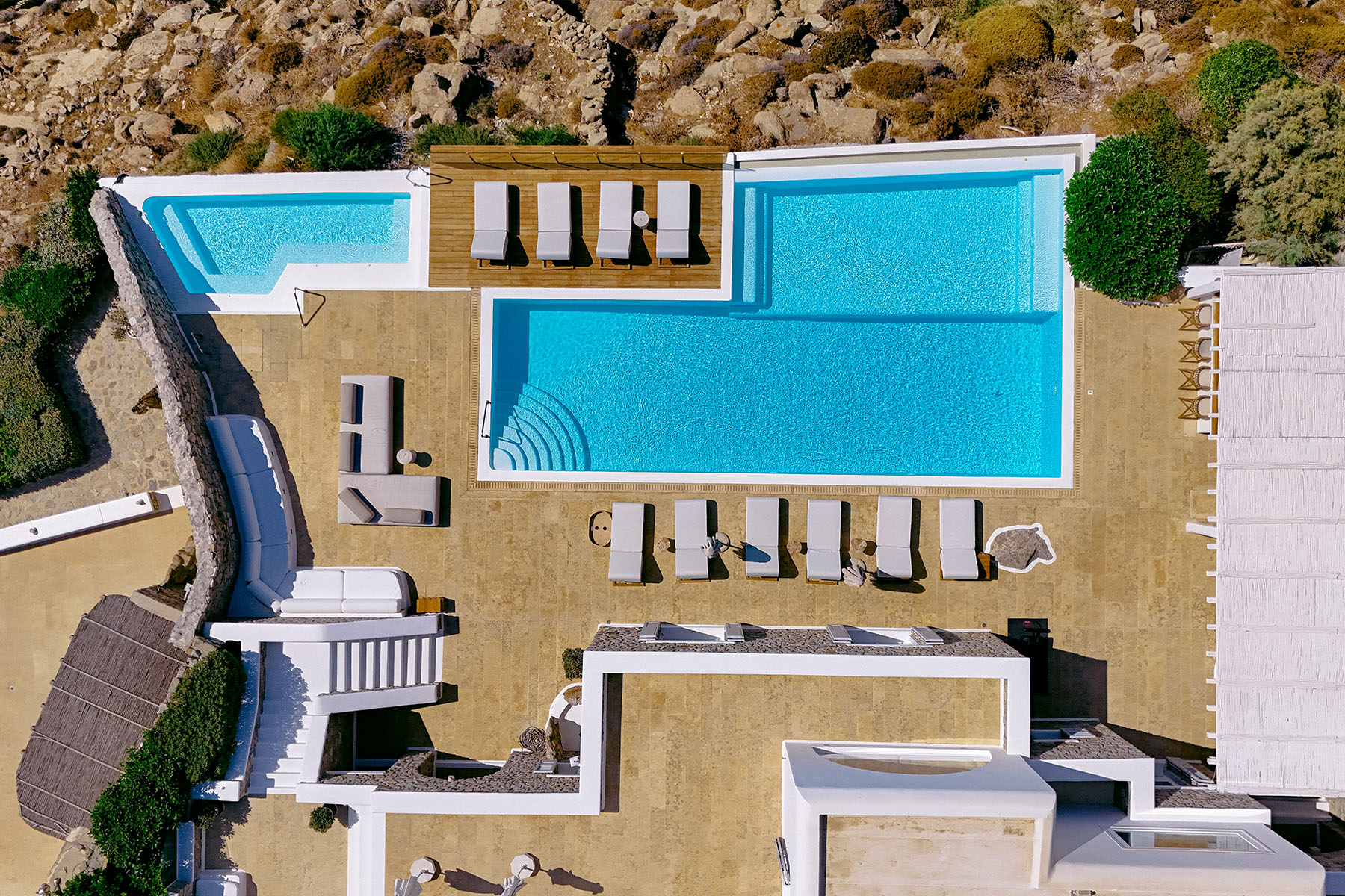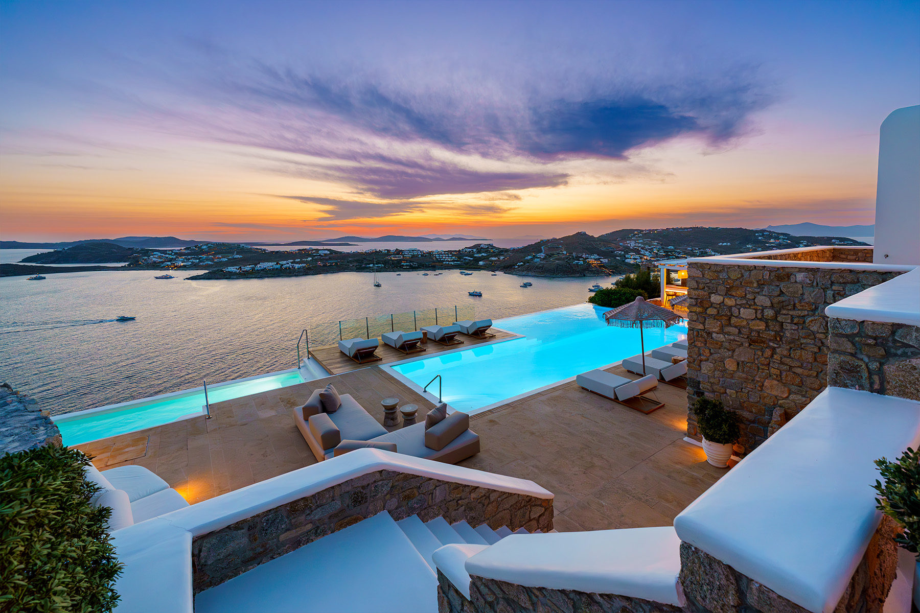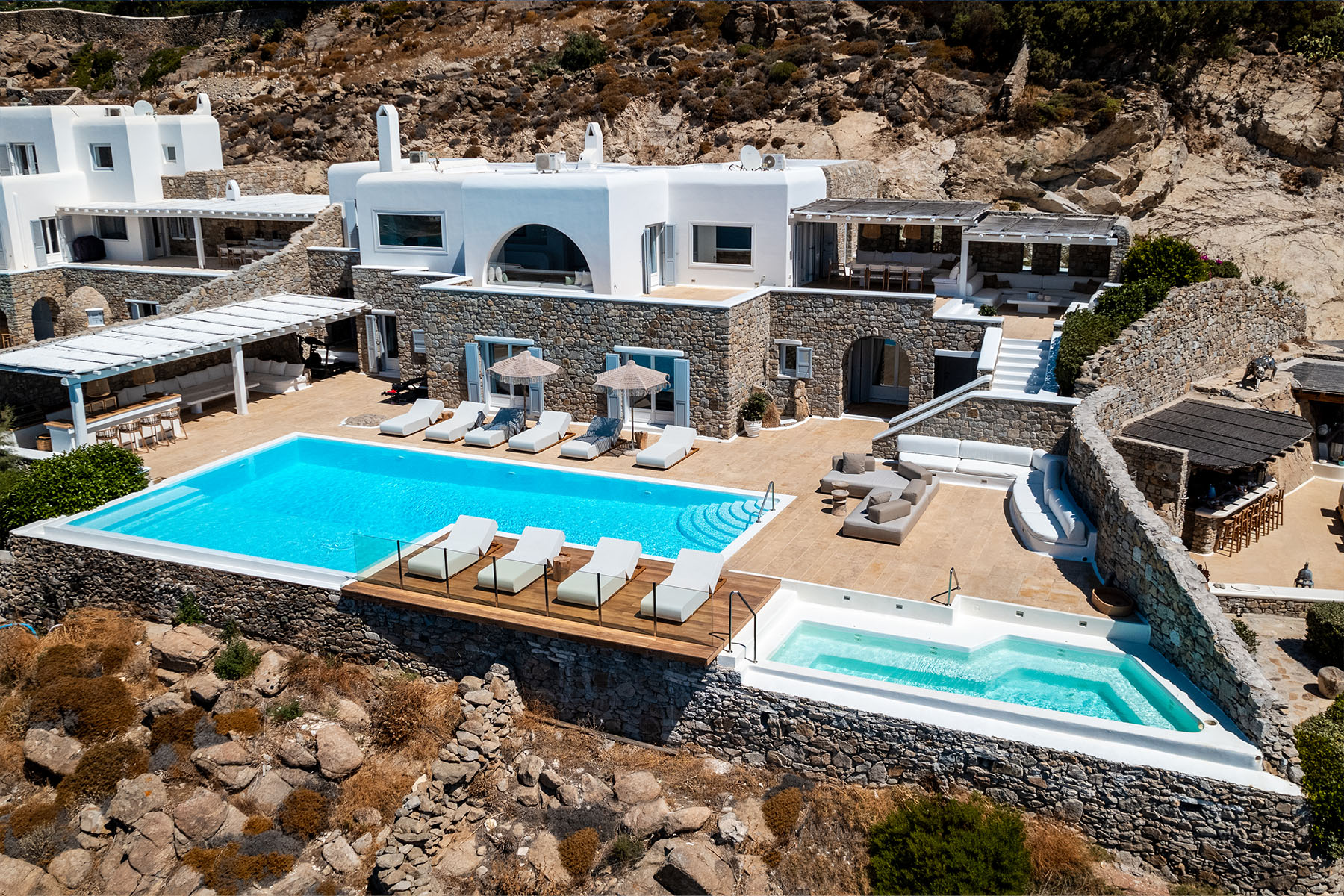 Inside, the elegant interiors are designed with meticulous attention to detail, blending Cycladic architecture with modern aesthetics and contemporary art. The result is a harmonious fusion of style and comfort that perfectly complements the villa’s breathtaking surroundings.