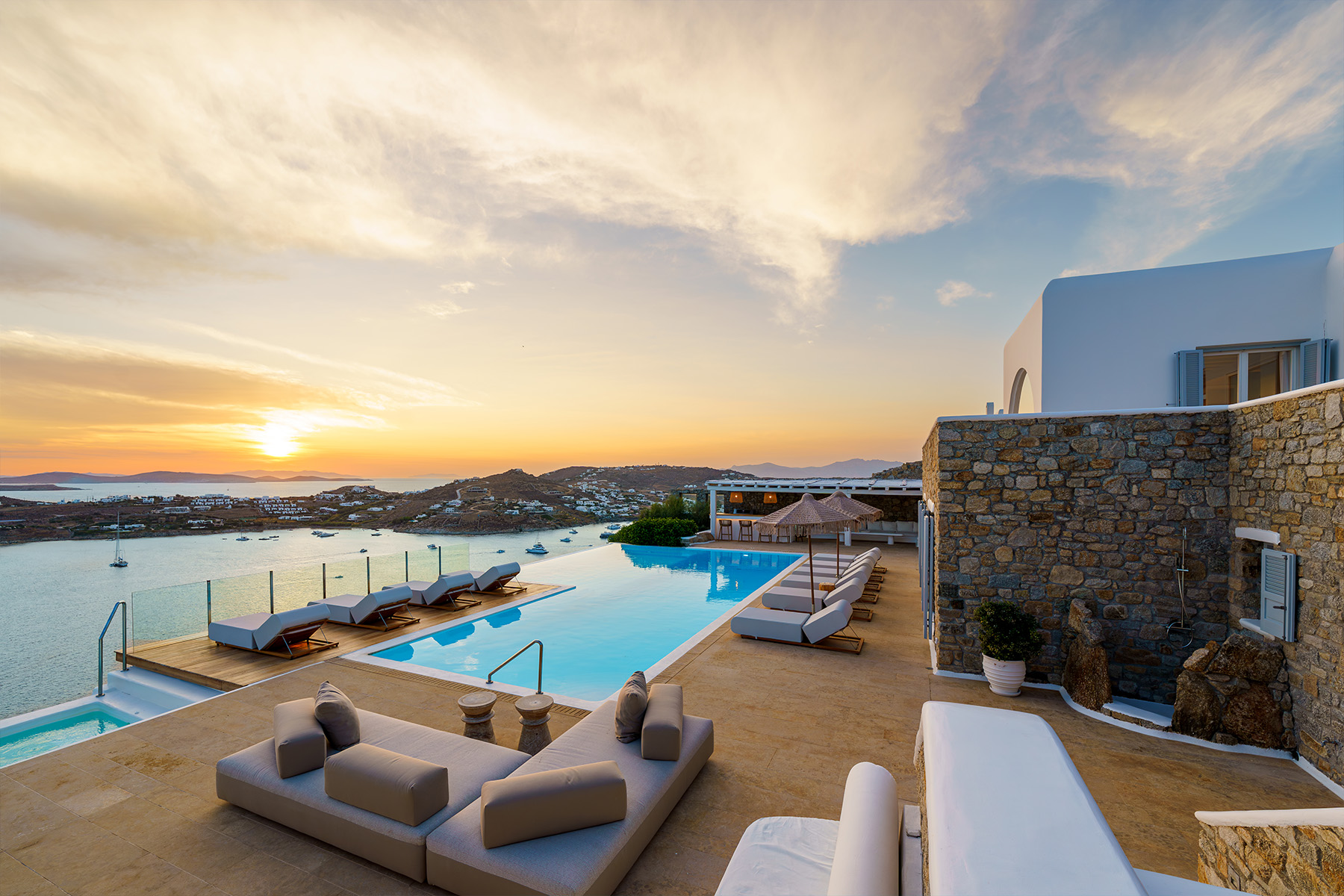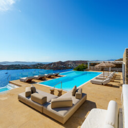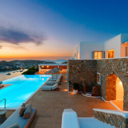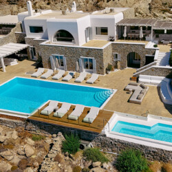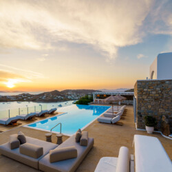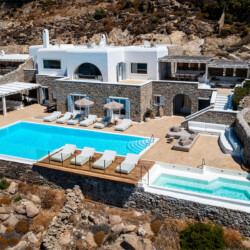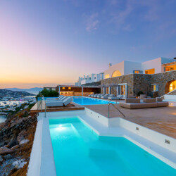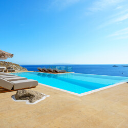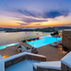 Perched at the edge of a rocky shore in Agios Lazaros, Luxury Villa Kiara offers an unrivaled view of the gulf of Ornos, the Delos and Rinia islands, and the Aegean Sea. Located just minutes from Psarou beach and less than 3 km from the town center, this premium residence is the epitome of luxury and exclusivity.