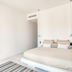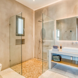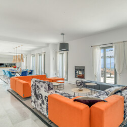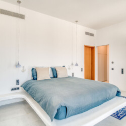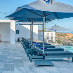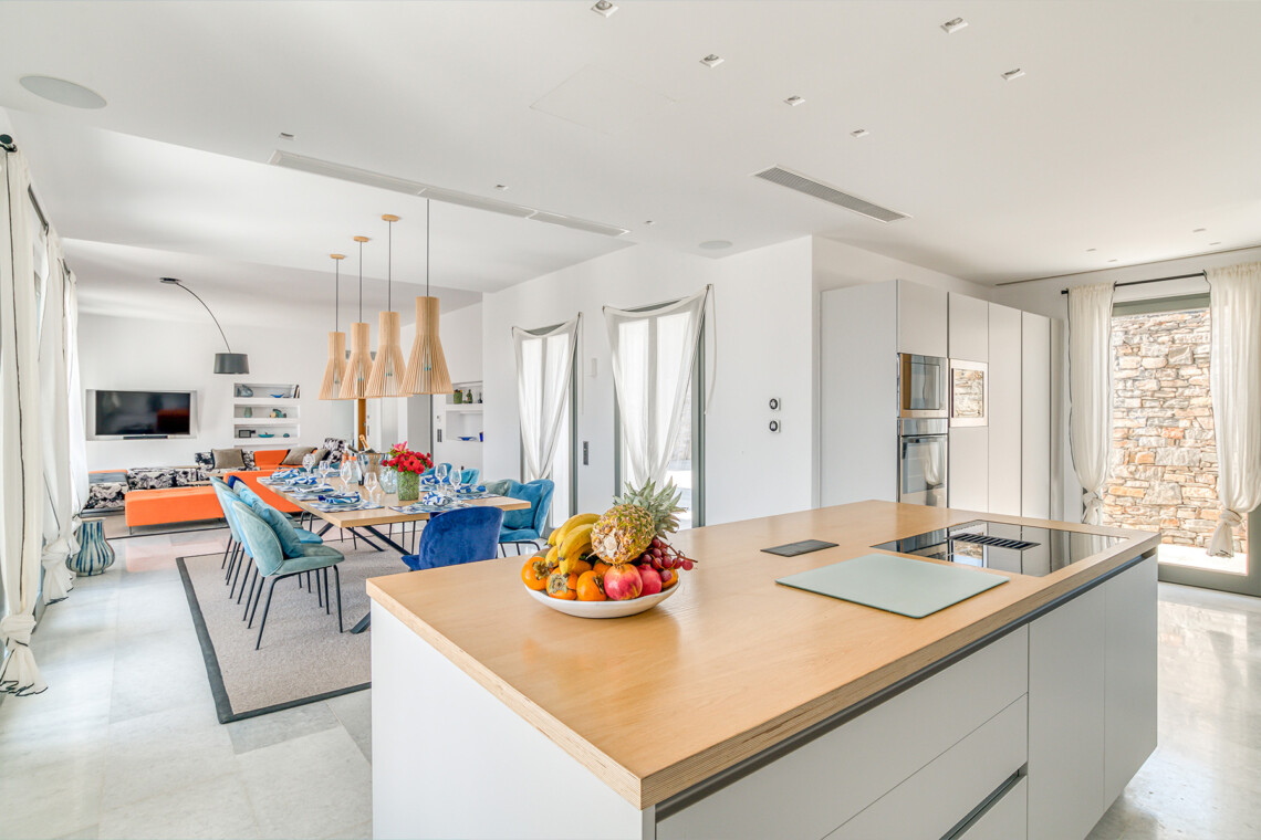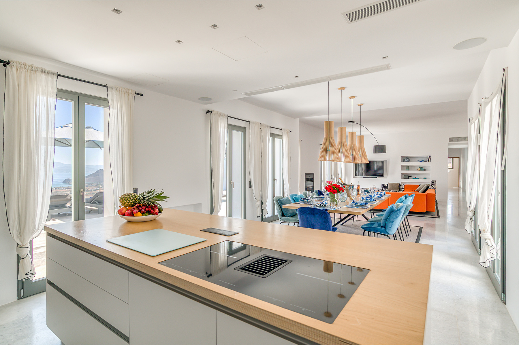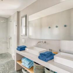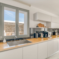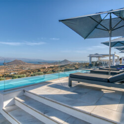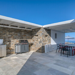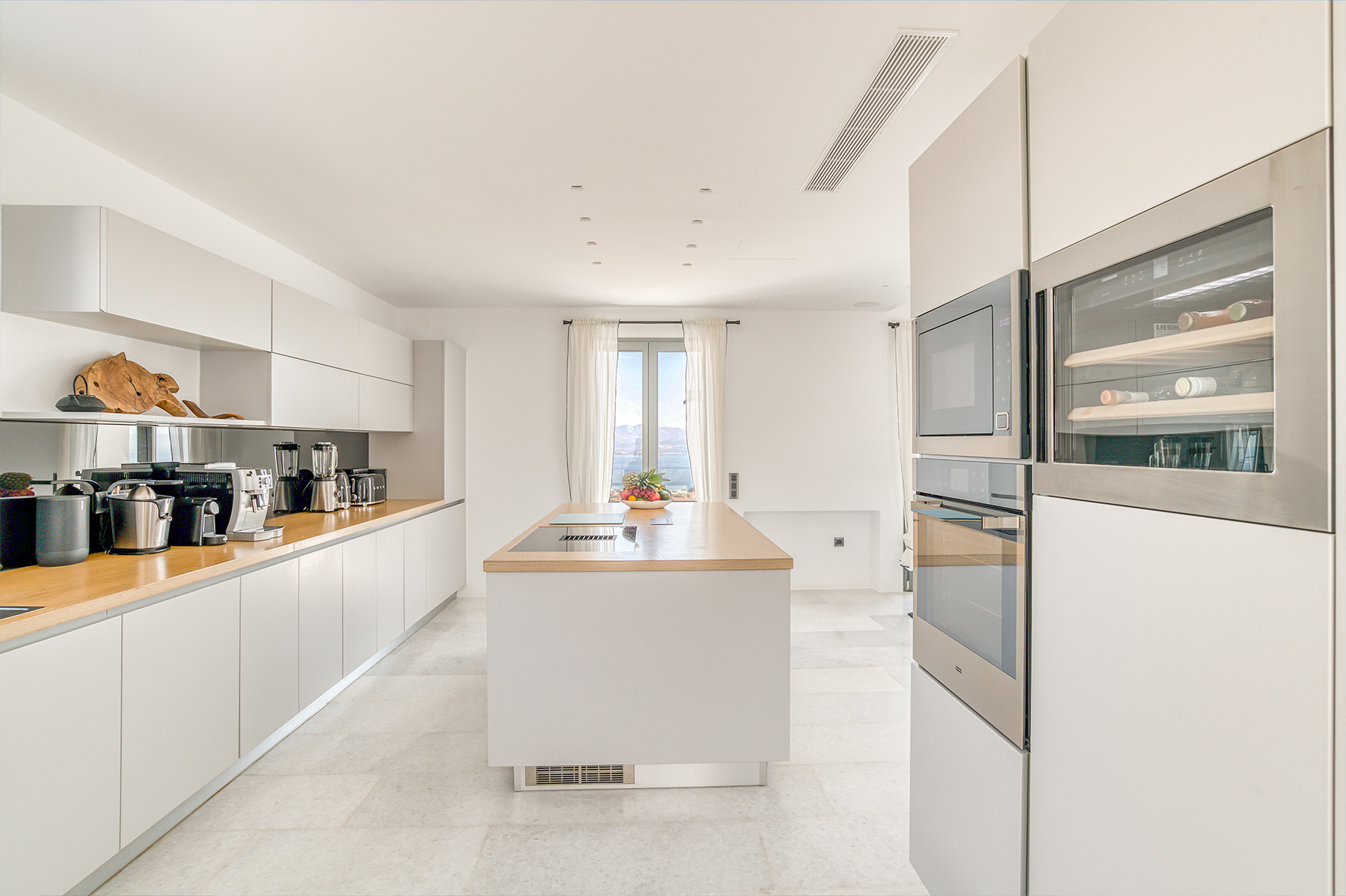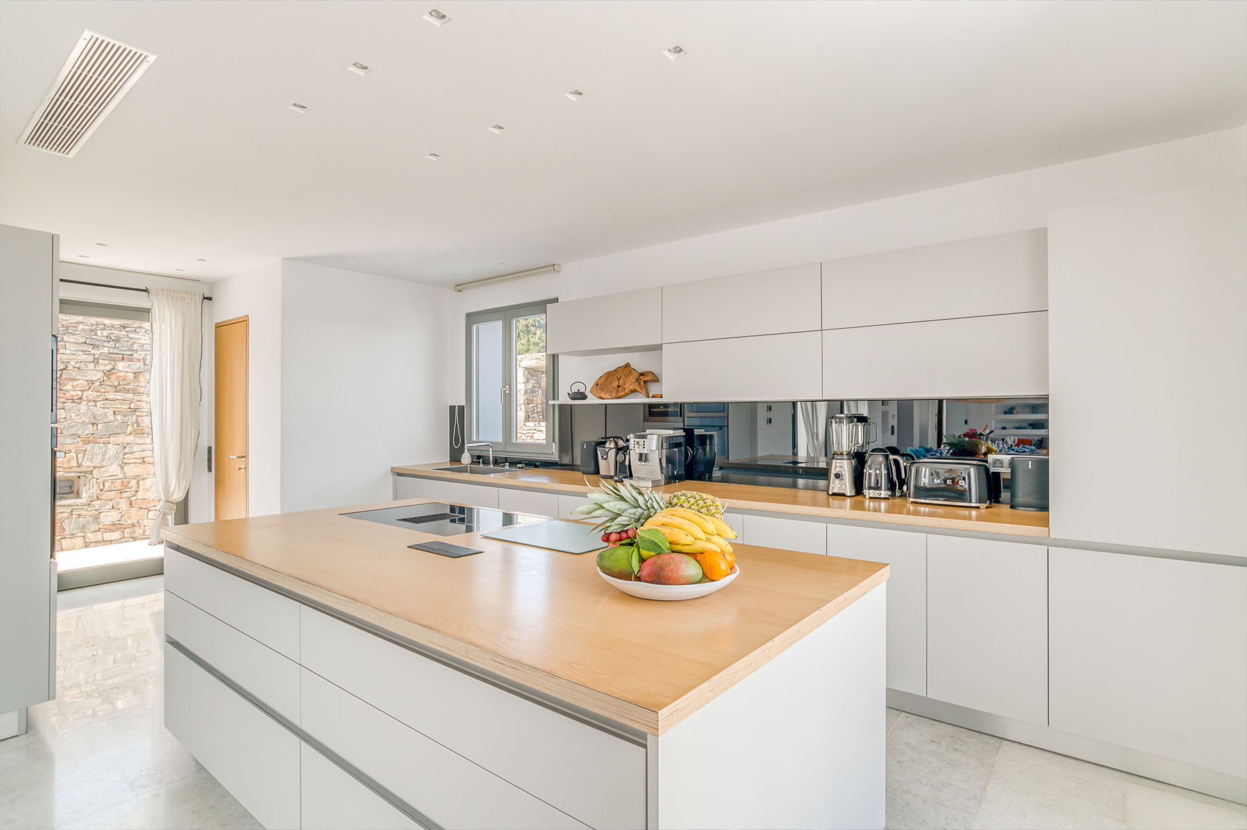 Equipped with a modern kitchen ready for diverse culinary adventures, guests can cook with ease, and the option of a chef can be arranged upon request. Surrounding the villa are expansive terraces with 12 sunbeds and parasols, perfect for relaxation. An equipped bar allows for cocktail-making and delightful aperitifs. The 15m x 4m infinity pool overlooks the sunrise side of the island, providing a stunning view.