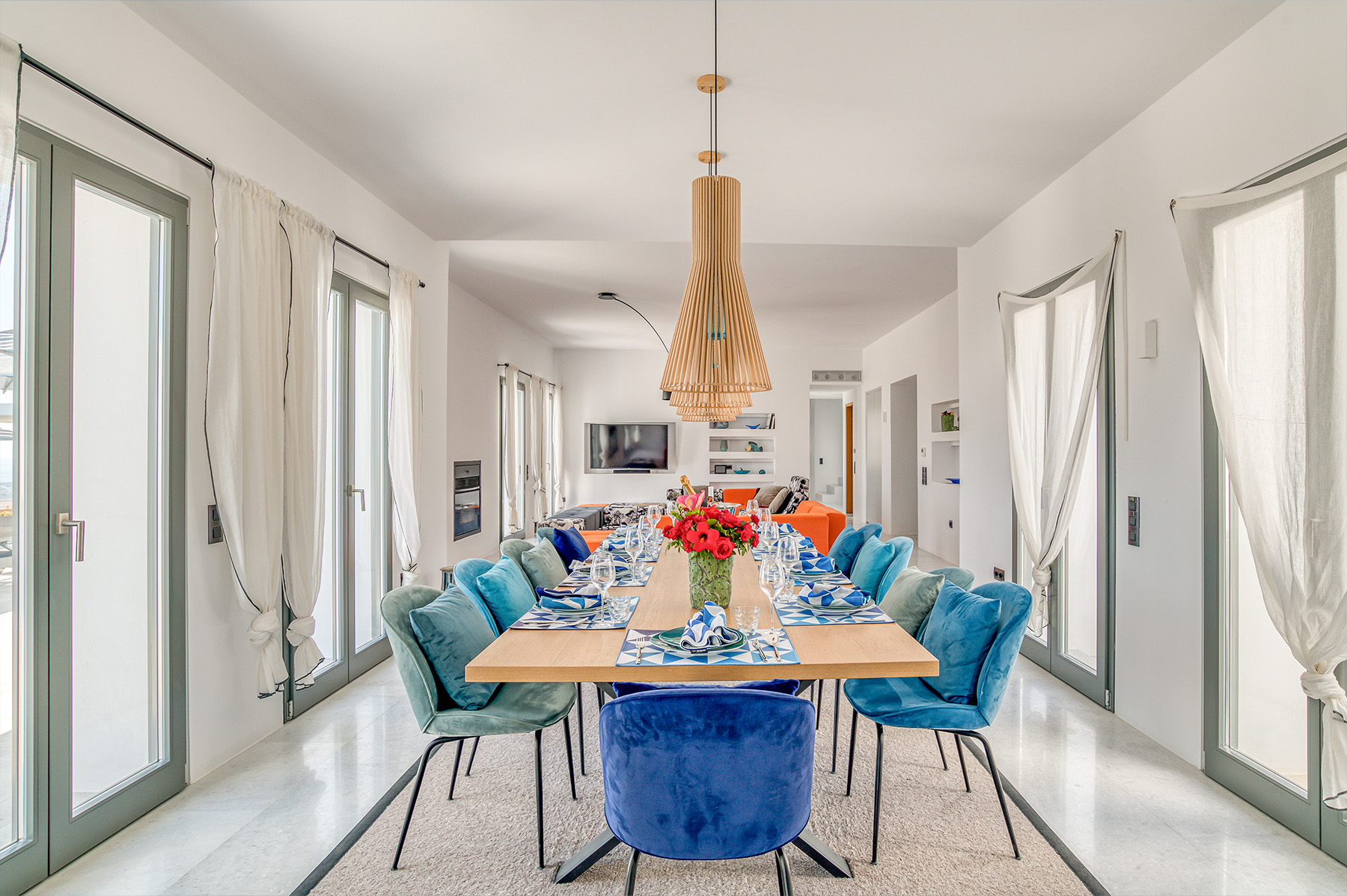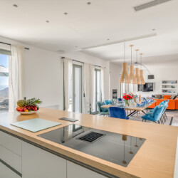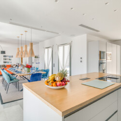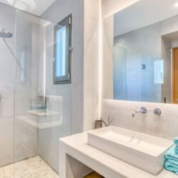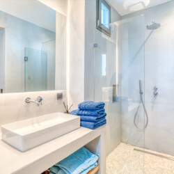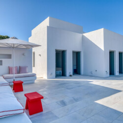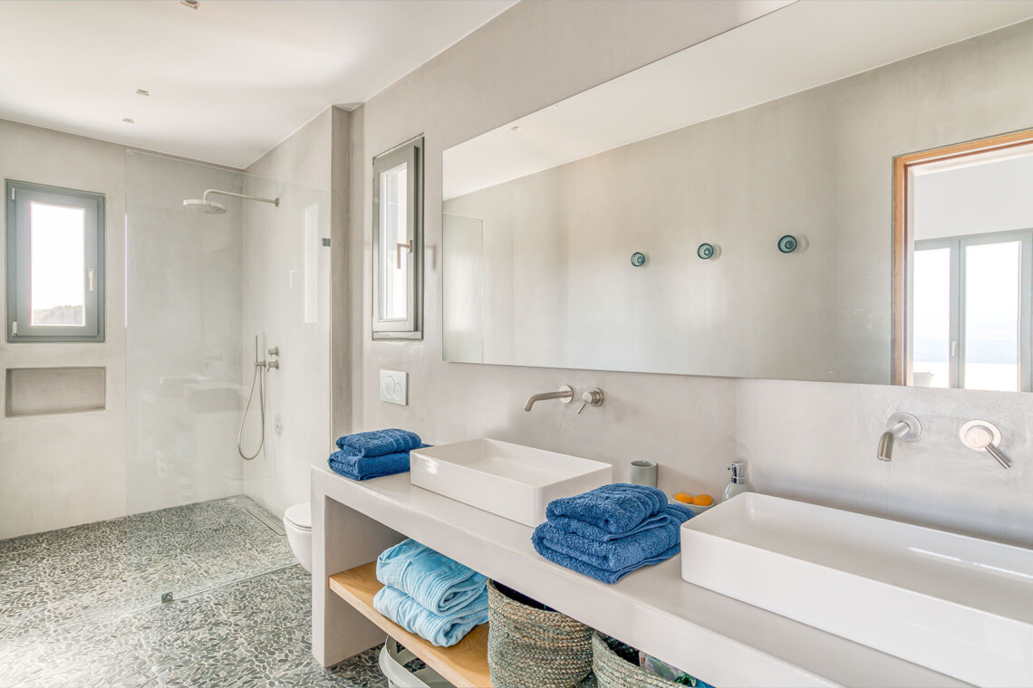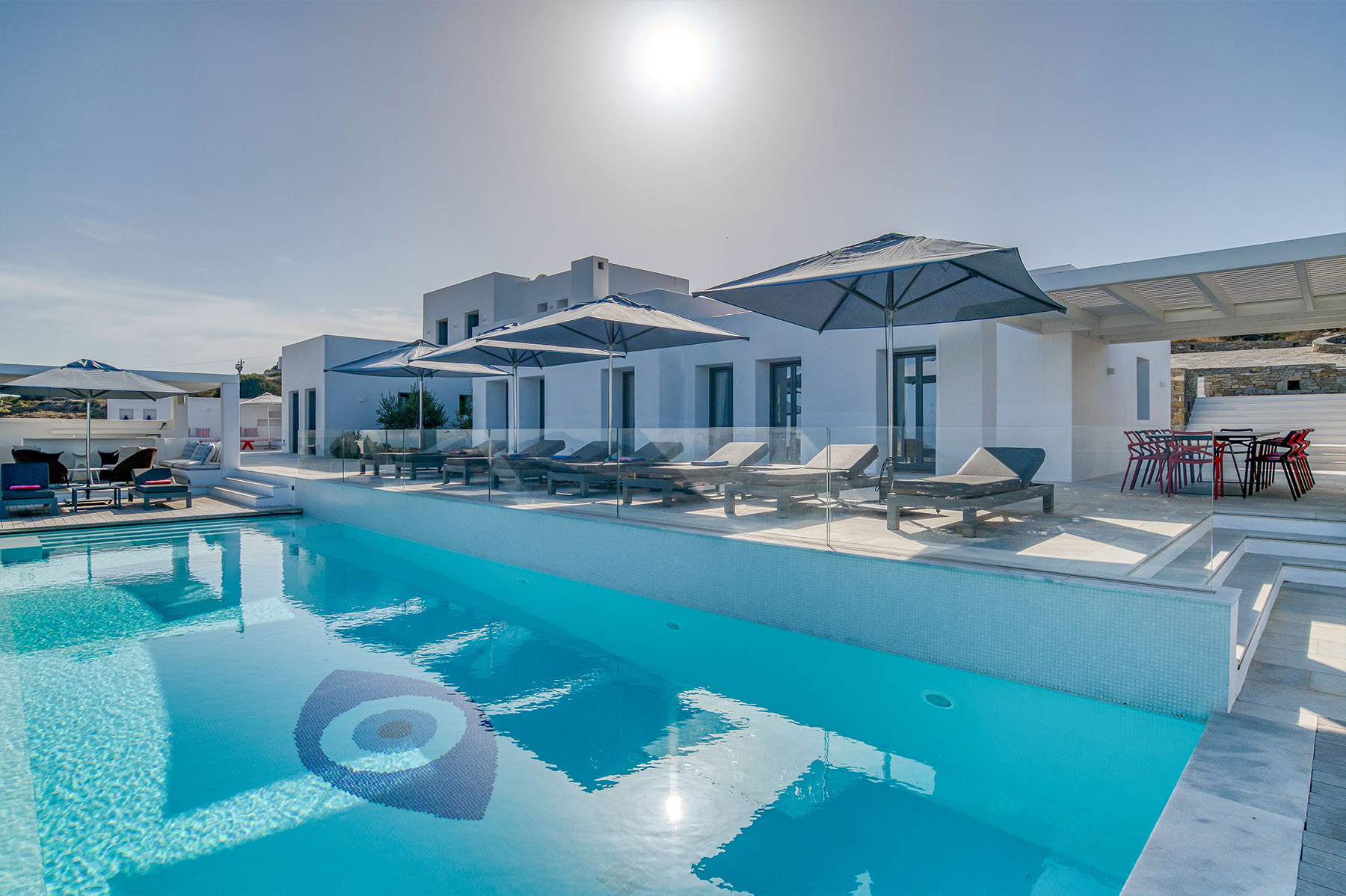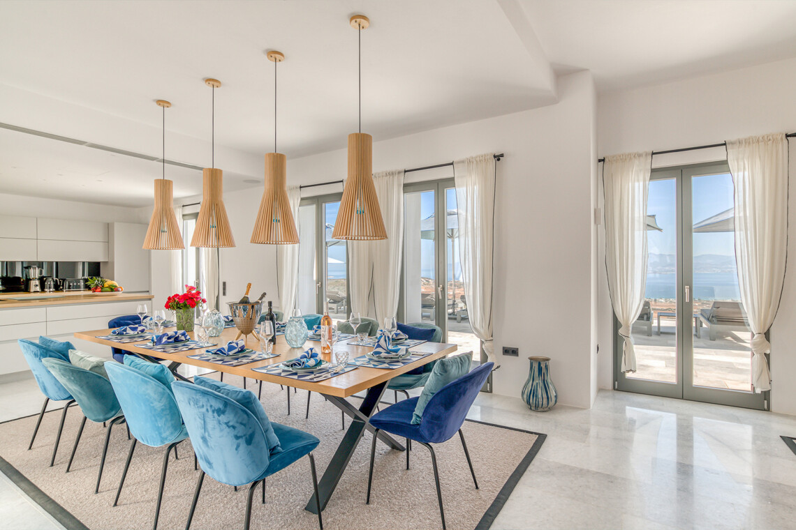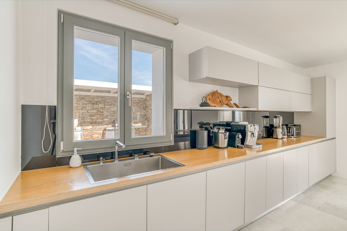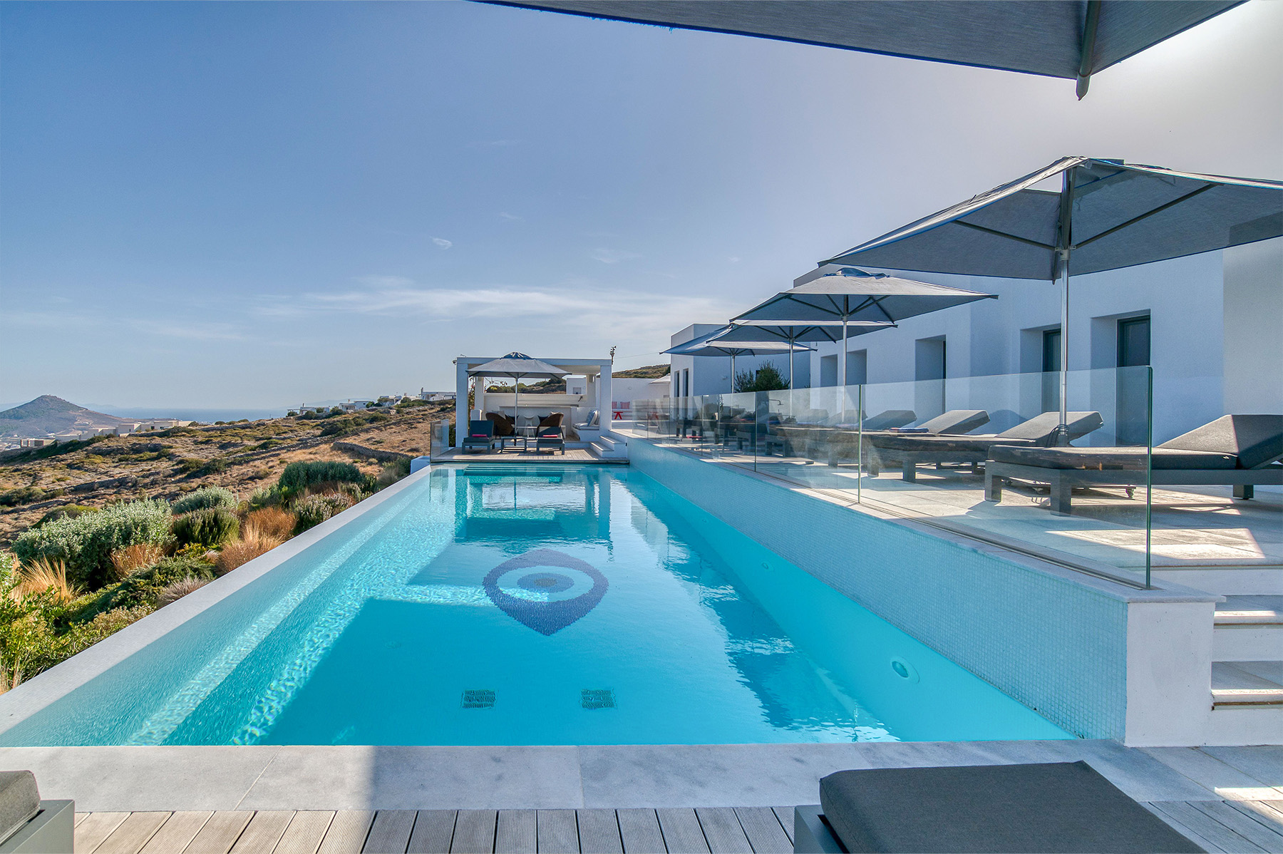 Equipped with a modern kitchen ready for diverse culinary adventures, guests can cook with ease, and the option of a chef can be arranged upon request. Surrounding the villa are expansive terraces with 12 sunbeds and parasols, perfect for relaxation. An equipped bar allows for cocktail-making and delightful aperitifs. The 15m x 4m infinity pool overlooks the sunrise side of the island, providing a stunning view.