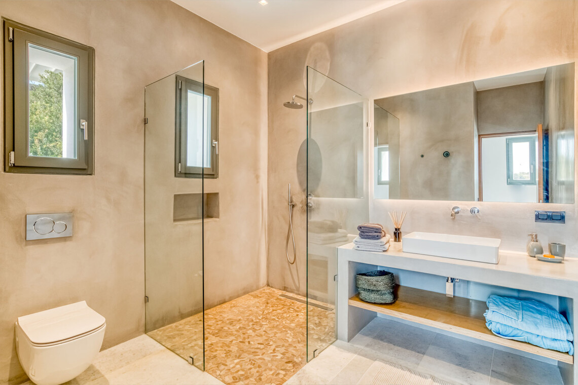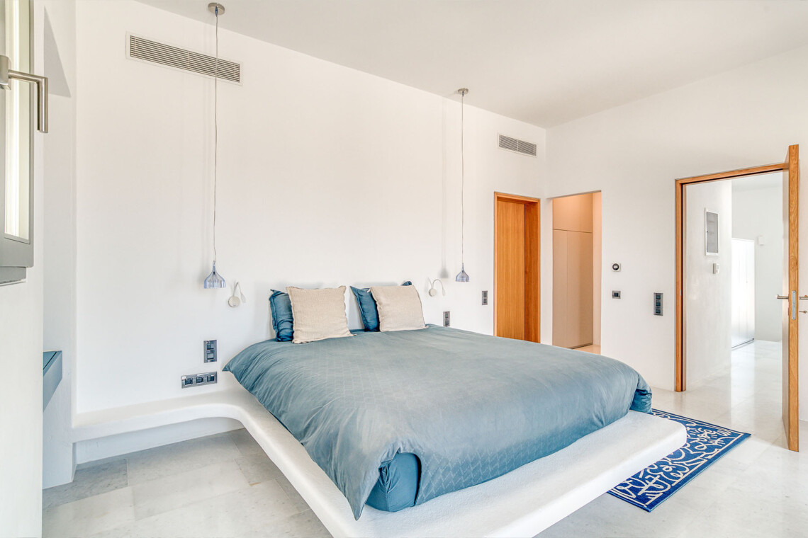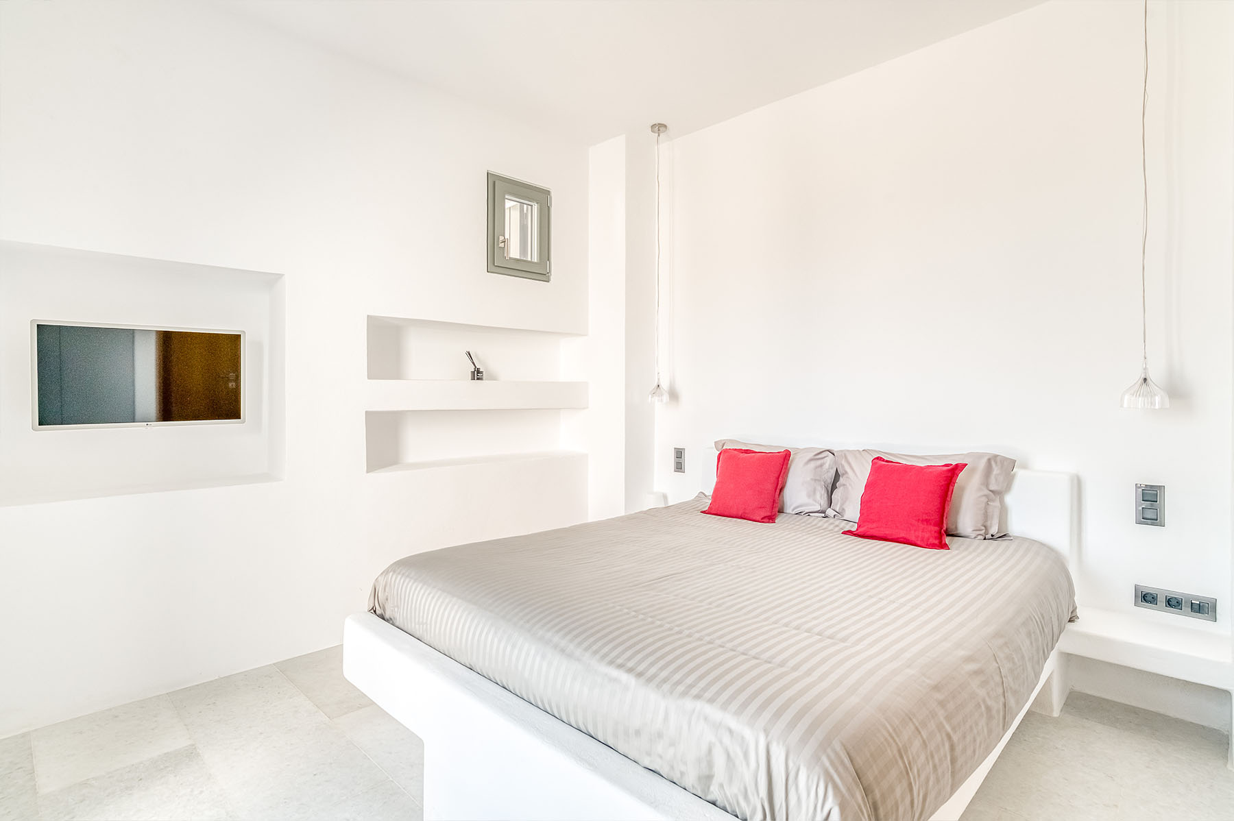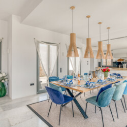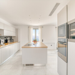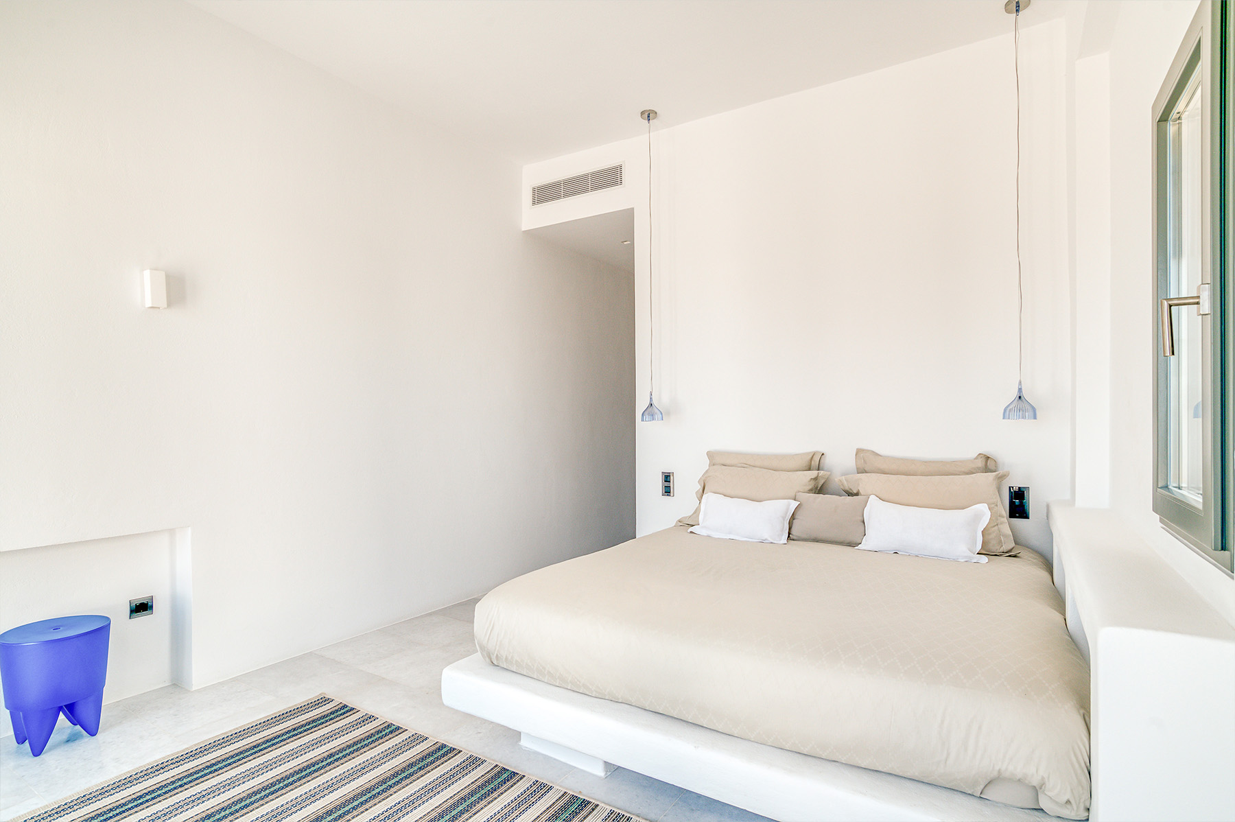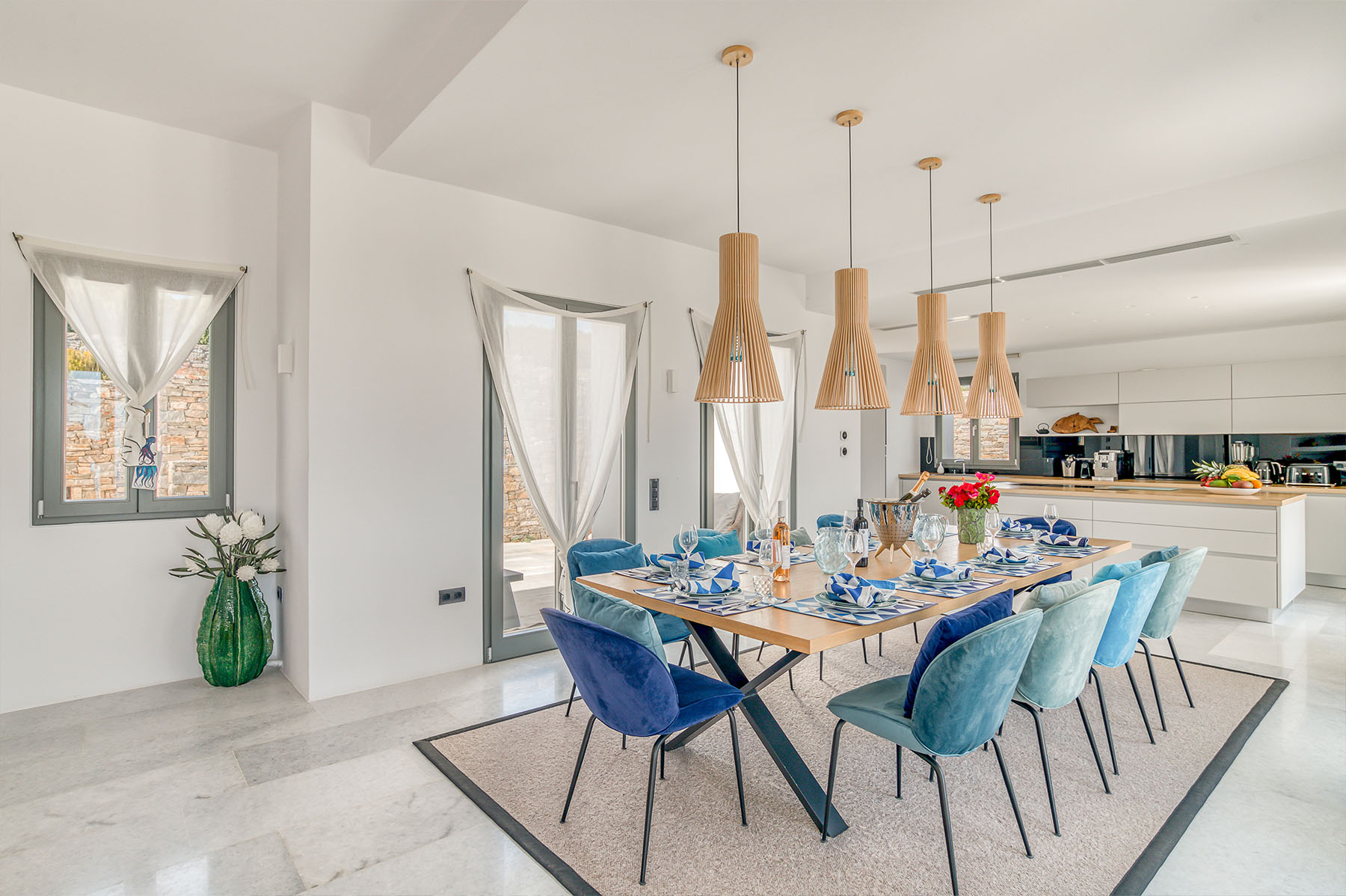 Equipped with a modern kitchen ready for diverse culinary adventures, guests can cook with ease, and the option of a chef can be arranged upon request. Surrounding the villa are expansive terraces with 12 sunbeds and parasols, perfect for relaxation. An equipped bar allows for cocktail-making and delightful aperitifs. The 15m x 4m infinity pool overlooks the sunrise side of the island, providing a stunning view.