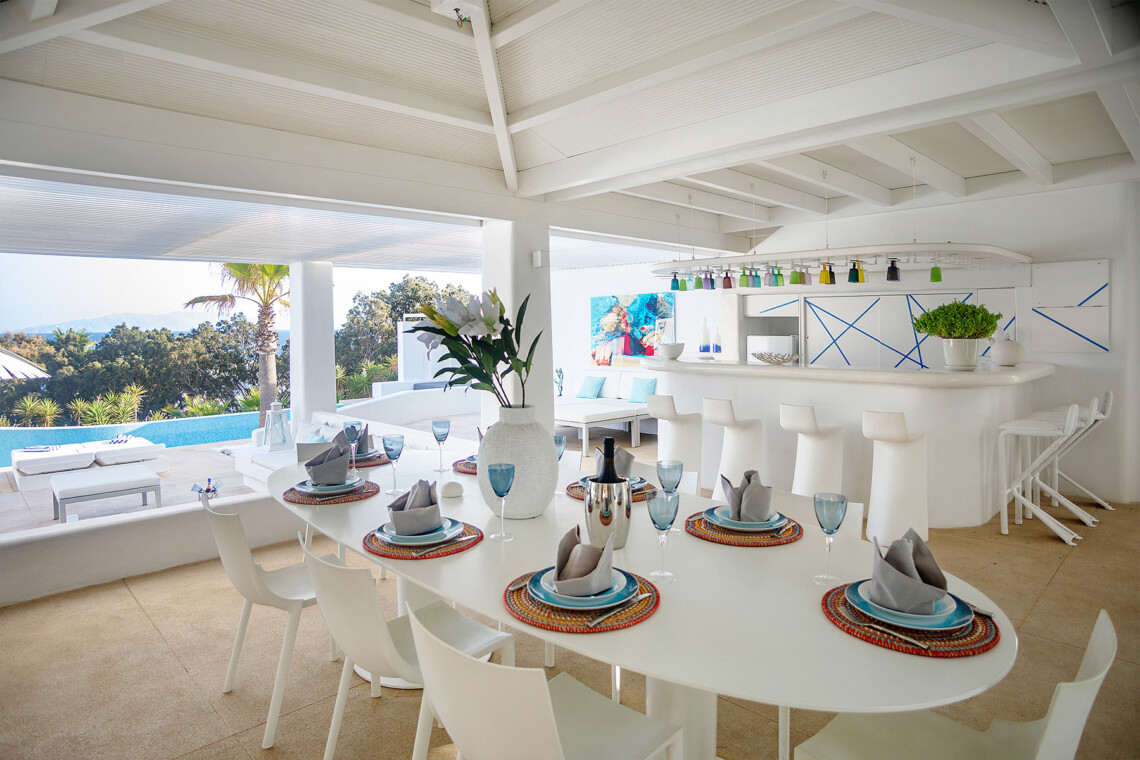 Accommodating up to 10 guests, the villa features five en-suite double bedrooms with queen-size beds, smart amenities, and independent entrances that ensure comfort and seclusion. The master suite is located within the main house alongside the living and dining areas as well as the fully equipped kitchen, while the remaining four guest rooms sit conveniently around the outdoor social spaces, allowing everyone to enjoy effortless indoor-outdoor living.