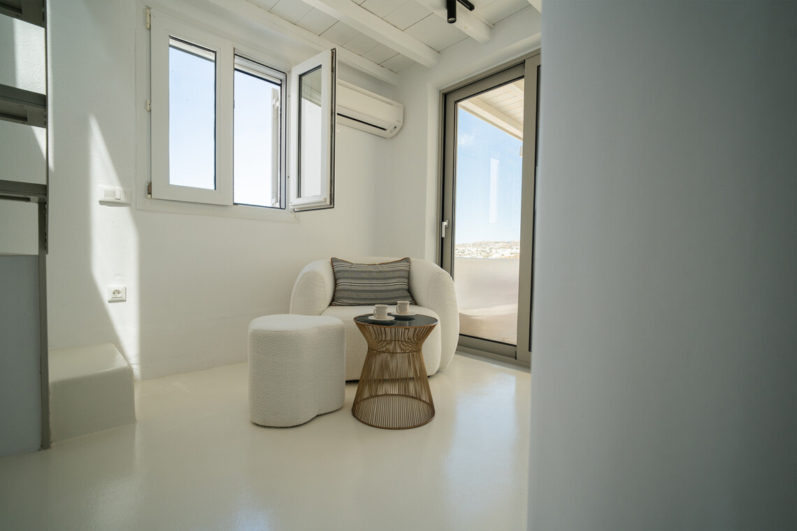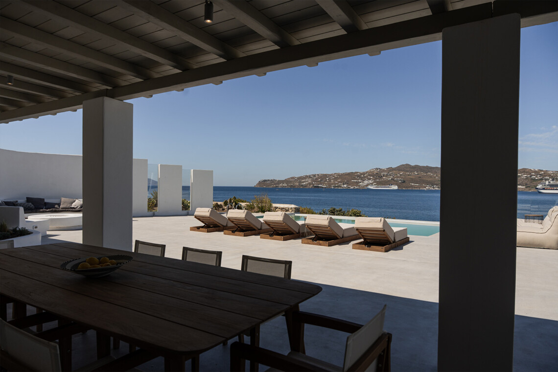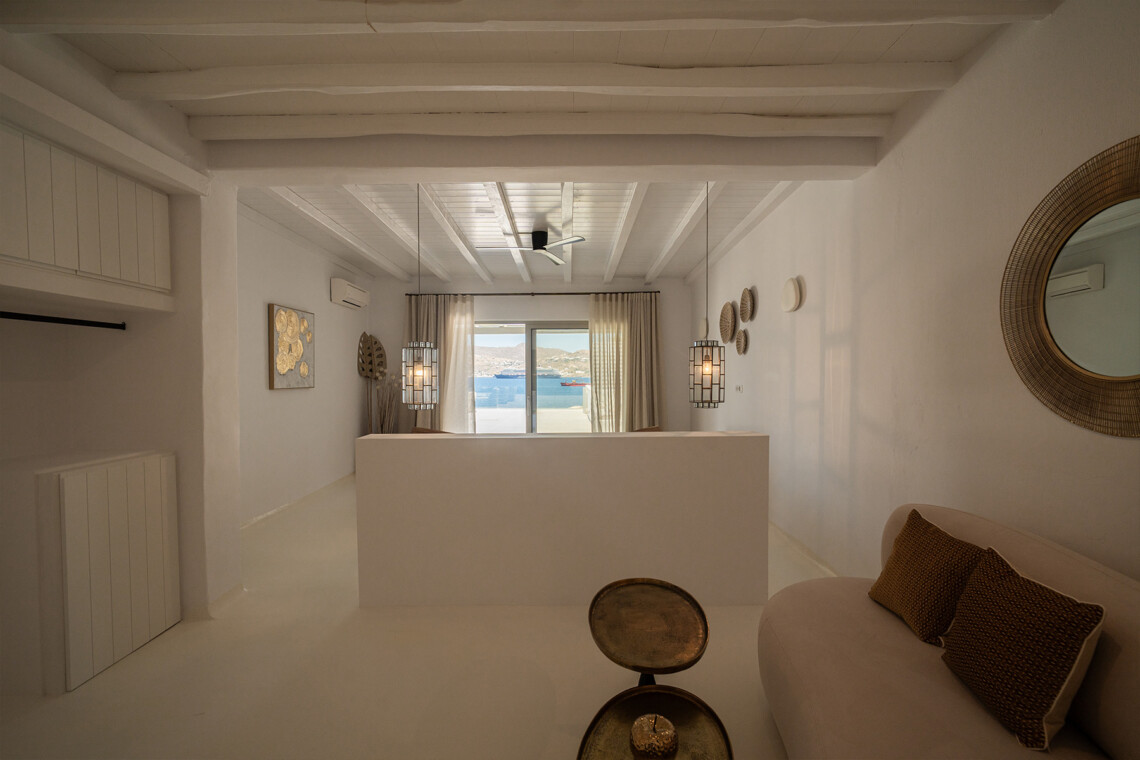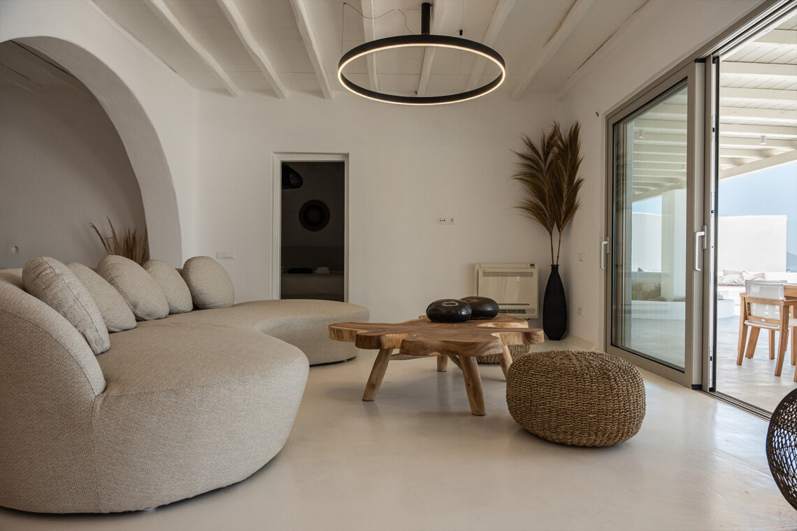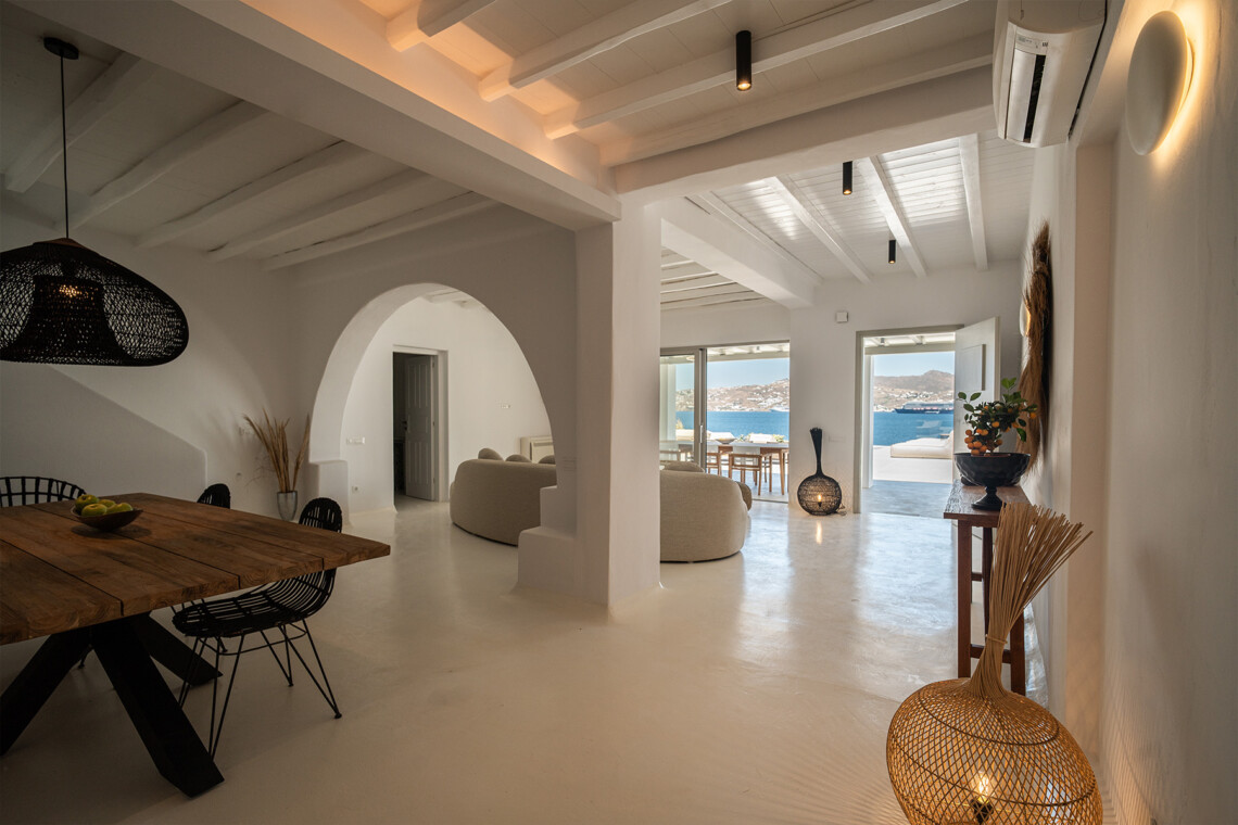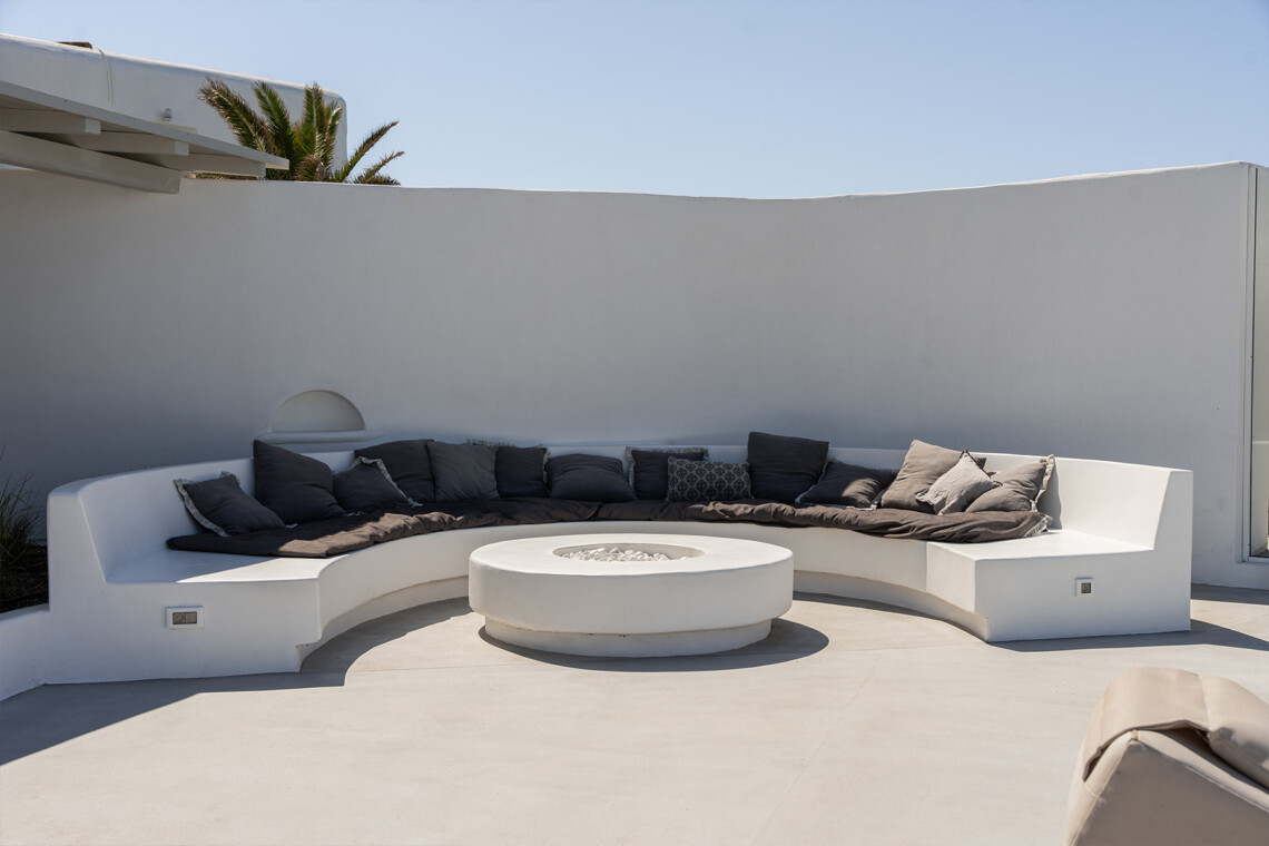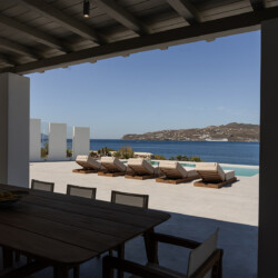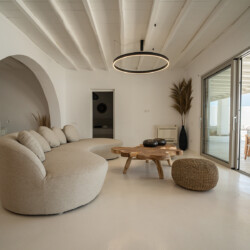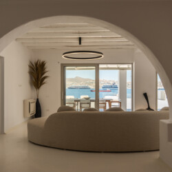 Outdoors, guests can enjoy multiple lounge areas that invite relaxation under the Mykonian sun or al fresco dining overlooking the endless blue horizon. Ideal for families or groups of friends, Villa Miracle combines privacy, comfort, and captivating views for an unforgettable island escape.
