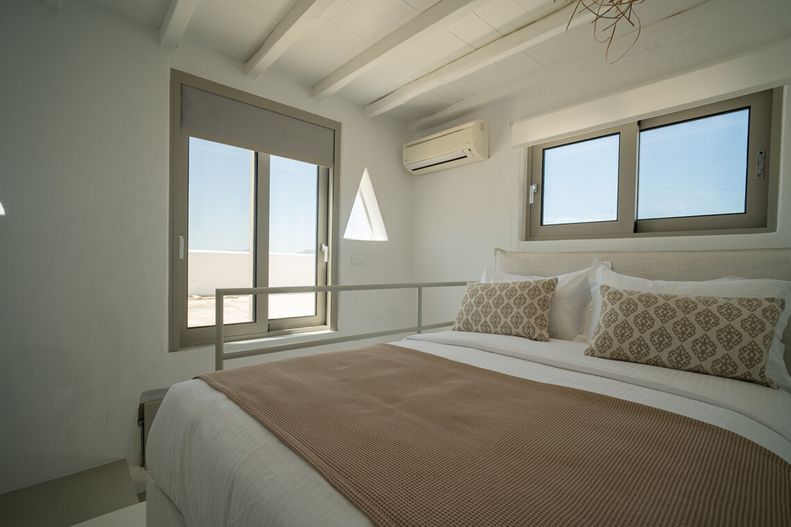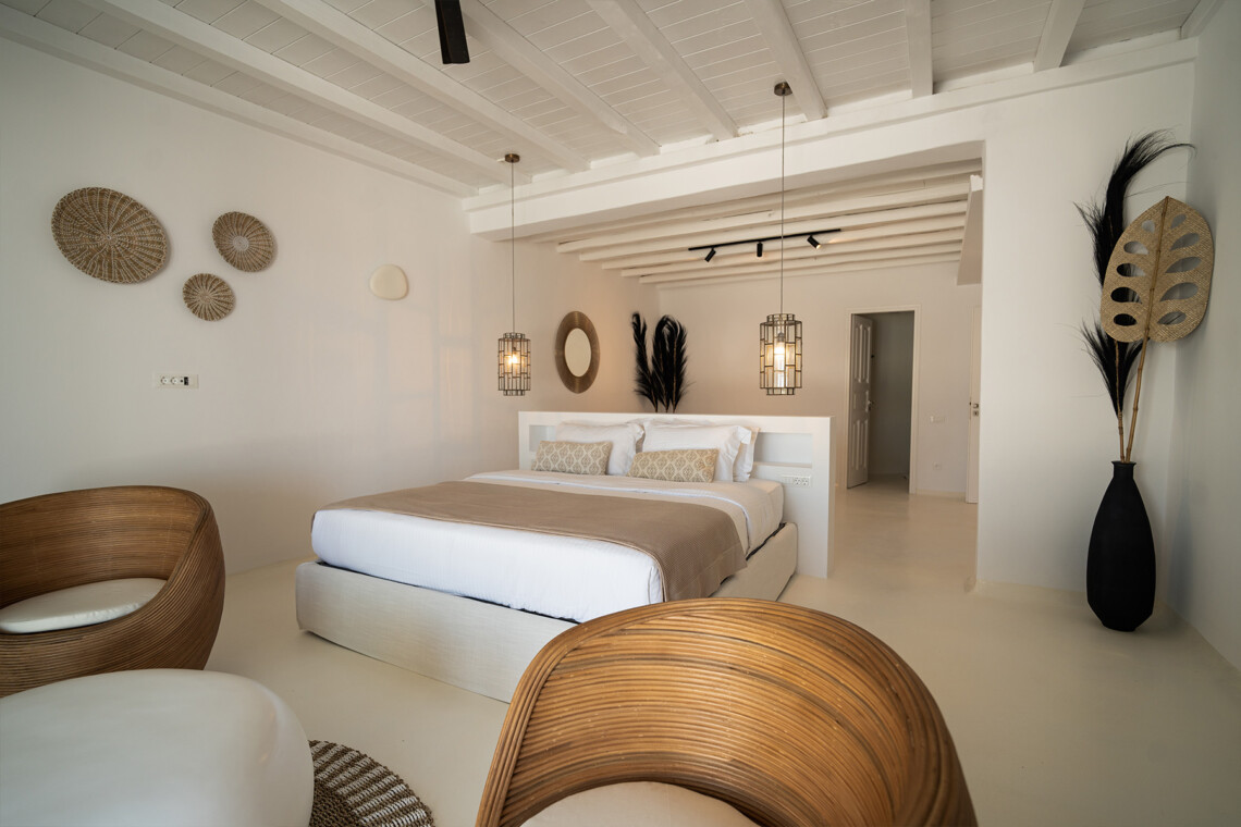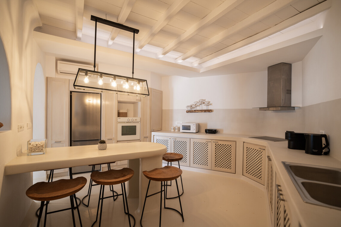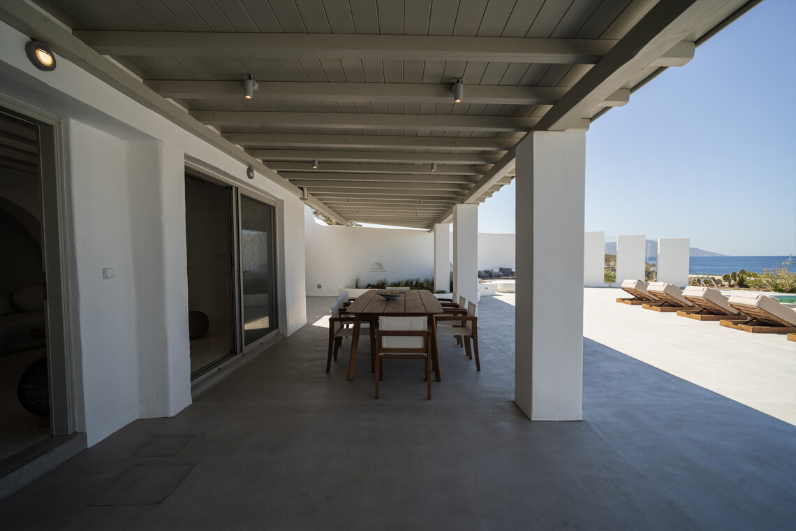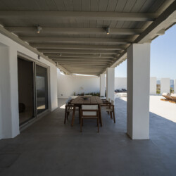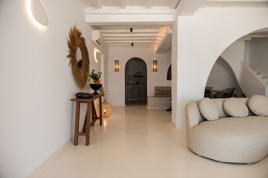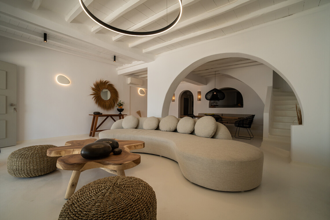 Outdoors, guests can enjoy multiple lounge areas that invite relaxation under the Mykonian sun or al fresco dining overlooking the endless blue horizon. Ideal for families or groups of friends, Villa Miracle combines privacy, comfort, and captivating views for an unforgettable island escape.