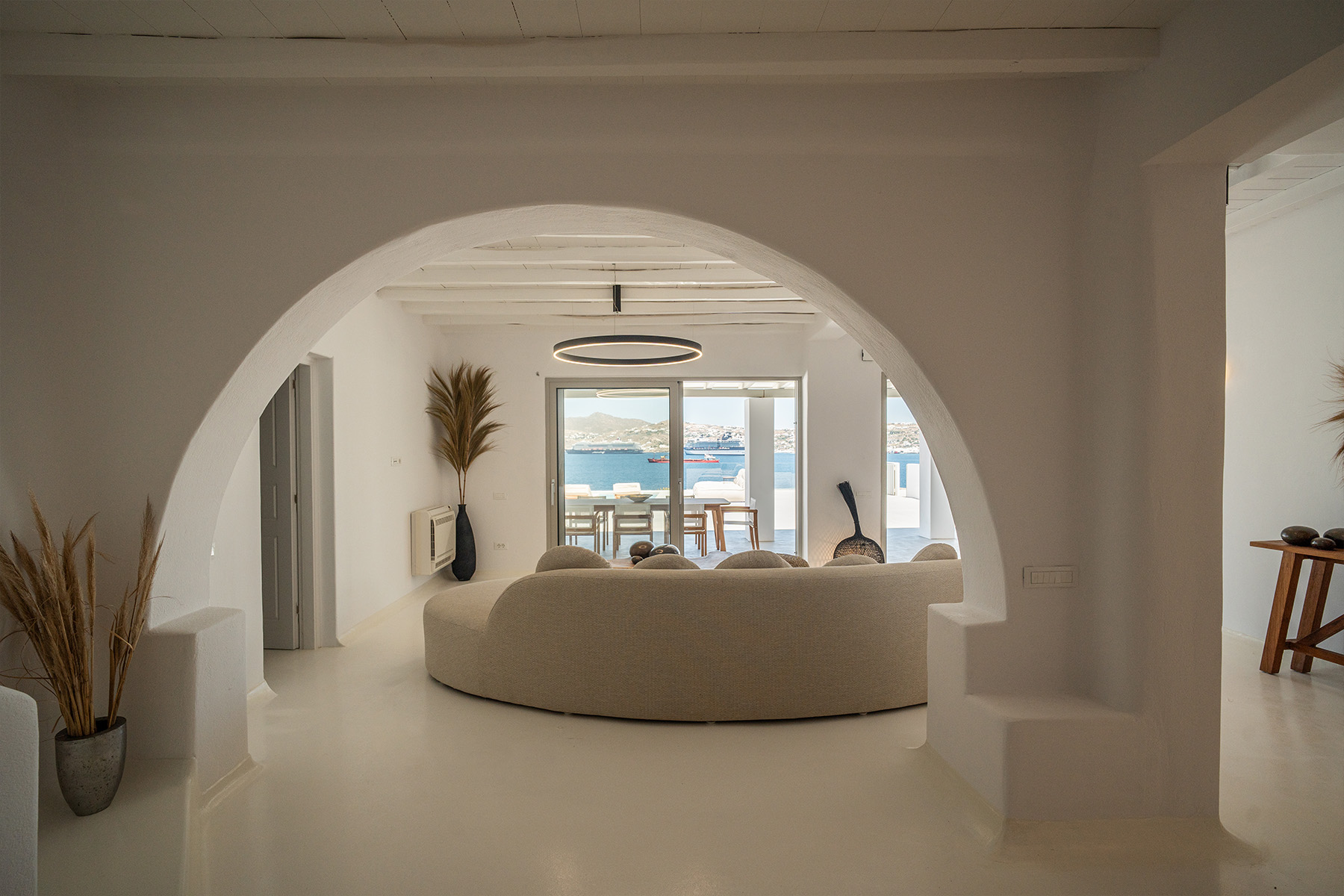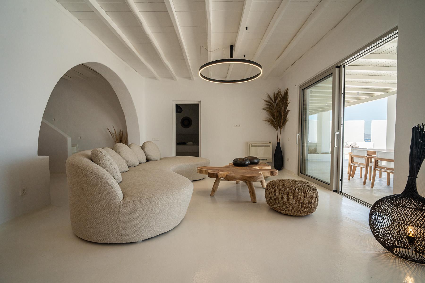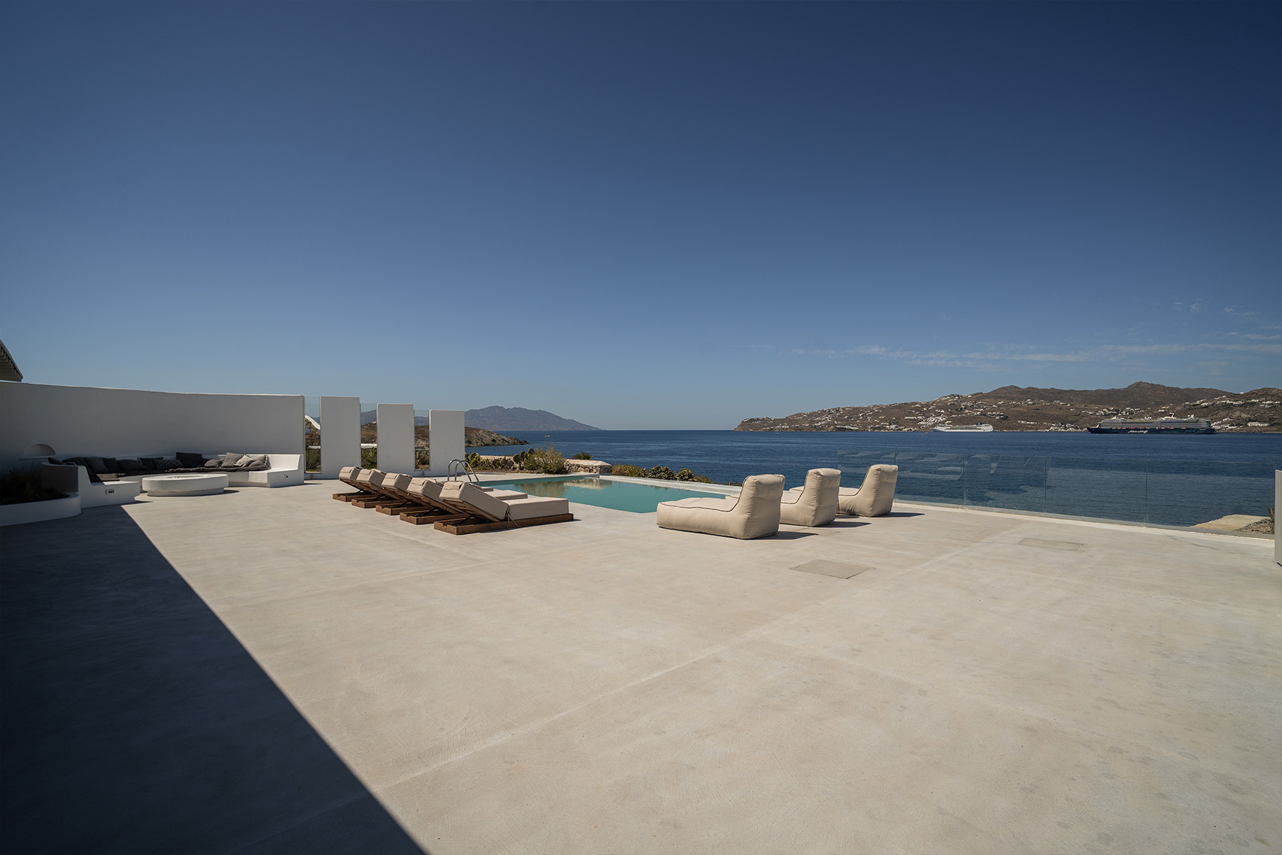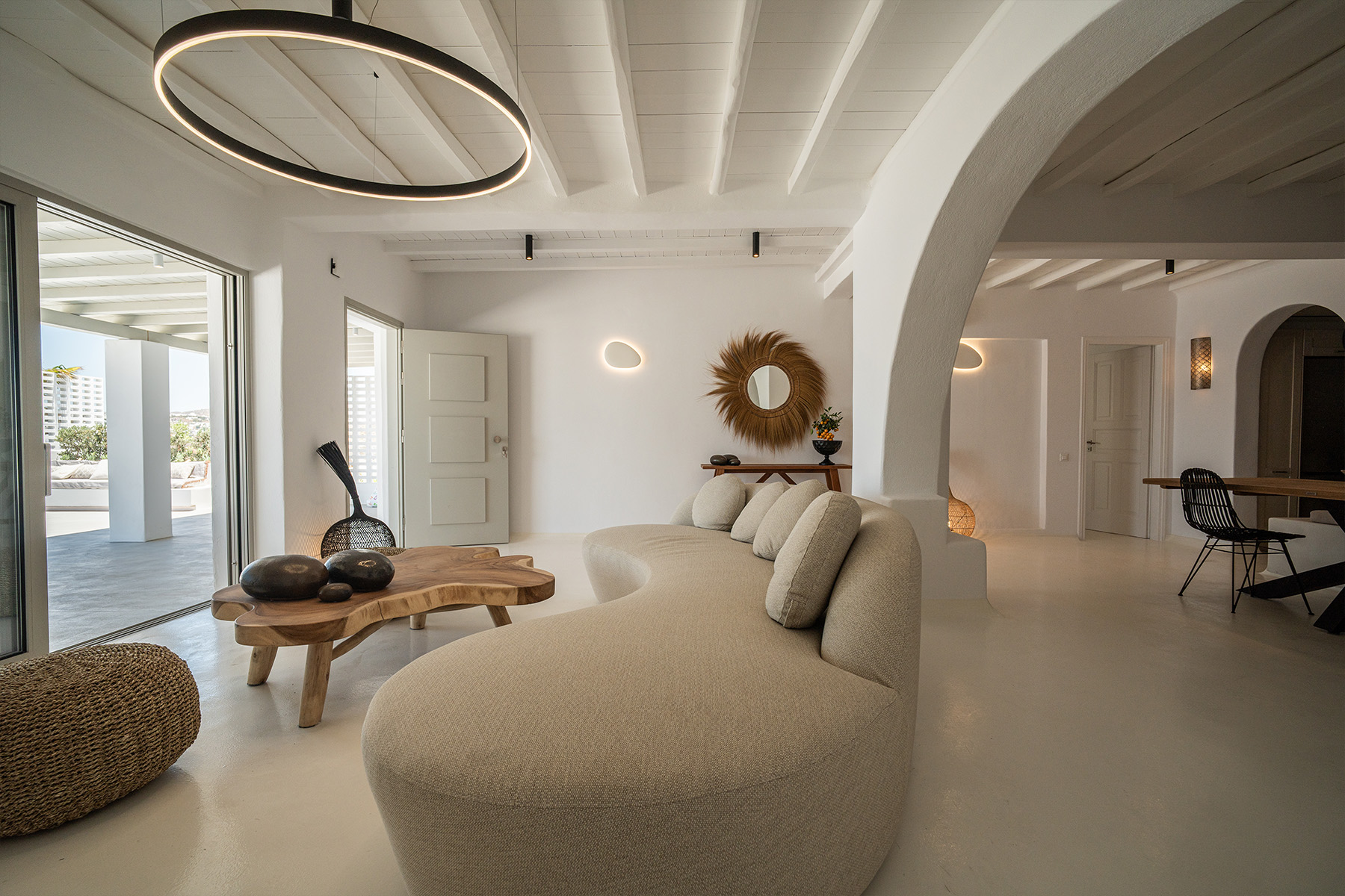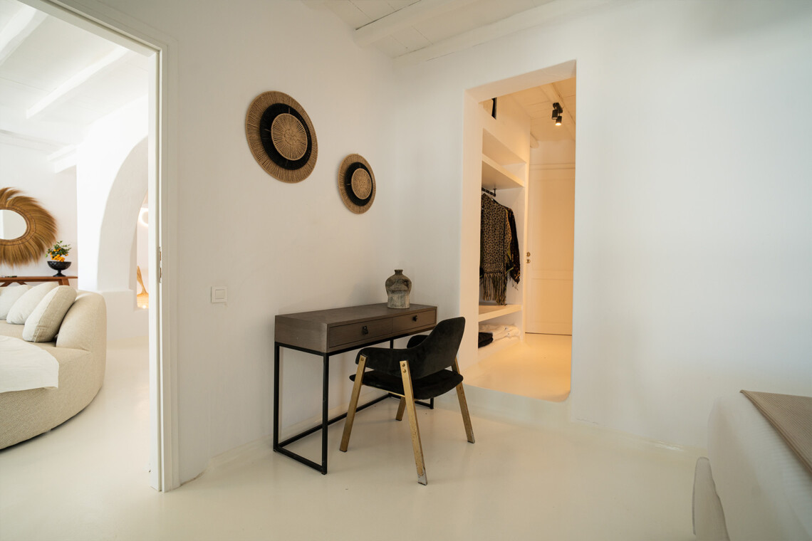 Outdoors, guests can enjoy multiple lounge areas that invite relaxation under the Mykonian sun or al fresco dining overlooking the endless blue horizon. Ideal for families or groups of friends, Villa Miracle combines privacy, comfort, and captivating views for an unforgettable island escape.
