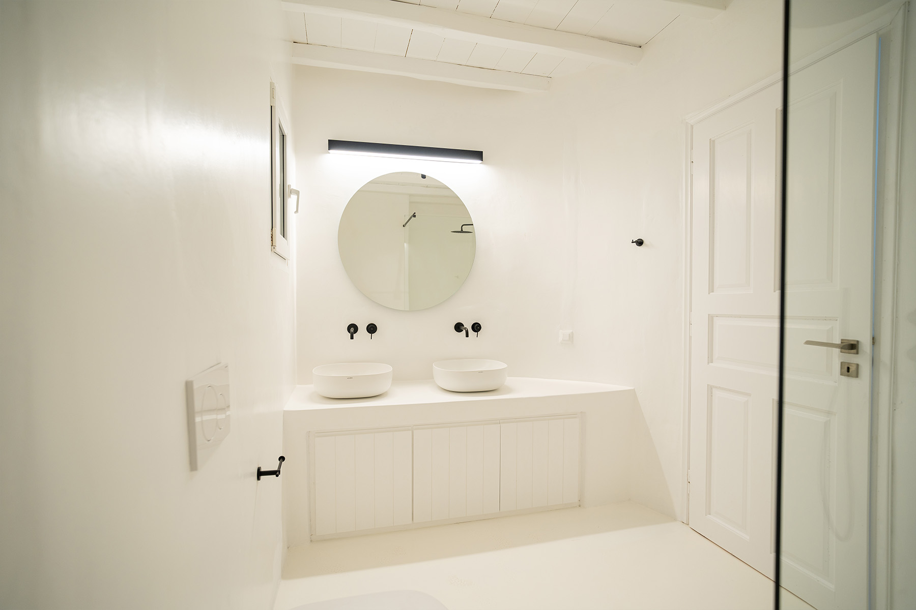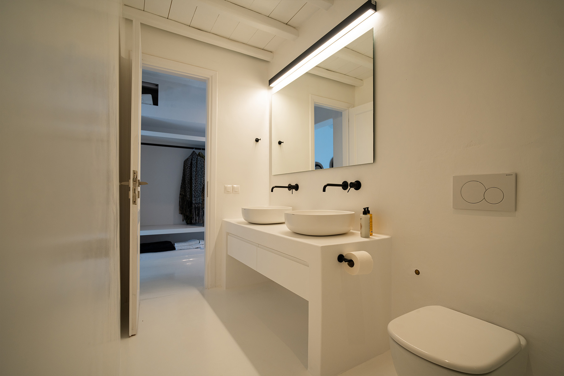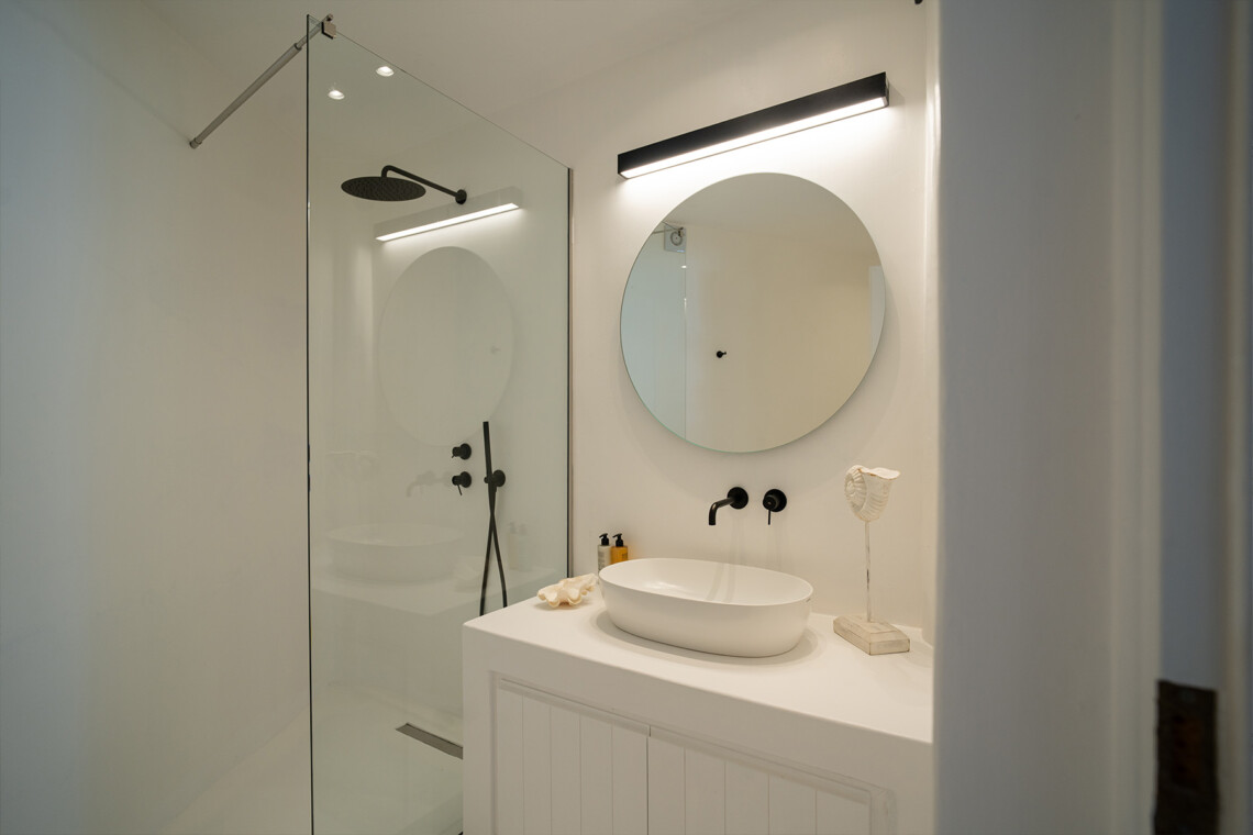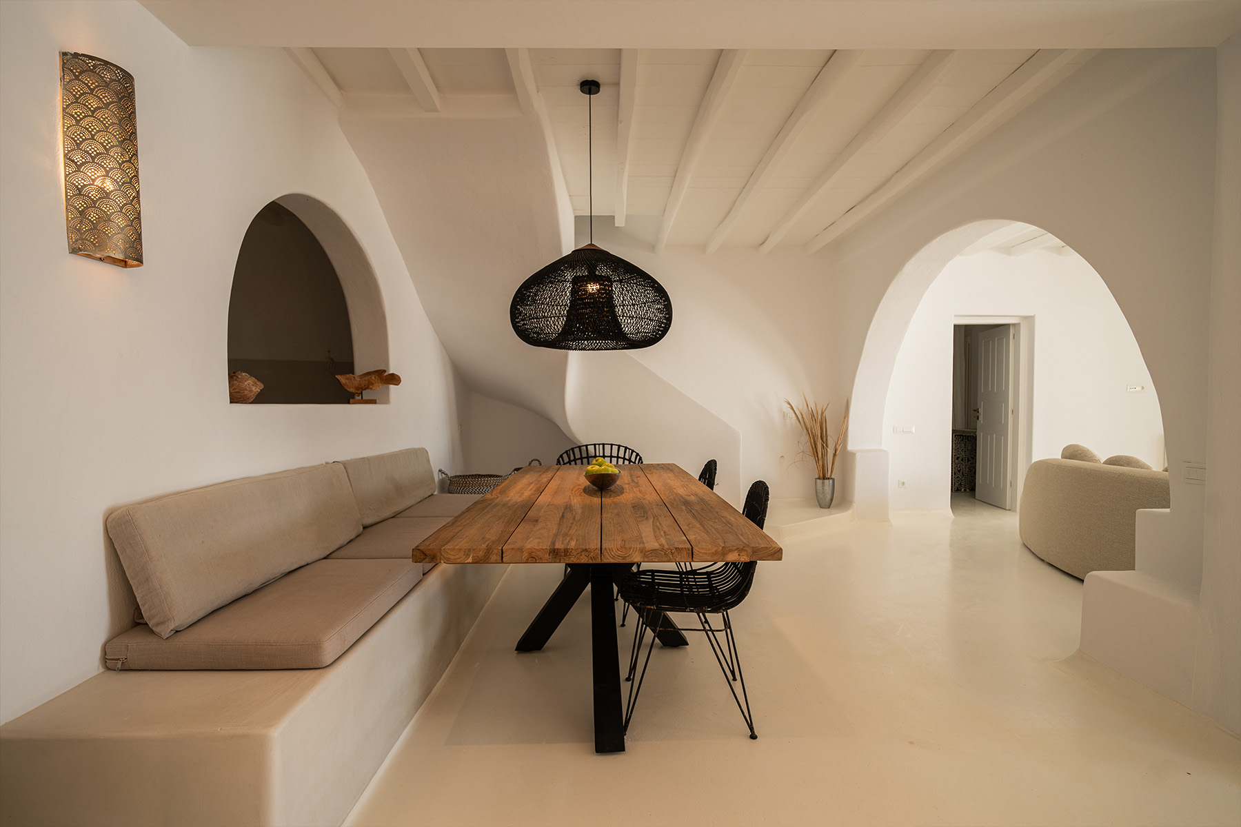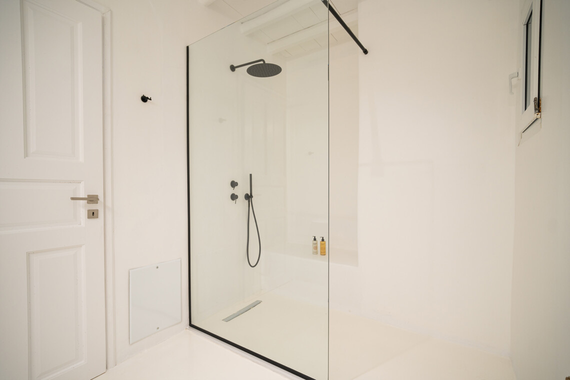 Outdoors, guests can enjoy multiple lounge areas that invite relaxation under the Mykonian sun or al fresco dining overlooking the endless blue horizon. Ideal for families or groups of friends, Villa Miracle combines privacy, comfort, and captivating views for an unforgettable island escape.