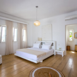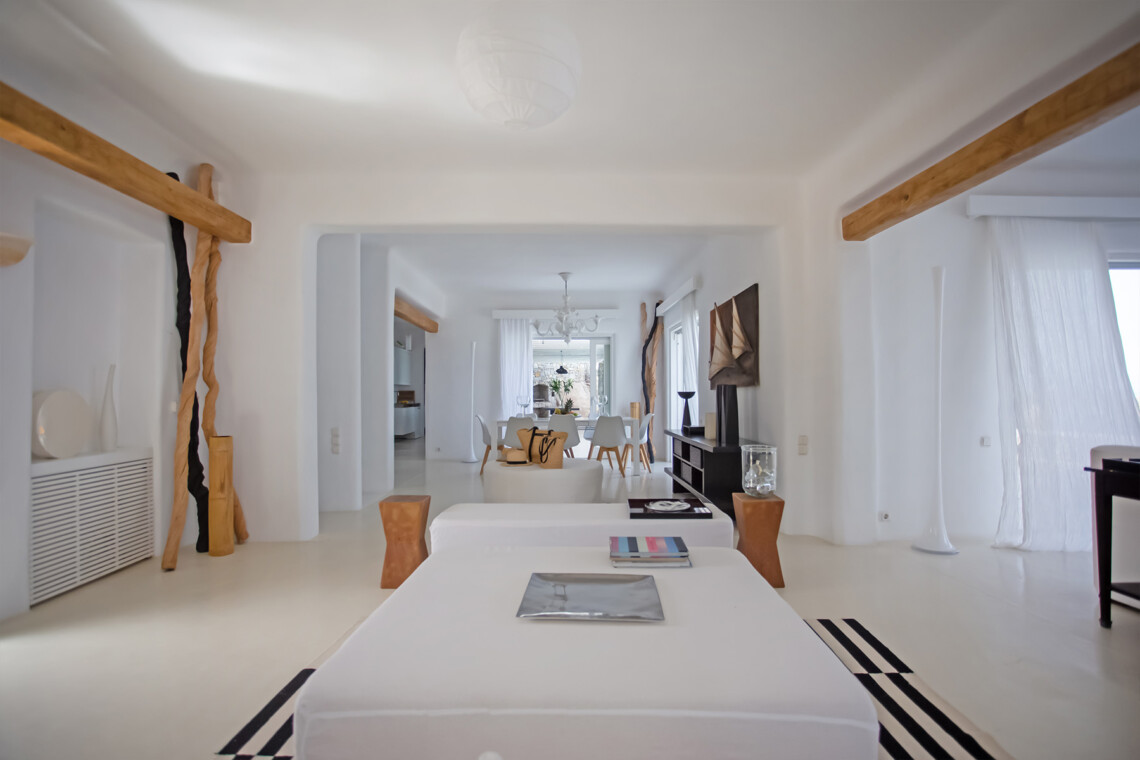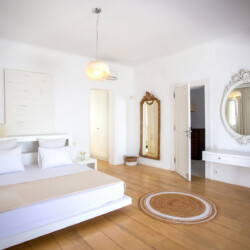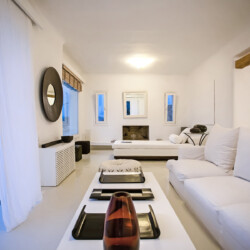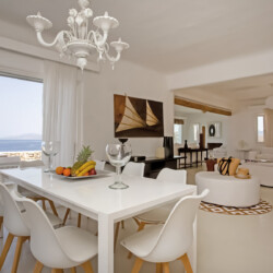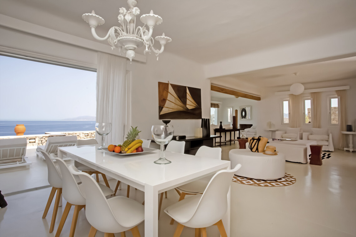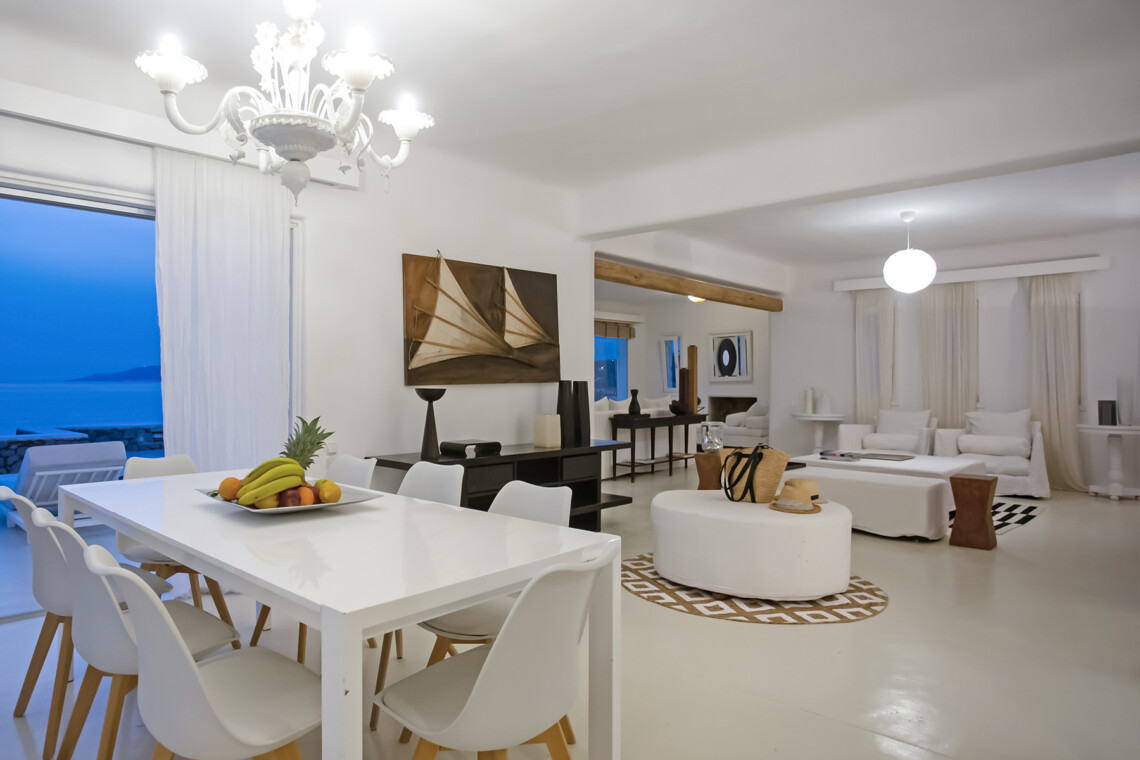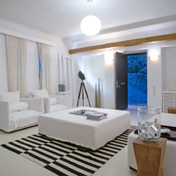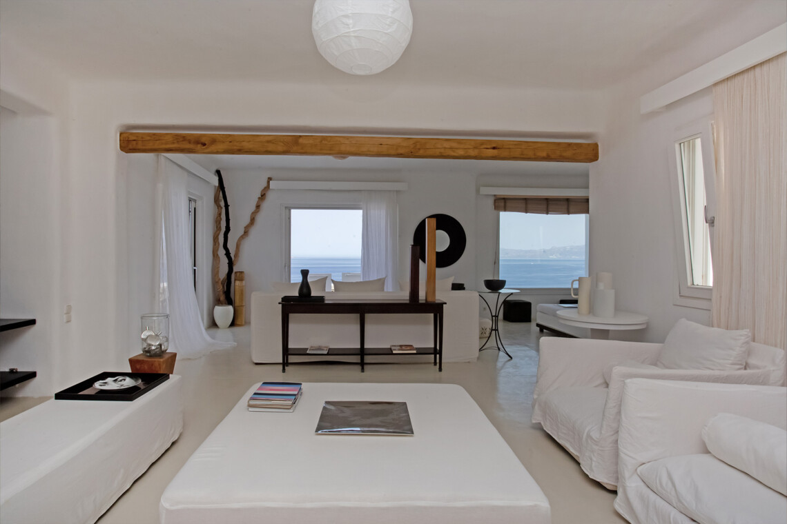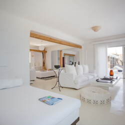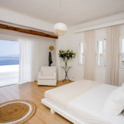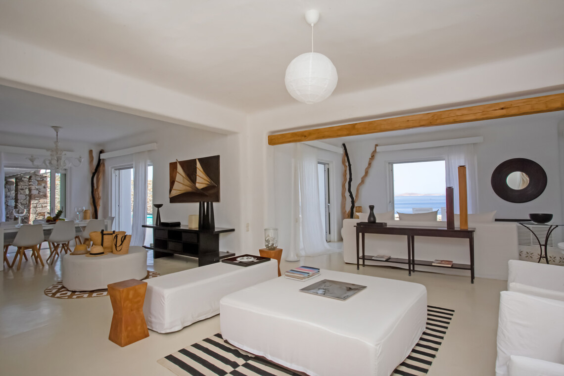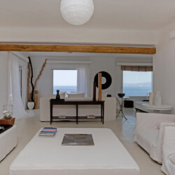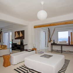 Accommodating up to 12 guests, the villa features six beautifully appointed bedrooms, five of which are en-suite, along with spacious living areas filled with natural light. The interiors combine clean lines, neutral tones, and contemporary furnishings, while large openings frame the sea views and seamlessly connect indoor and outdoor spaces for effortless island living.