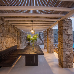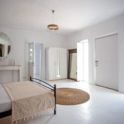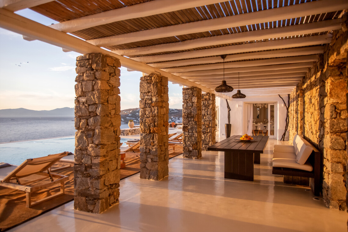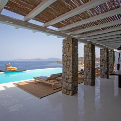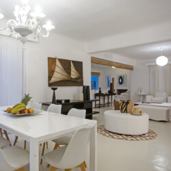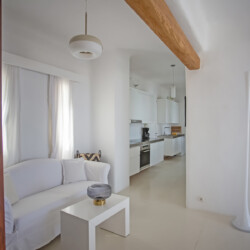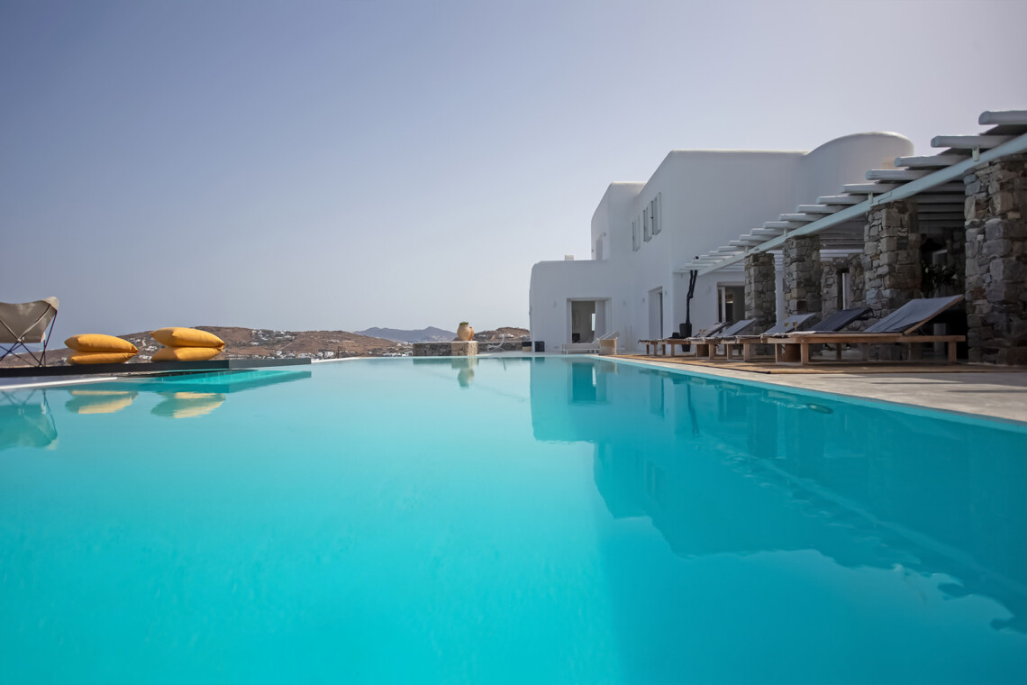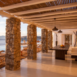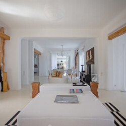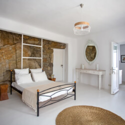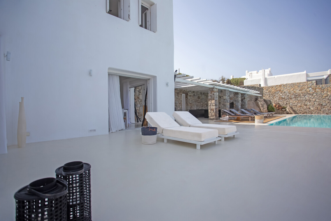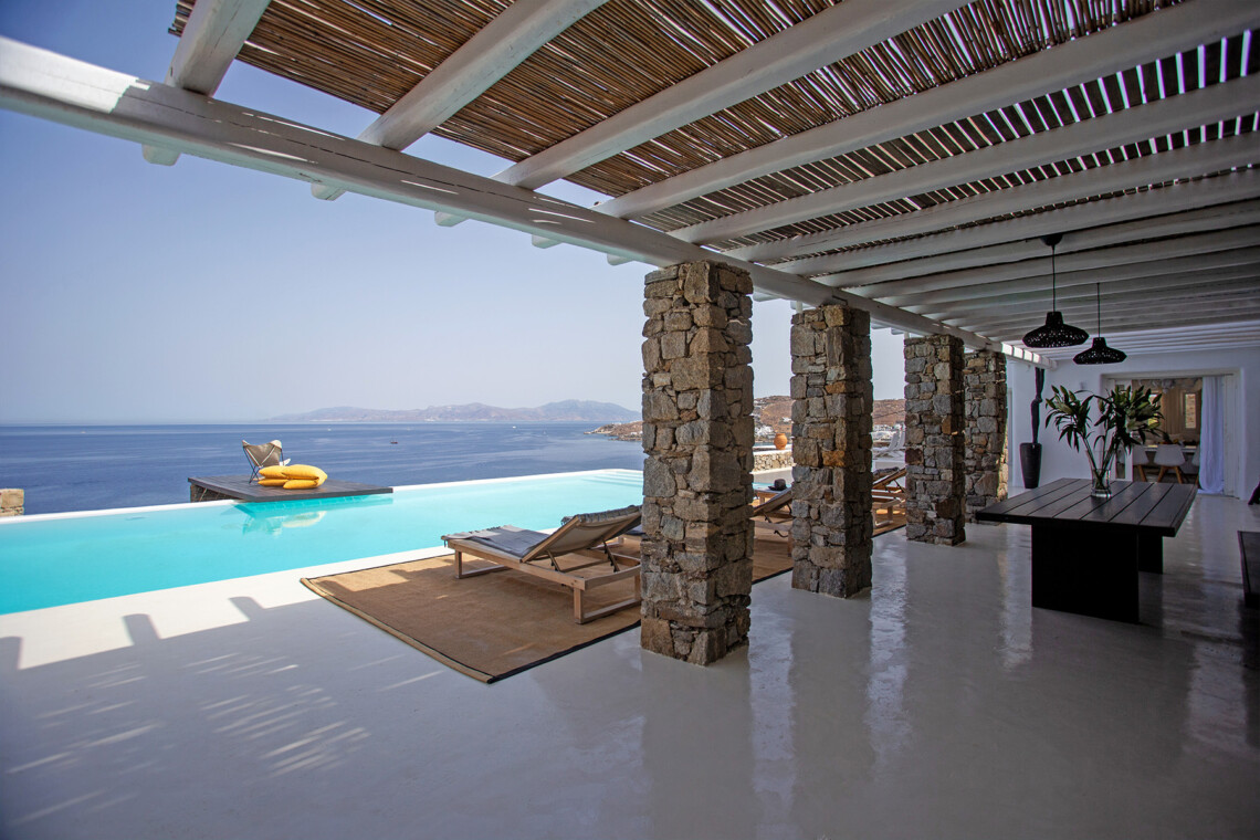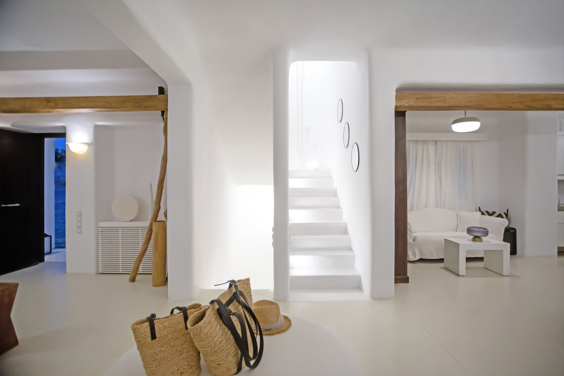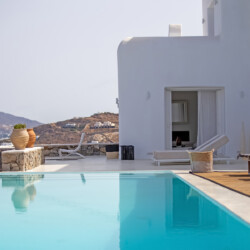 Accommodating up to 12 guests, the villa features six beautifully appointed bedrooms, five of which are en-suite, along with spacious living areas filled with natural light. The interiors combine clean lines, neutral tones, and contemporary furnishings, while large openings frame the sea views and seamlessly connect indoor and outdoor spaces for effortless island living.