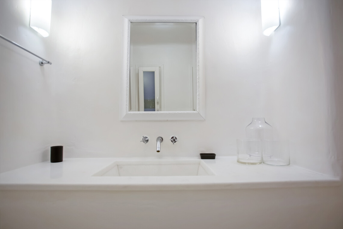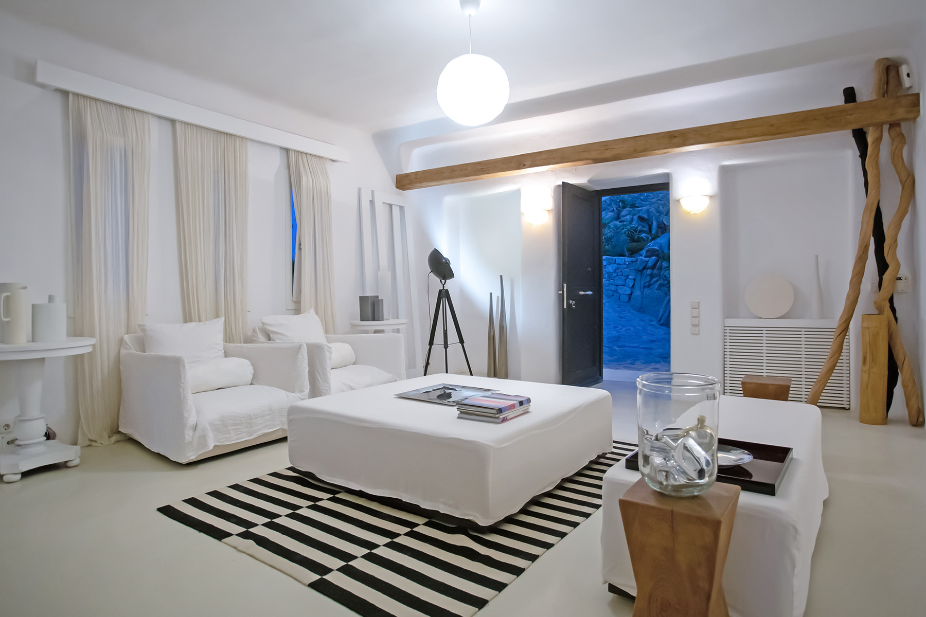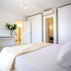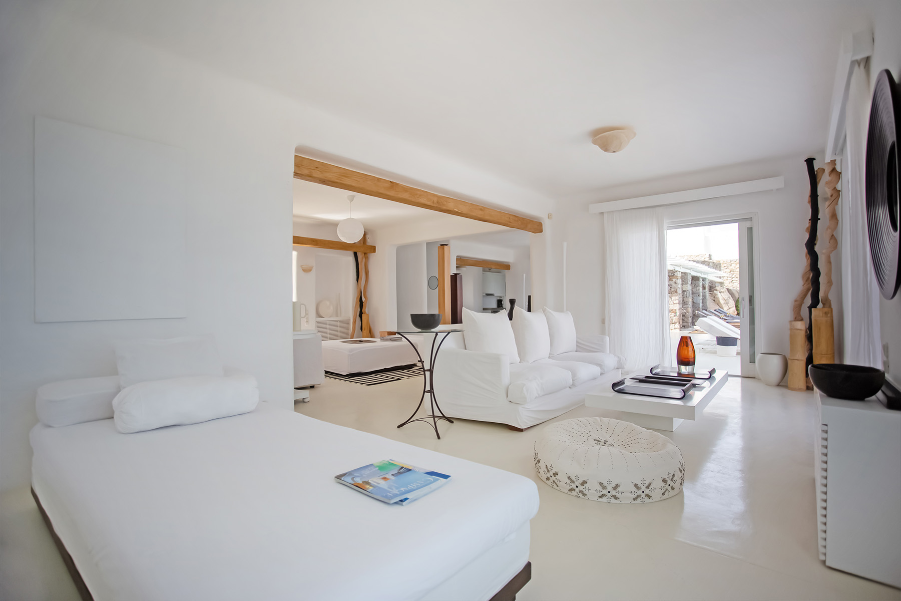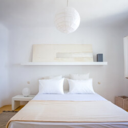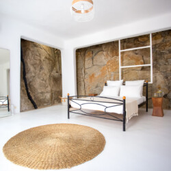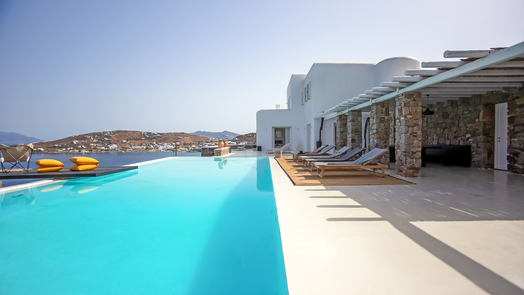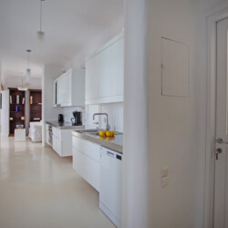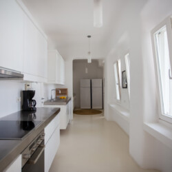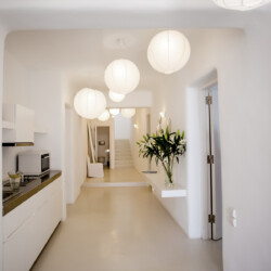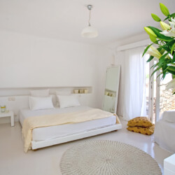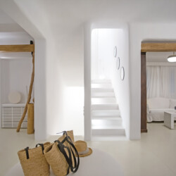 Accommodating up to 12 guests, the villa features six beautifully appointed bedrooms, five of which are en-suite, along with spacious living areas filled with natural light. The interiors combine clean lines, neutral tones, and contemporary furnishings, while large openings frame the sea views and seamlessly connect indoor and outdoor spaces for effortless island living.