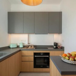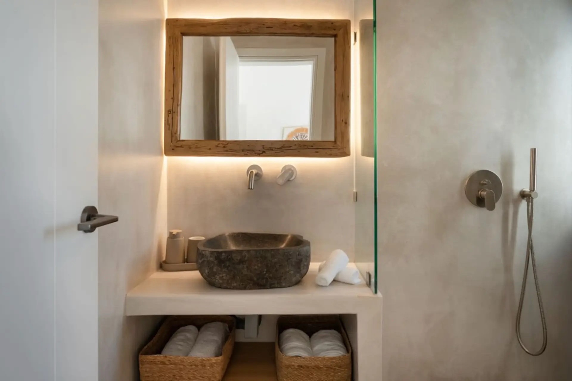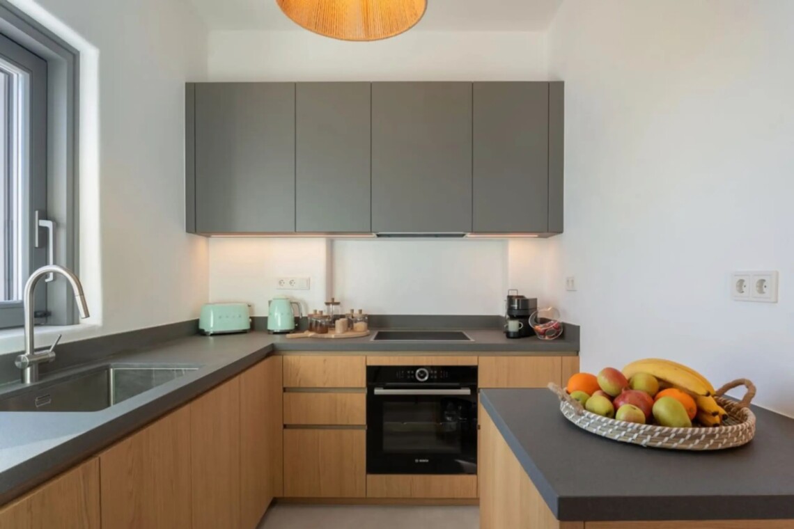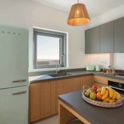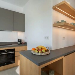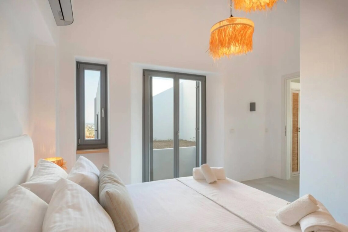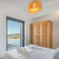 Designed with a balance of luxury and simplicity, the villa’s interiors exude a sense of calm and refinement. The open-plan living area includes a fully equipped modern kitchen, Smart TV, and high-speed Wi-Fi via Starlink, ensuring every convenience is at your fingertips. Large windows flood the space with natural light, seamlessly connecting the indoors with the expansive terrace-ideal for relaxing or enjoying an evening drink while admiring the endless blue horizon.