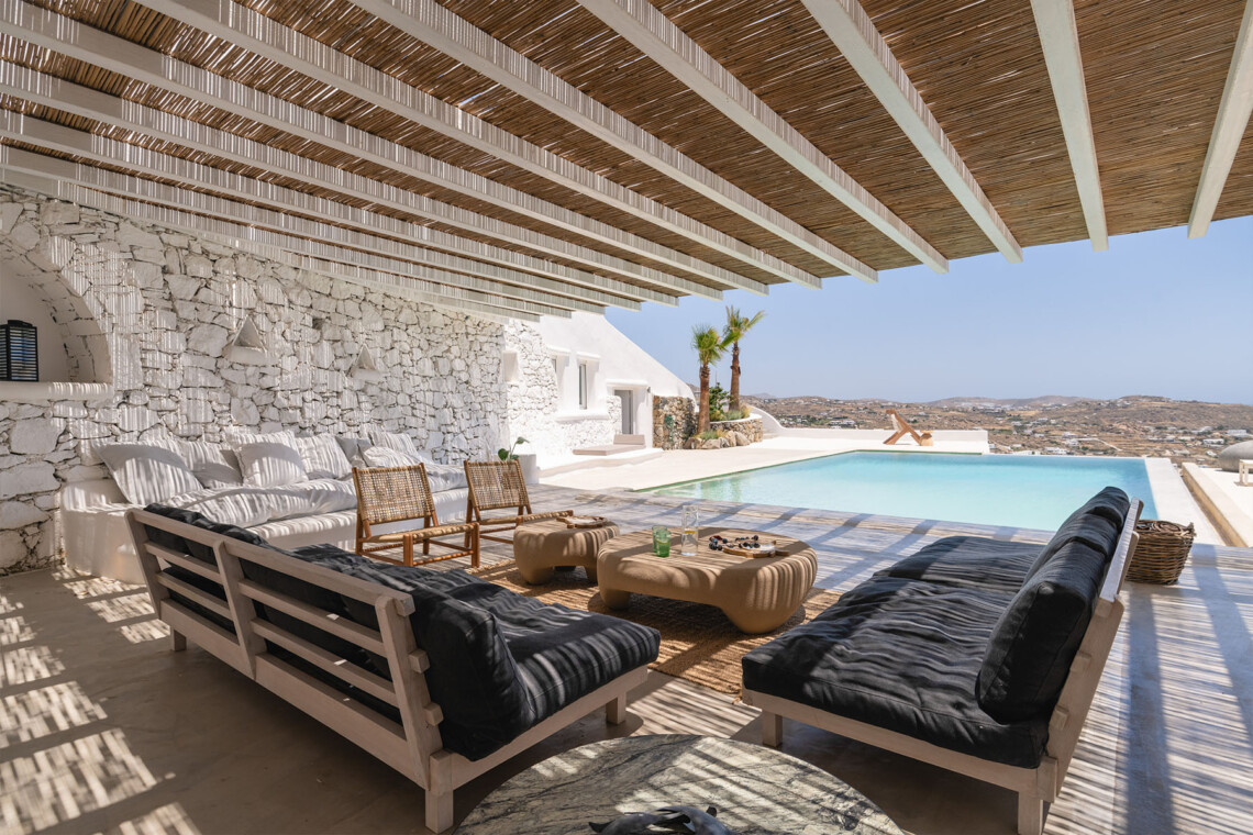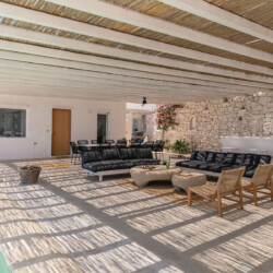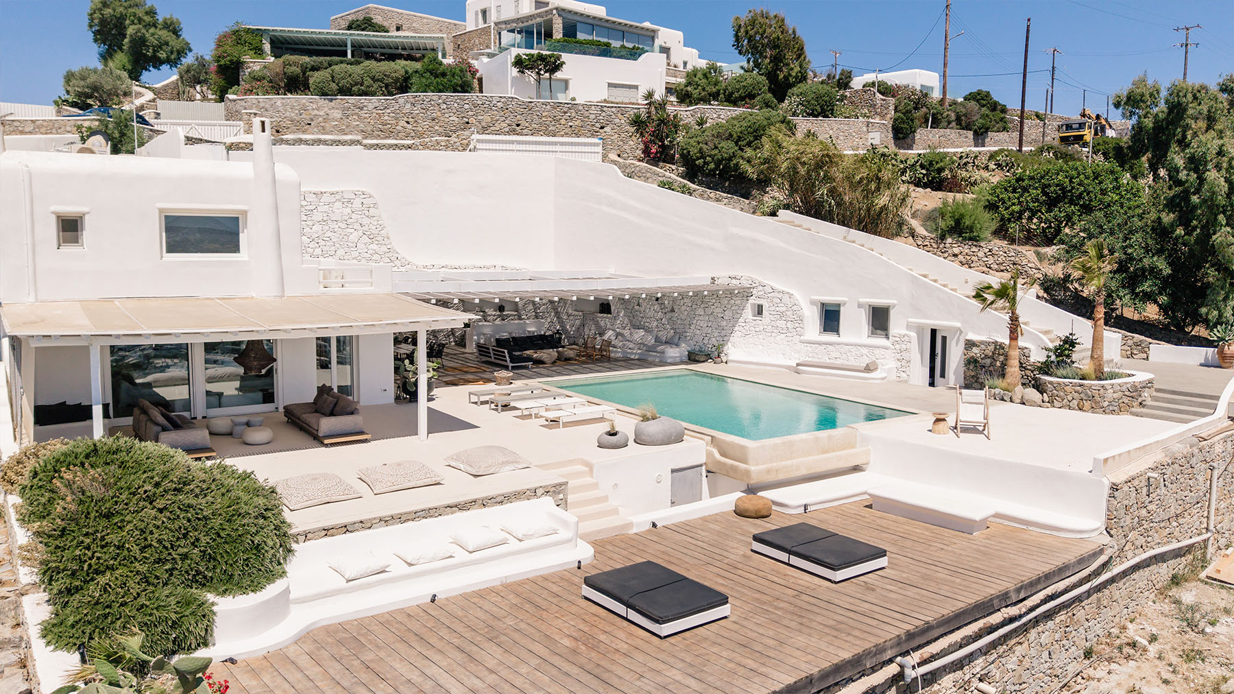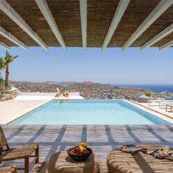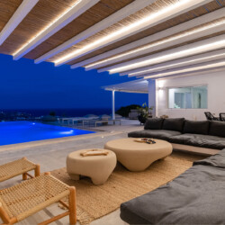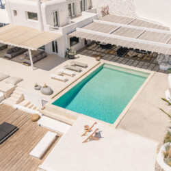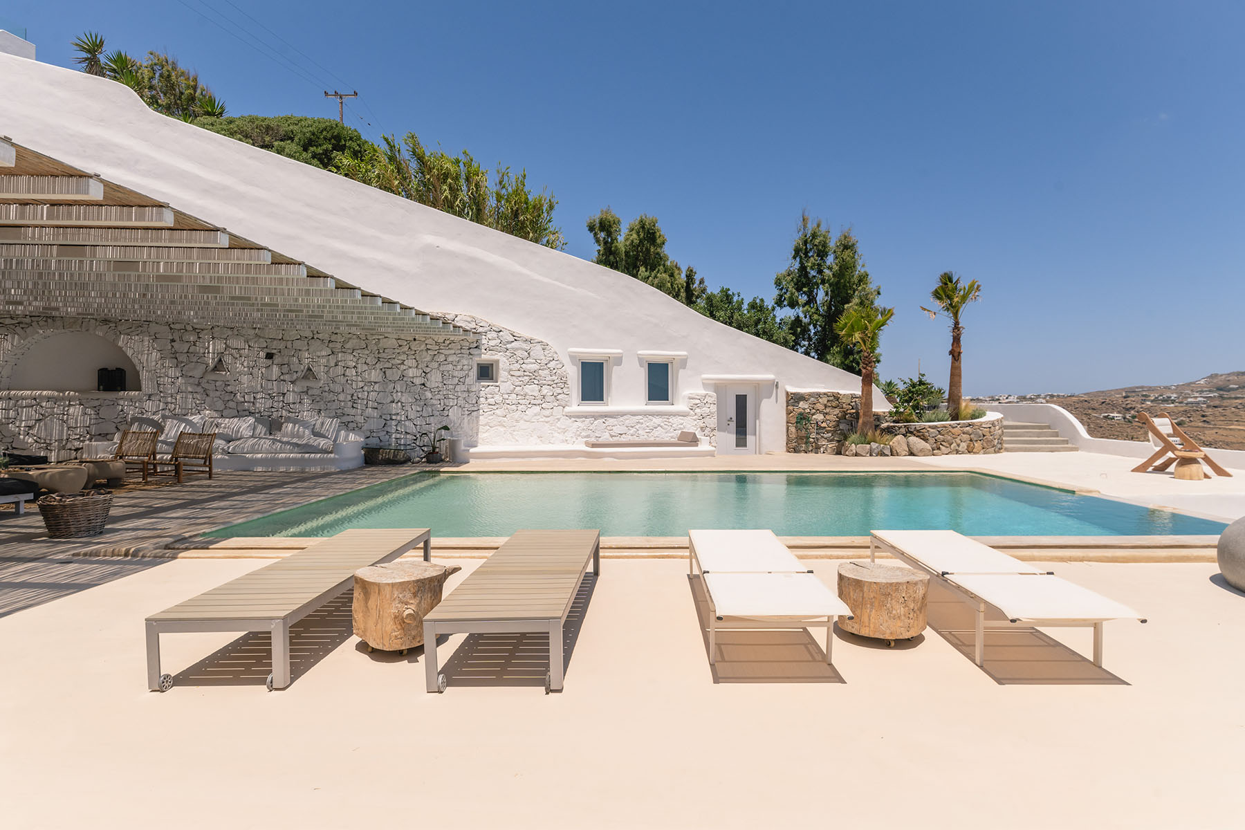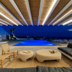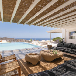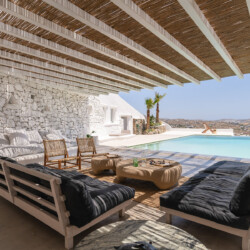 Inspired by traditional Mykonian houses, the villa’s organically shaped main house, independent guest studio, and pool guest house create spaces for quiet contemplation, leisurely meals, and alfresco dinners with friends and family. The location provides proximity to social beach vibes, shopping, and culinary scenes at popular spots like Nammos, Scorpios, Zuma, Budha Bar, Alemagou, and Mykonos Town.