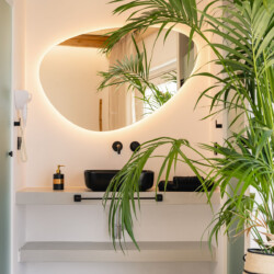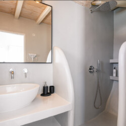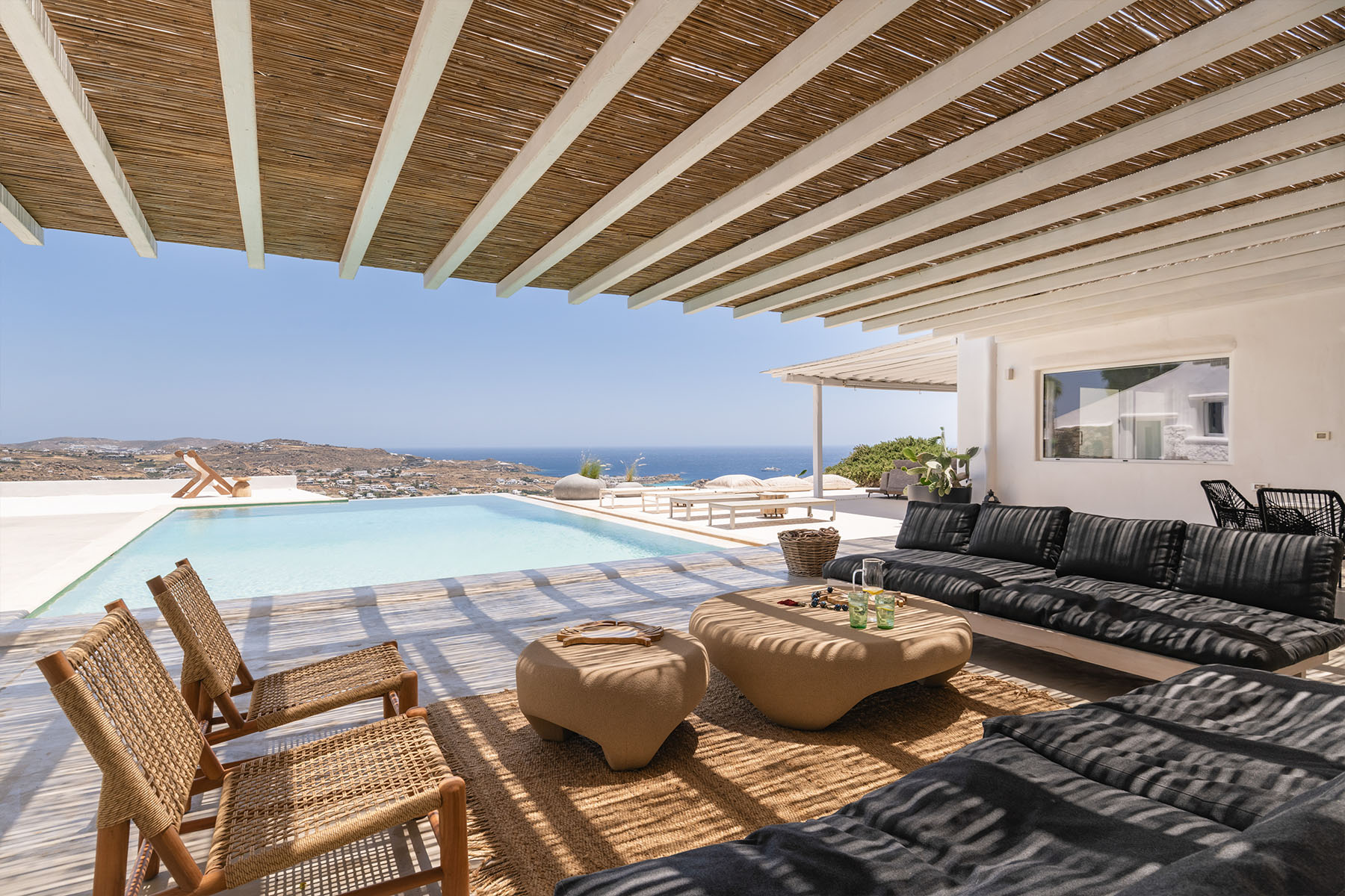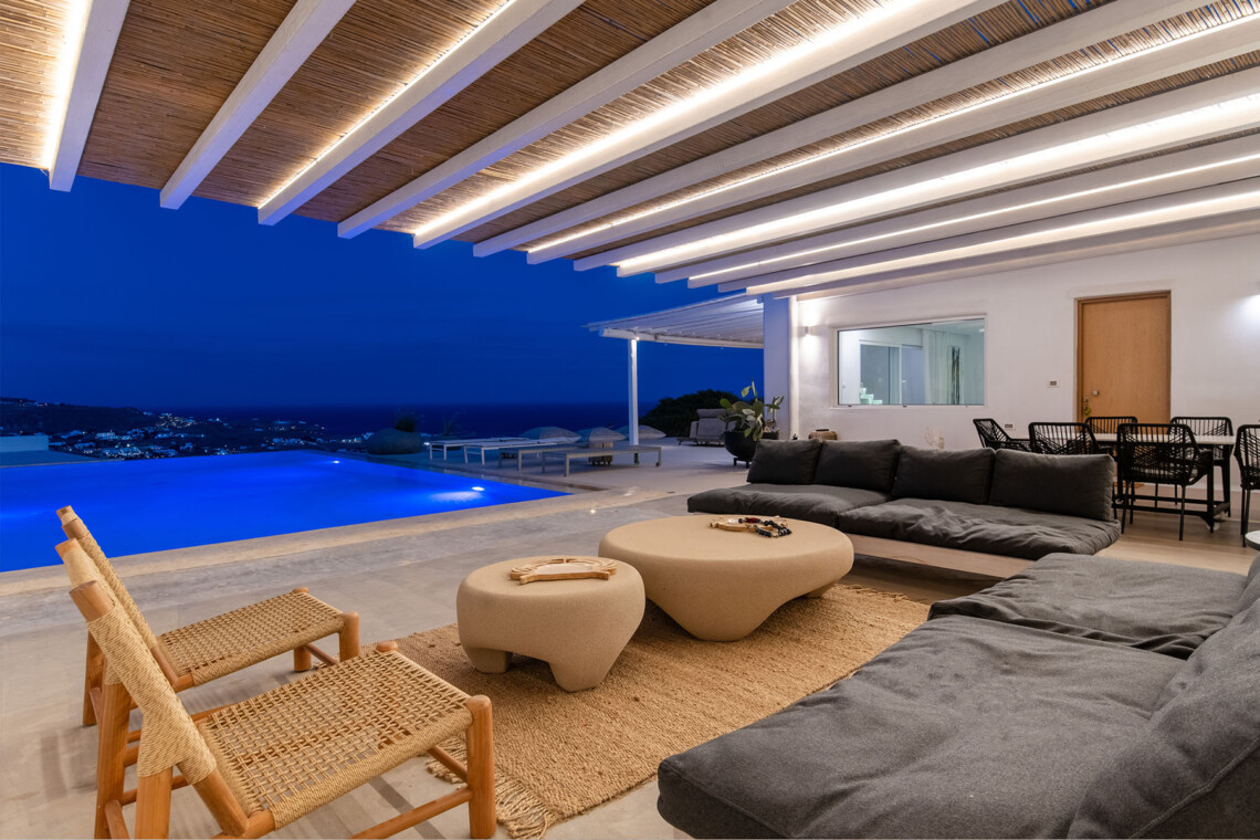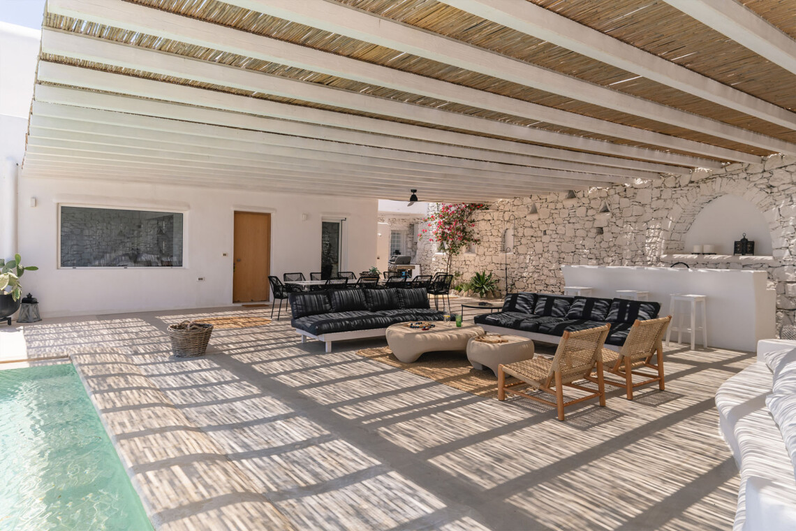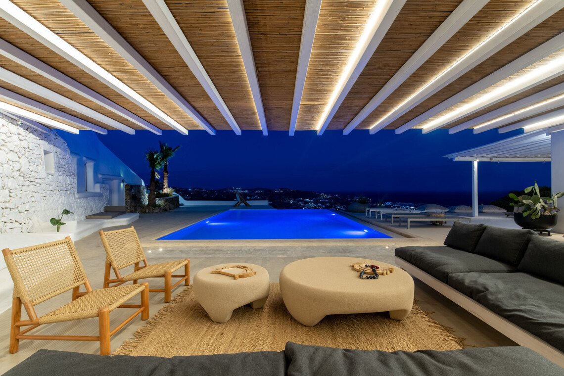 Inspired by traditional Mykonian houses, the villa’s organically shaped main house, independent guest studio, and pool guest house create spaces for quiet contemplation, leisurely meals, and alfresco dinners with friends and family. The location provides proximity to social beach vibes, shopping, and culinary scenes at popular spots like Nammos, Scorpios, Zuma, Budha Bar, Alemagou, and Mykonos Town.