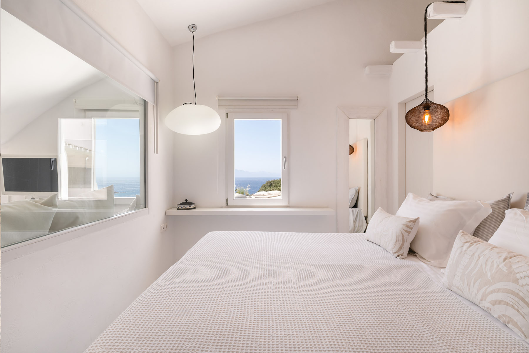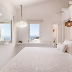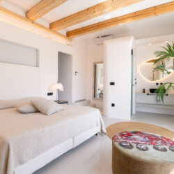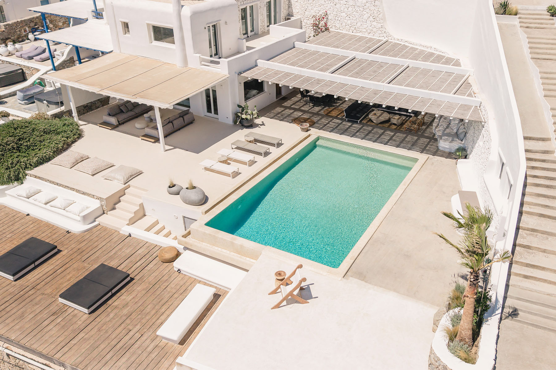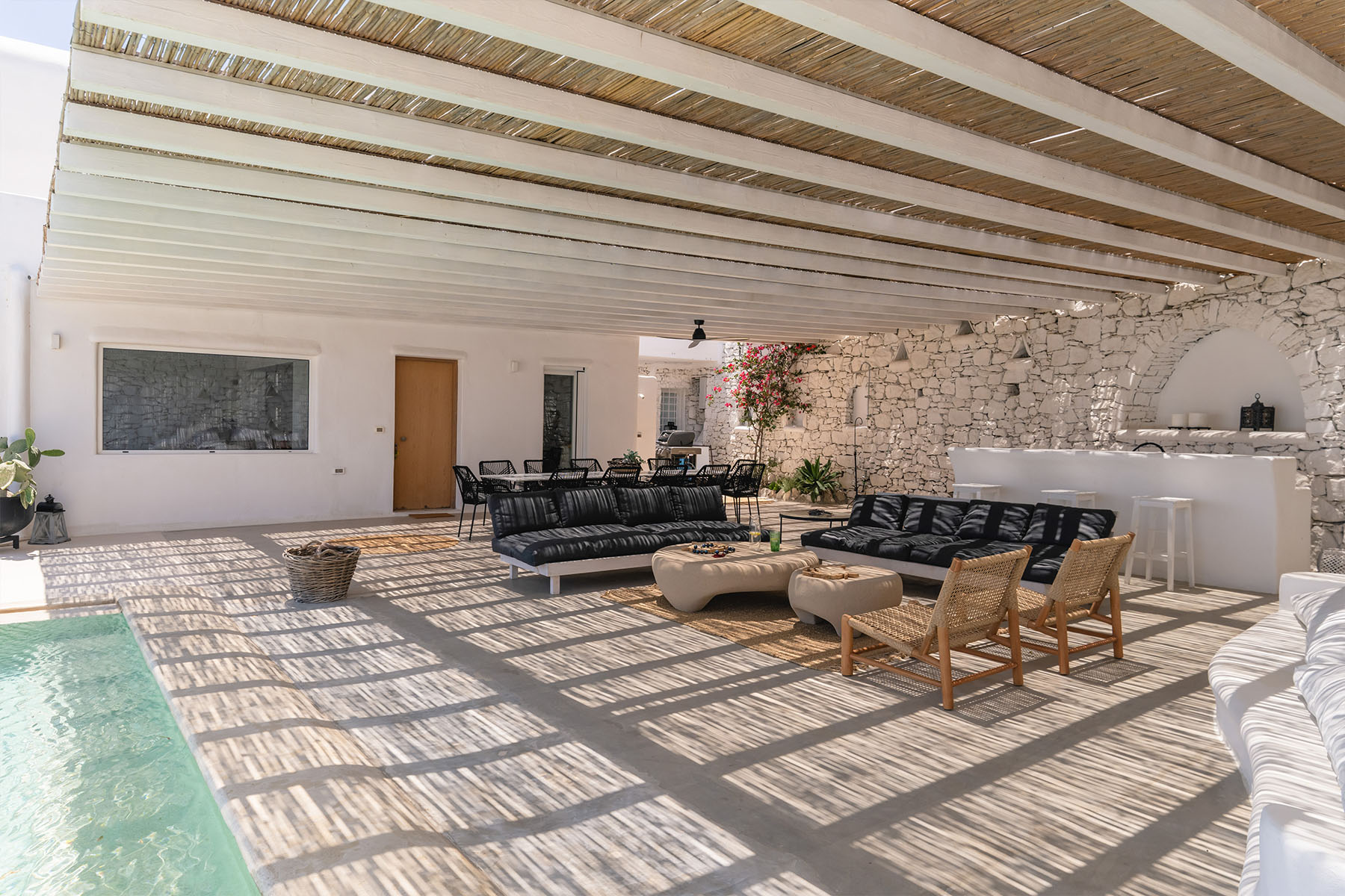 The villa accommodates guests in three residences for privacy: Main House (3 bedrooms), Guest House (2 bedrooms), and Guest Studio (1 bedroom), totaling 6 master bedrooms with en-suite bathrooms. With a dedicated villa host, guests can enjoy an uncomplicated stay and local wisdom for unique island experiences. The architectural style is modern and minimal, seamlessly blending with the island’s white-washed aesthetic. The lay out includes a fully refurbished private villa in a complex with a large private pool and spacious outdoor lounging and dining areas.