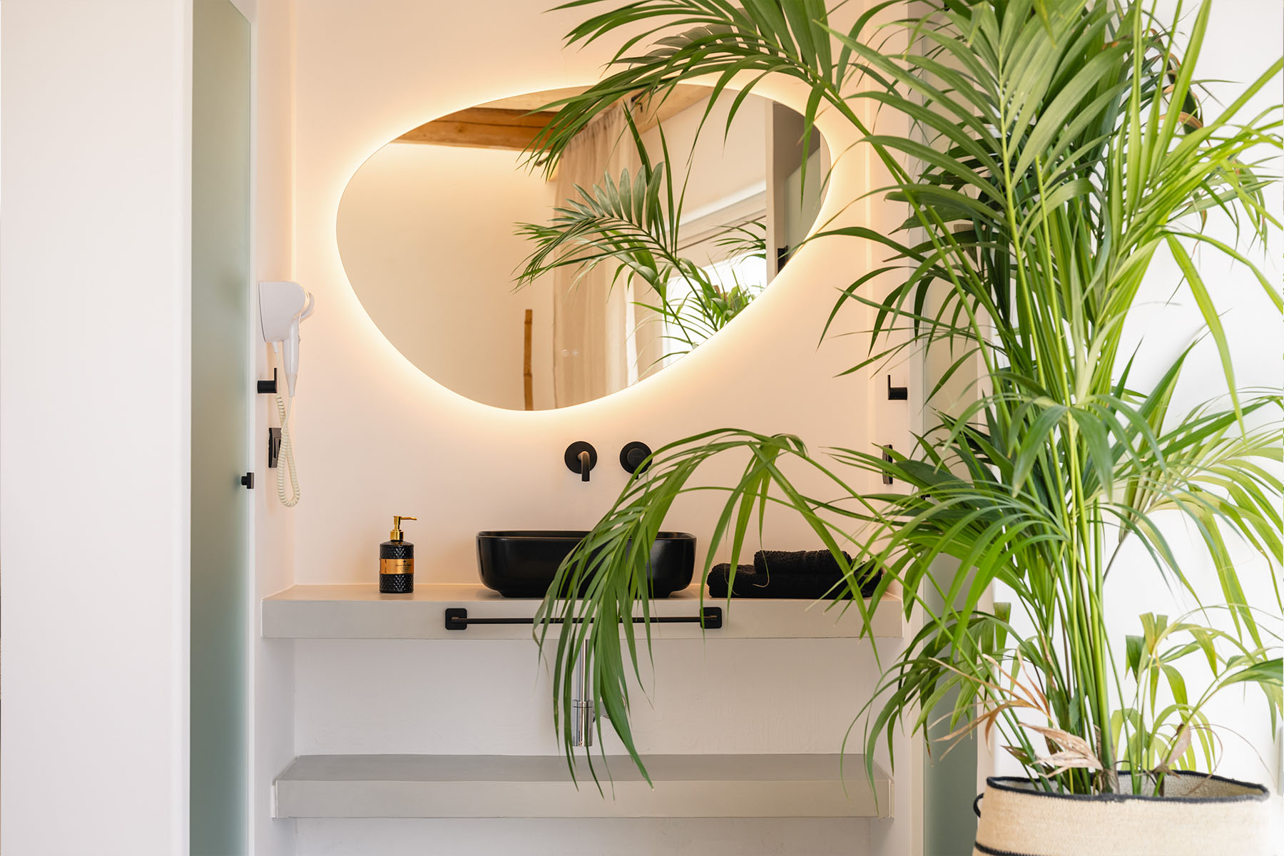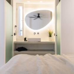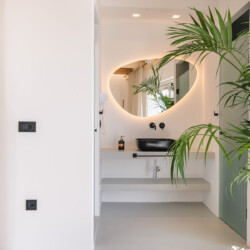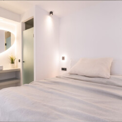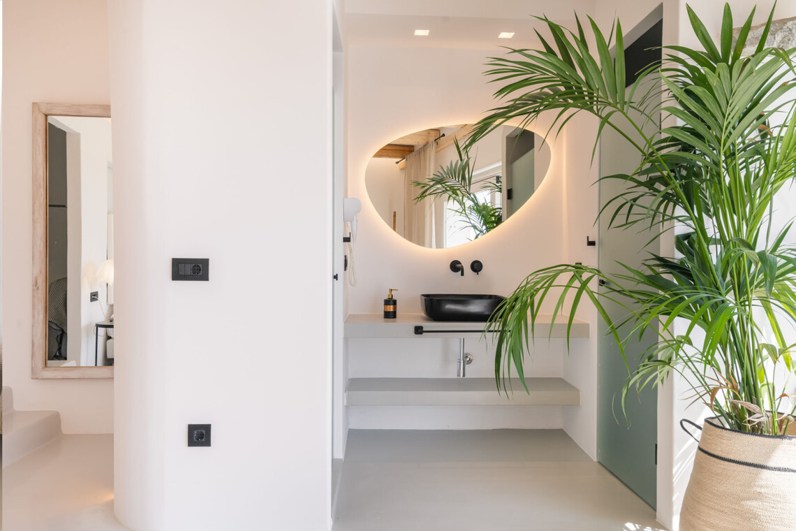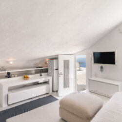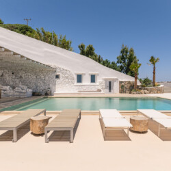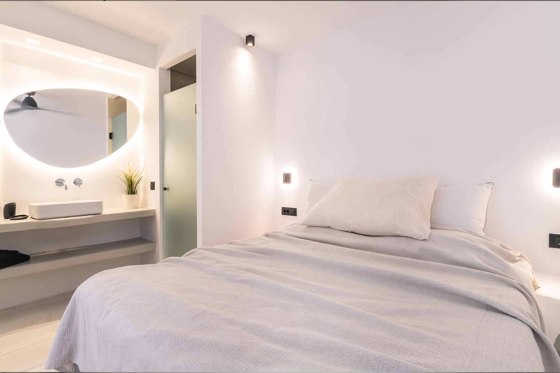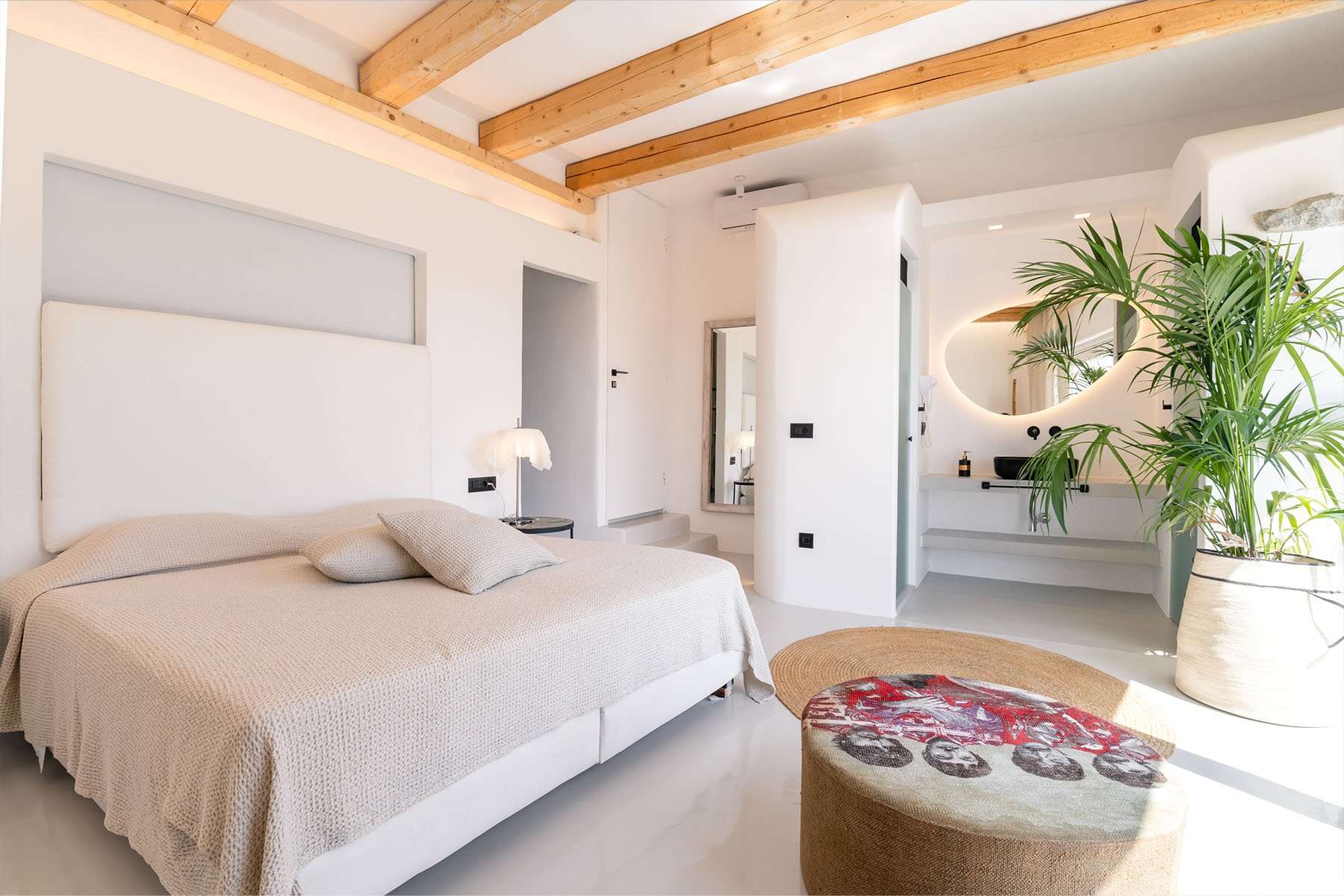 The villa accommodates guests in three residences for privacy: Main House (3 bedrooms), Guest House (2 bedrooms), and Guest Studio (1 bedroom), totaling 6 master bedrooms with en-suite bathrooms. With a dedicated villa host, guests can enjoy an uncomplicated stay and local wisdom for unique island experiences. The architectural style is modern and minimal, seamlessly blending with the island’s white-washed aesthetic. The lay out includes a fully refurbished private villa in a complex with a large private pool and spacious outdoor lounging and dining areas.