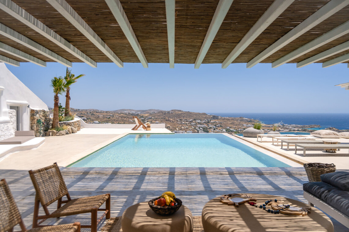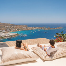Villa Pythagoras offers a sanctuary with ample open-air terraces providing breathtaking views of Psarou, Platys Gialos, Agia Anna, Paraga, and the Cycladic coastline. Positioned above Nammos, the villa is part of the vibrant and wind-protected Psarou Bay and Nammos village, offering an energetic setting with fireworks, glamorous boats, turquoise waters, and fantastic parties.