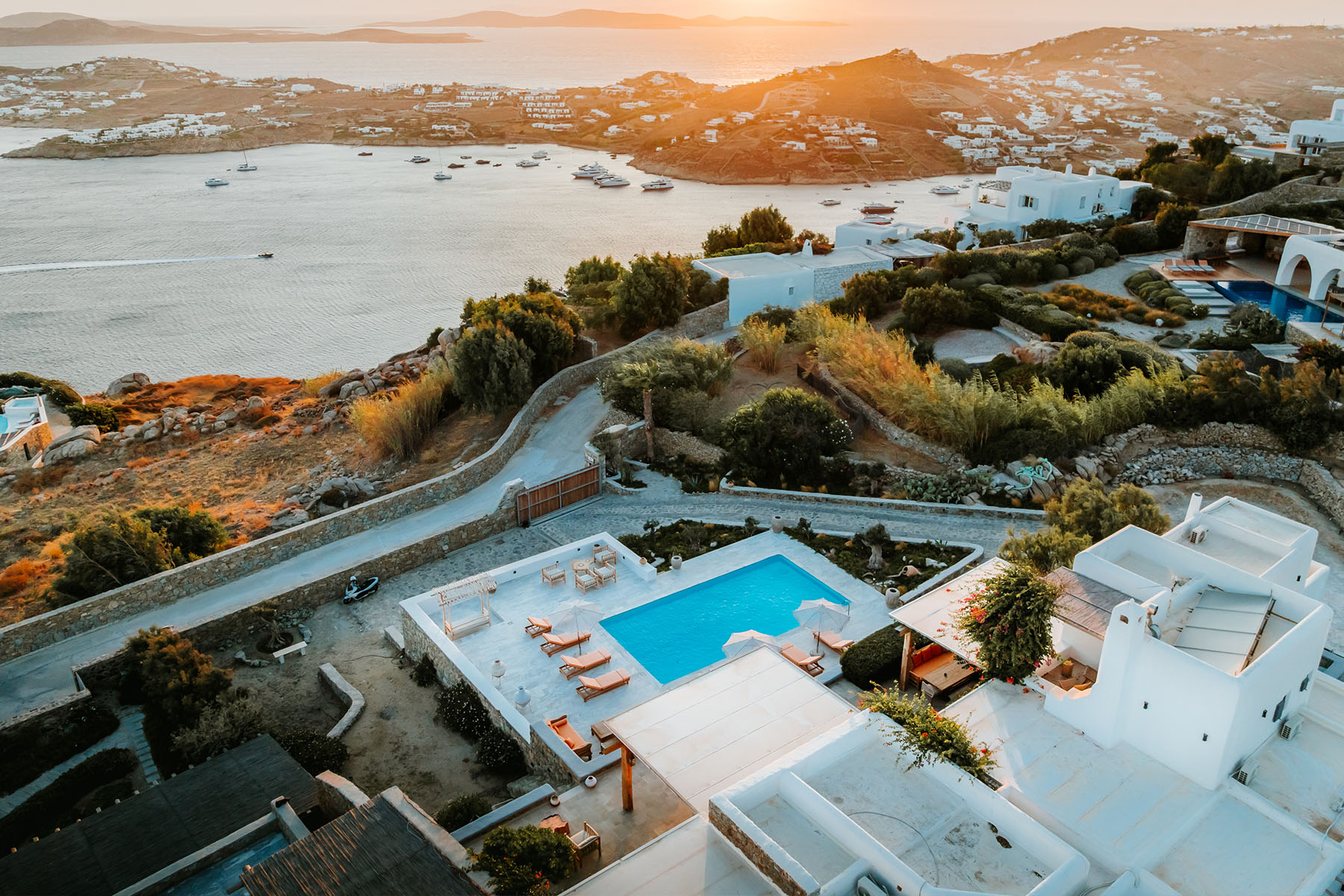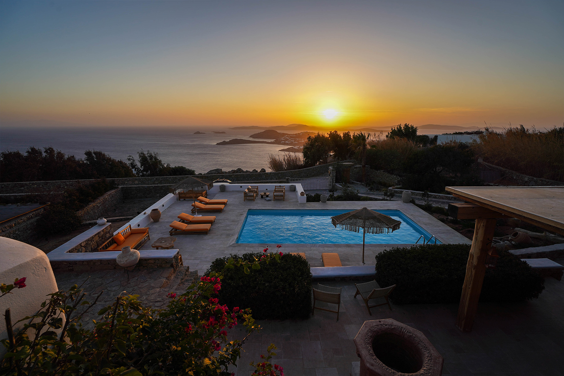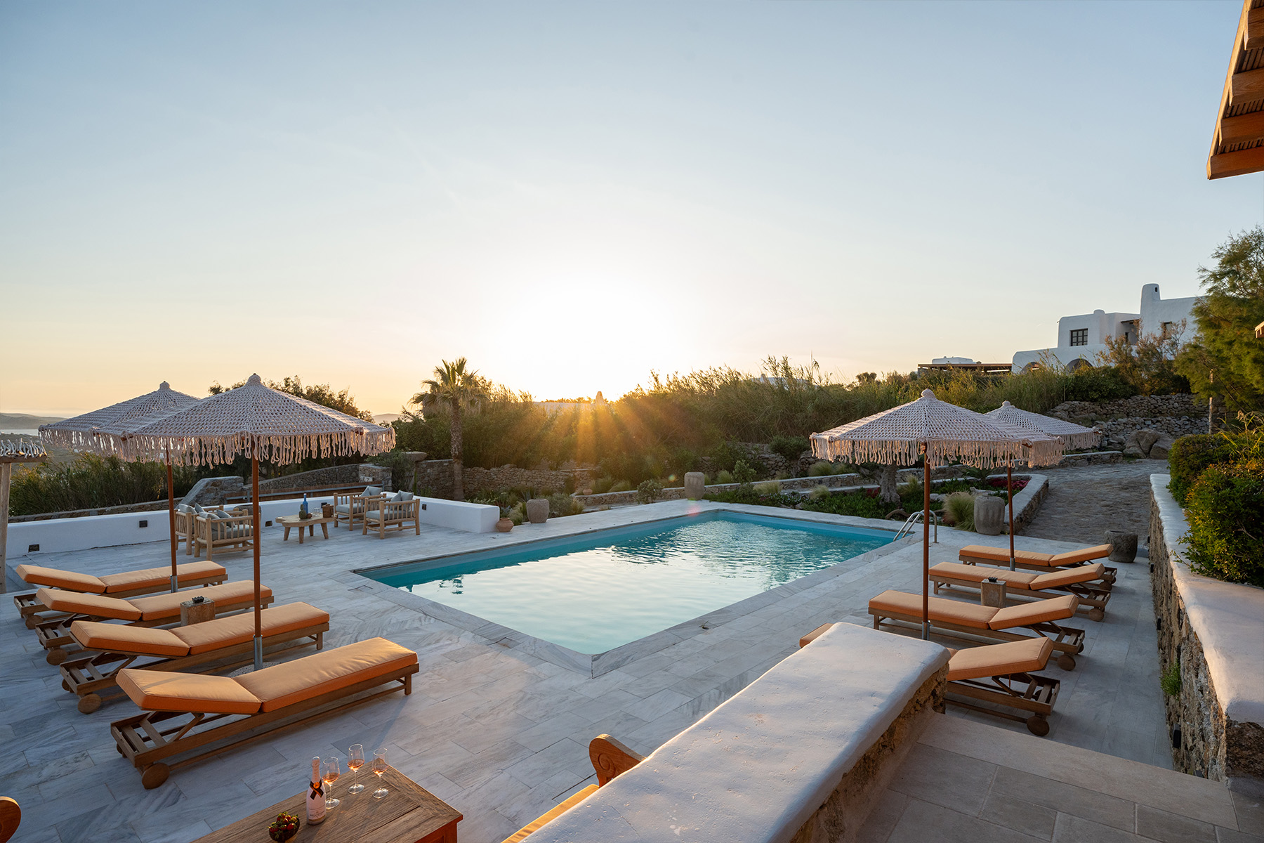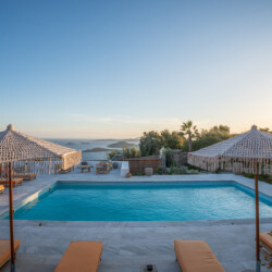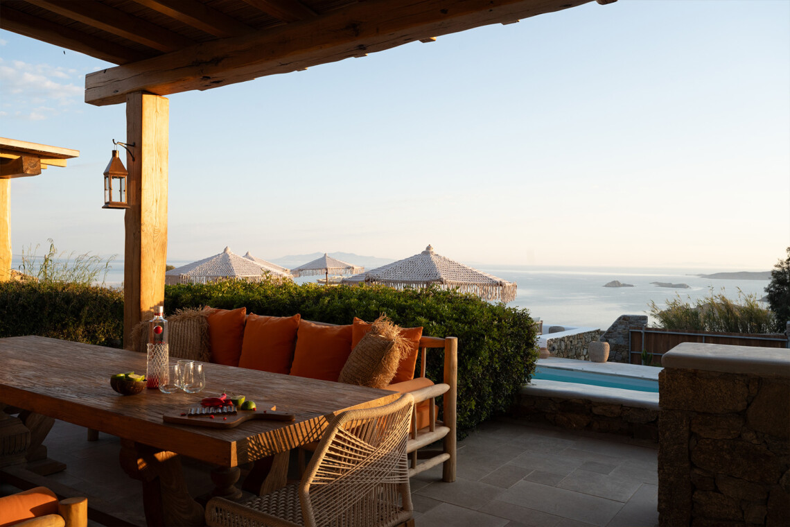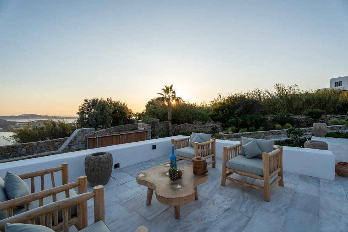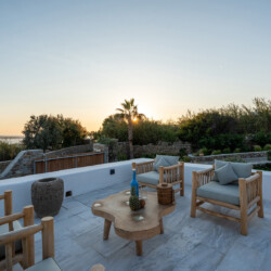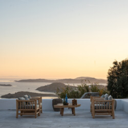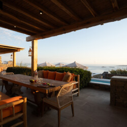 Outdoors, Villa Zanet invites guests to unwind within 2,500 m² of beautifully landscaped terraces, lush gardens, and a large swimming pool area – currently being fully renovated for the upcoming season. A professional-grade outdoor kitchen, shaded dining space, and multiple sea-view lounges set the stage for unforgettable alfresco gatherings. Daily housekeeping and attentive live-in staff ensure a seamless stay, while the villa’s refined aesthetic and breathtaking outlook embody the effortless luxury of Mykonos.