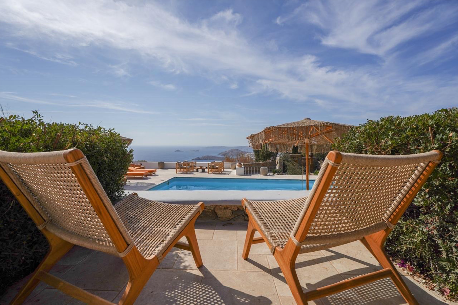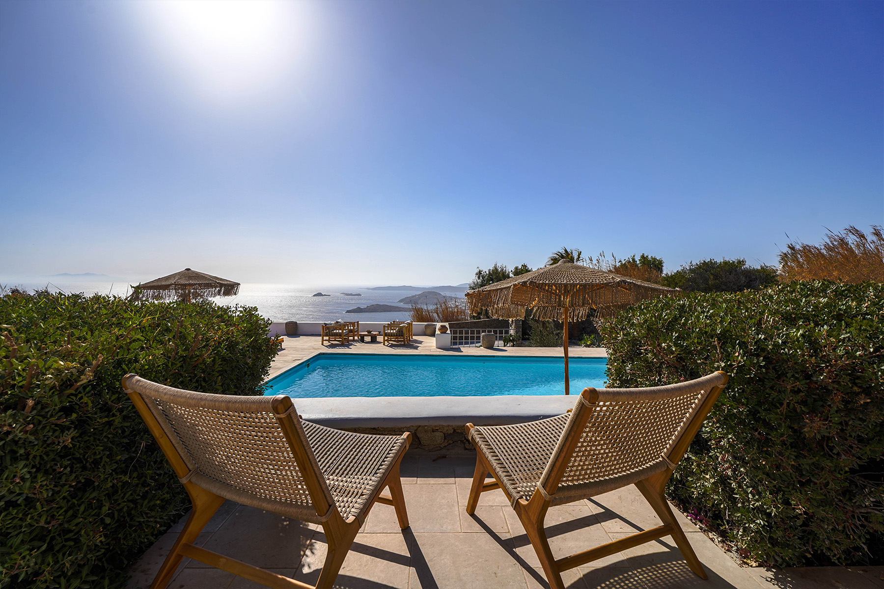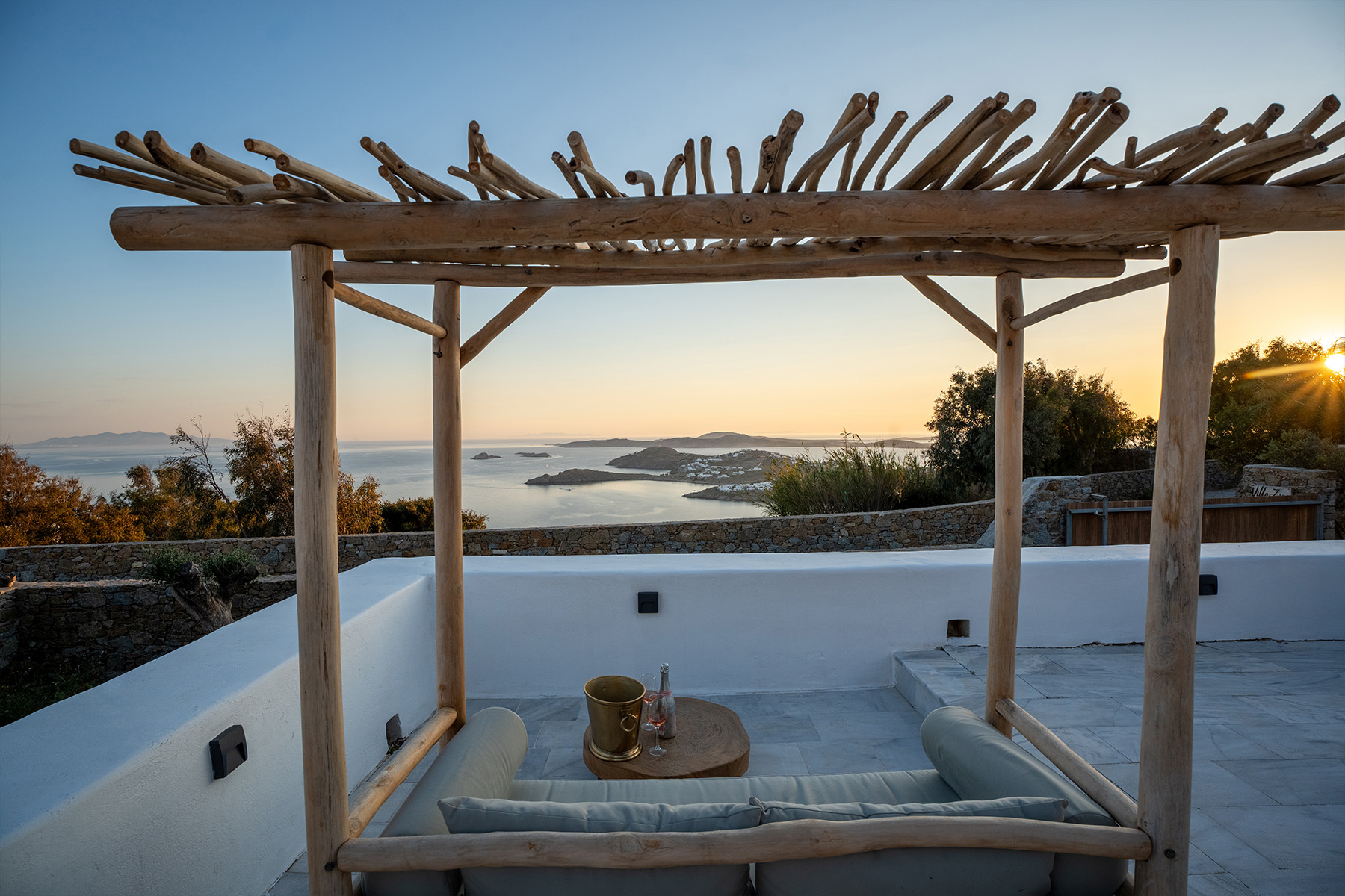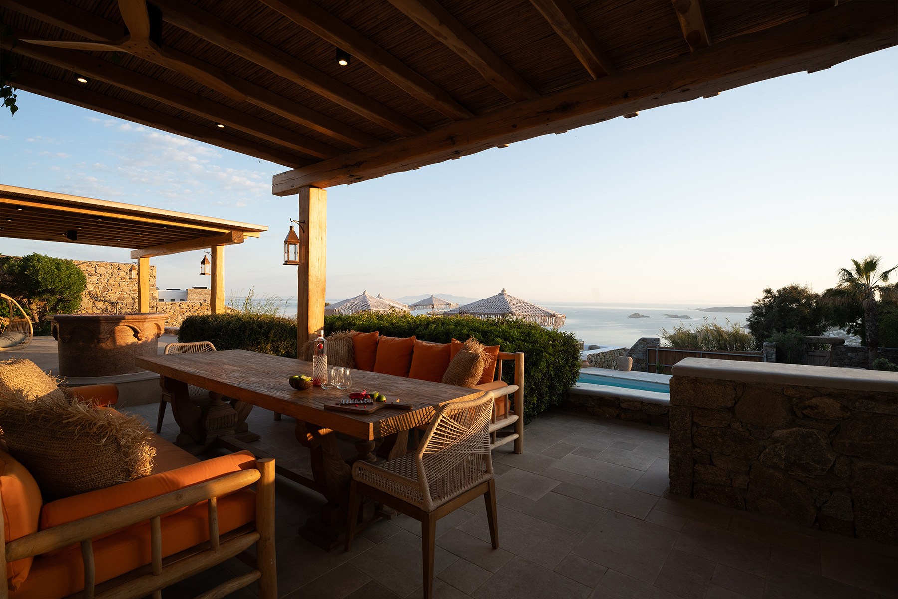 Outdoors, Villa Zanet invites guests to unwind within 2,500 m² of beautifully landscaped terraces, lush gardens, and a large swimming pool area – currently being fully renovated for the upcoming season. A professional-grade outdoor kitchen, shaded dining space, and multiple sea-view lounges set the stage for unforgettable alfresco gatherings. Daily housekeeping and attentive live-in staff ensure a seamless stay, while the villa’s refined aesthetic and breathtaking outlook embody the effortless luxury of Mykonos.