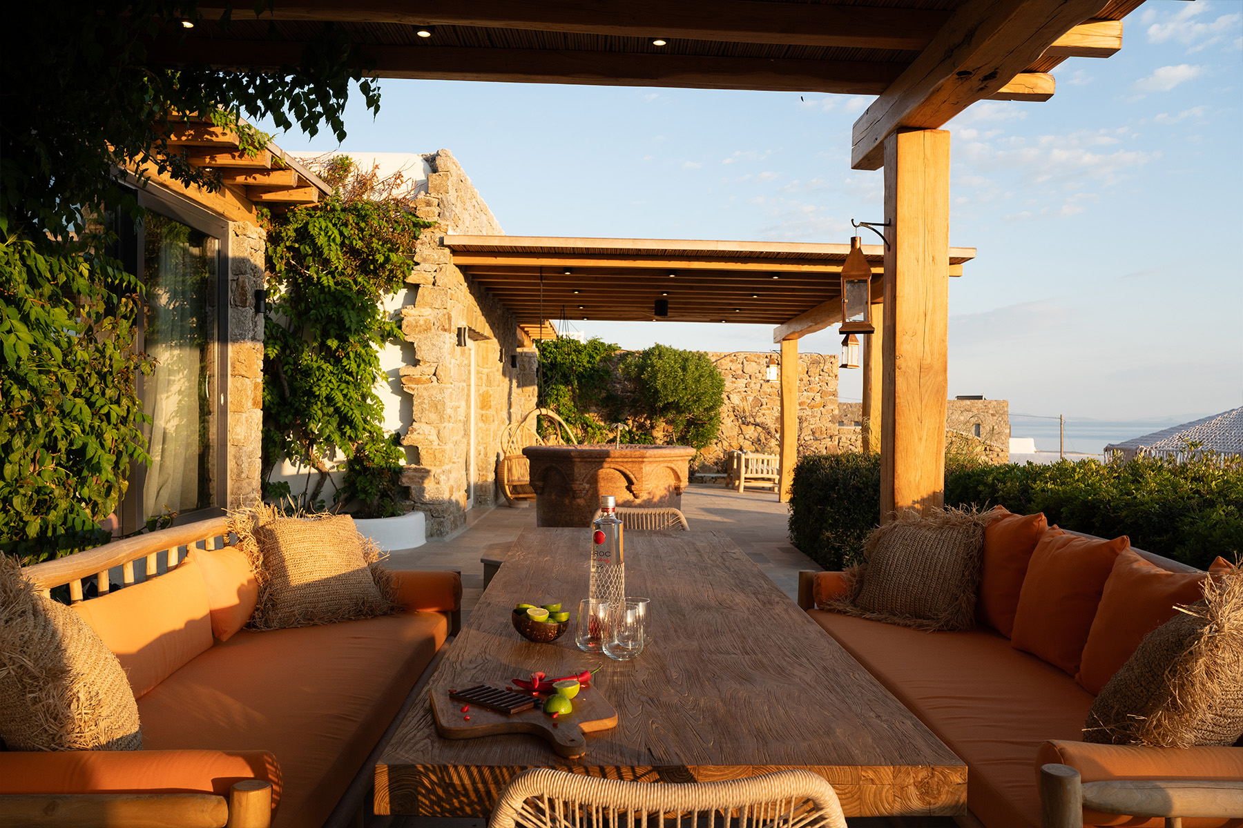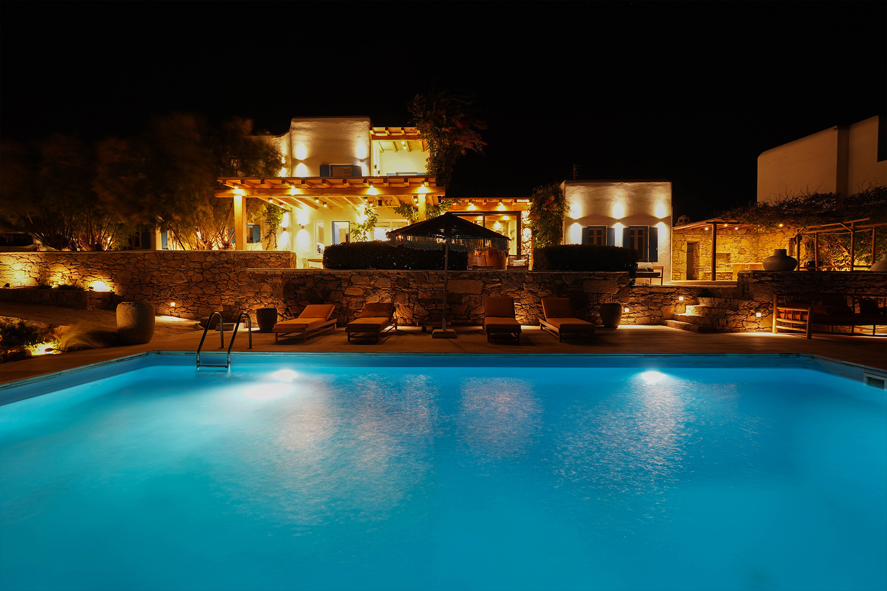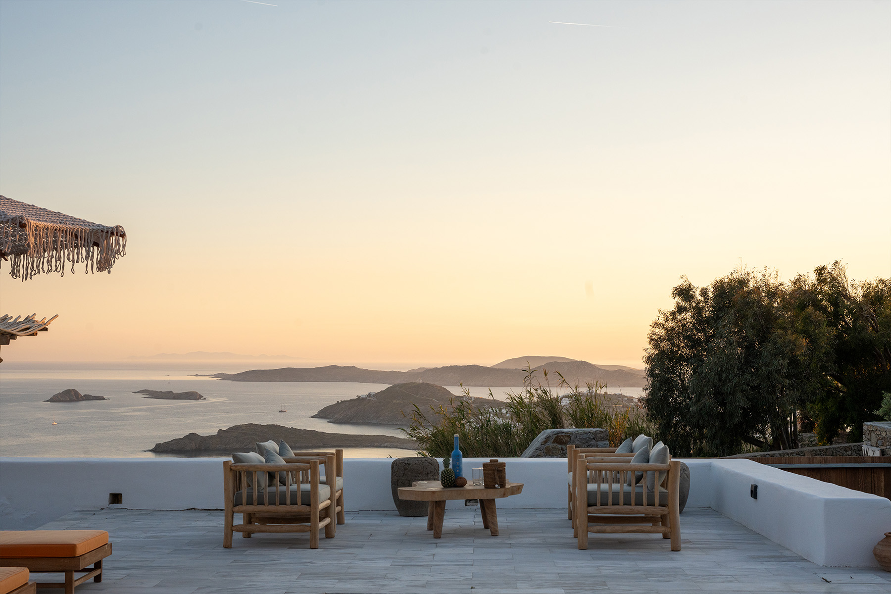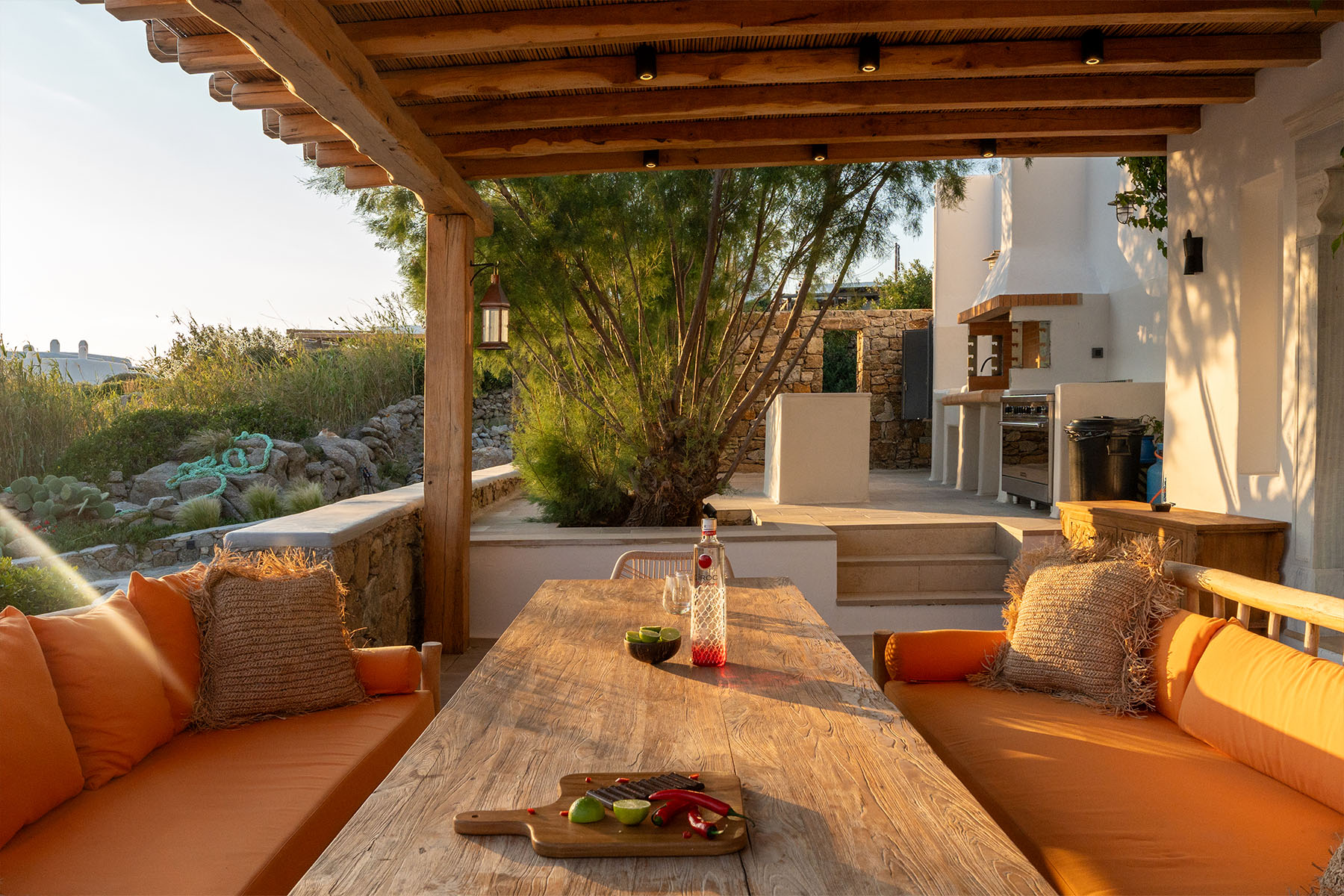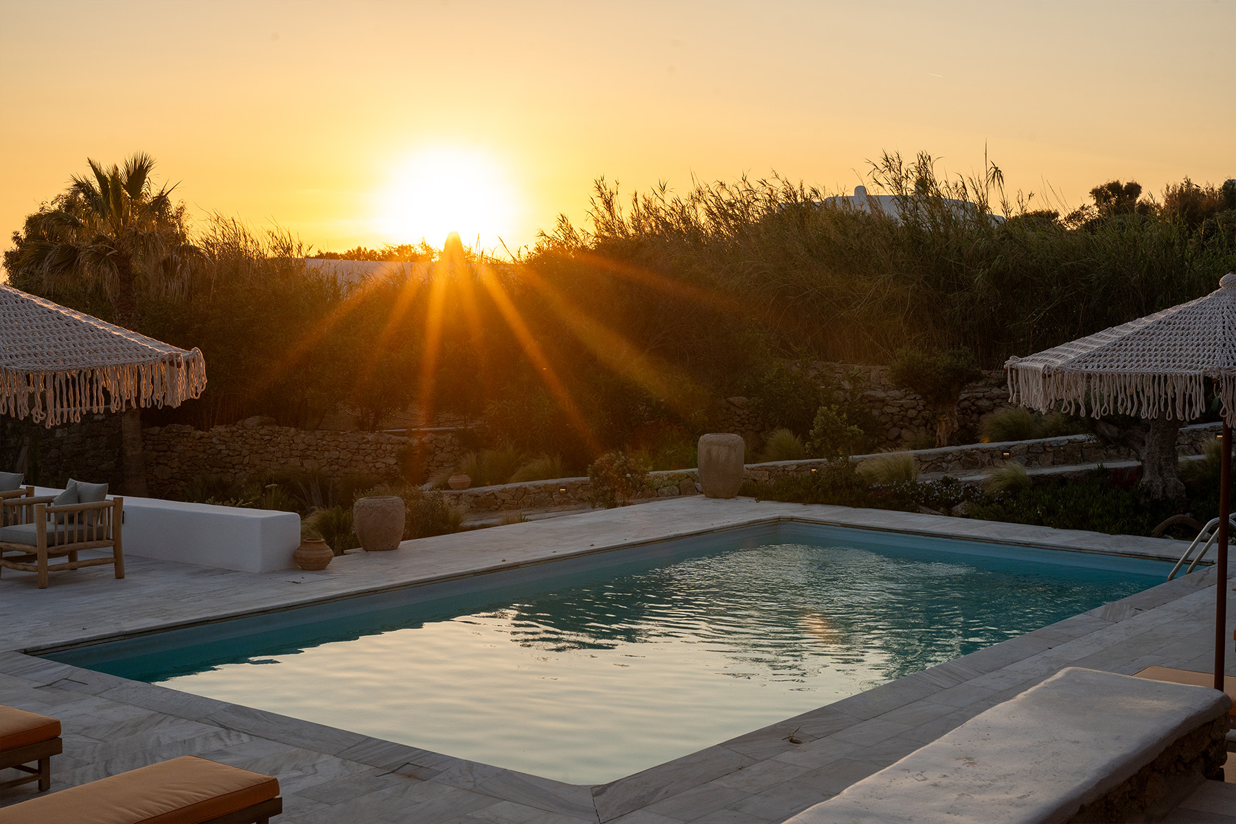 Outdoors, Villa Zanet invites guests to unwind within 2,500 m² of beautifully landscaped terraces, lush gardens, and a large swimming pool area – currently being fully renovated for the upcoming season. A professional-grade outdoor kitchen, shaded dining space, and multiple sea-view lounges set the stage for unforgettable alfresco gatherings. Daily housekeeping and attentive live-in staff ensure a seamless stay, while the villa’s refined aesthetic and breathtaking outlook embody the effortless luxury of Mykonos.