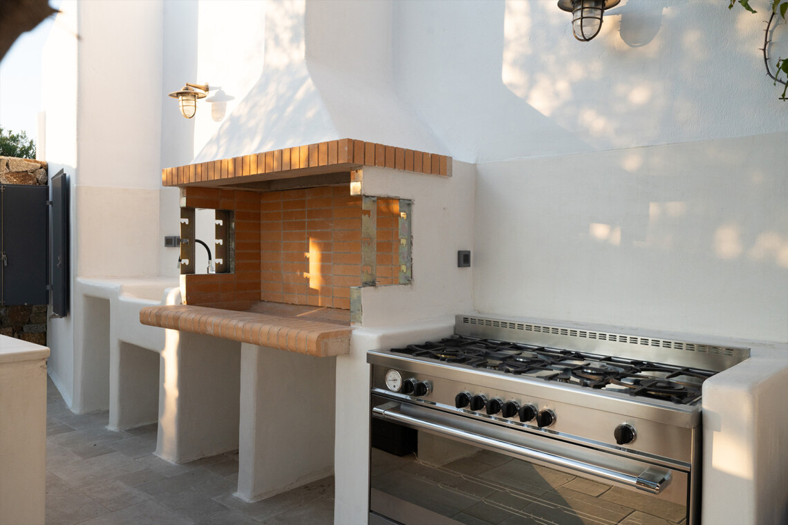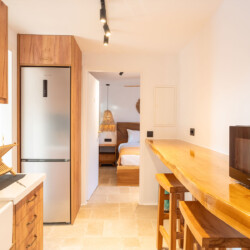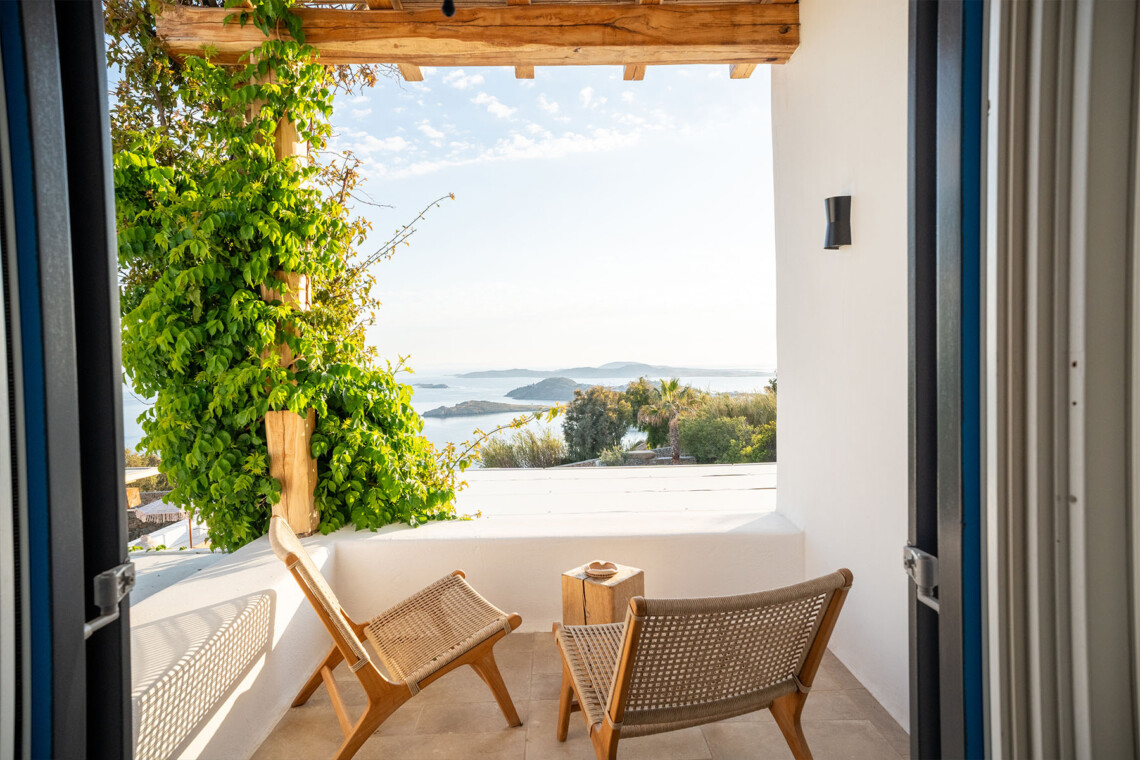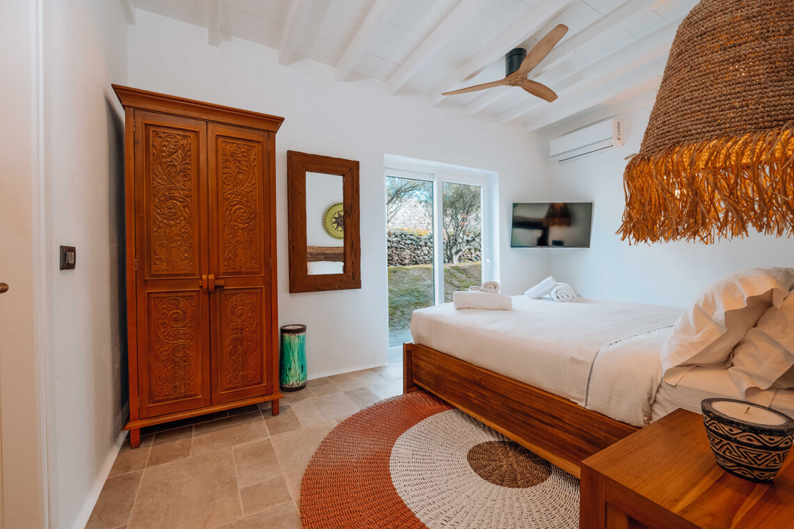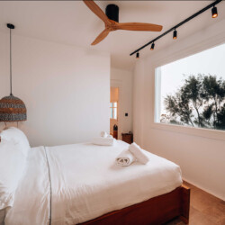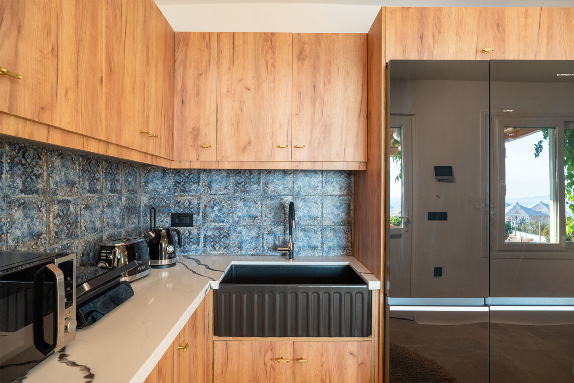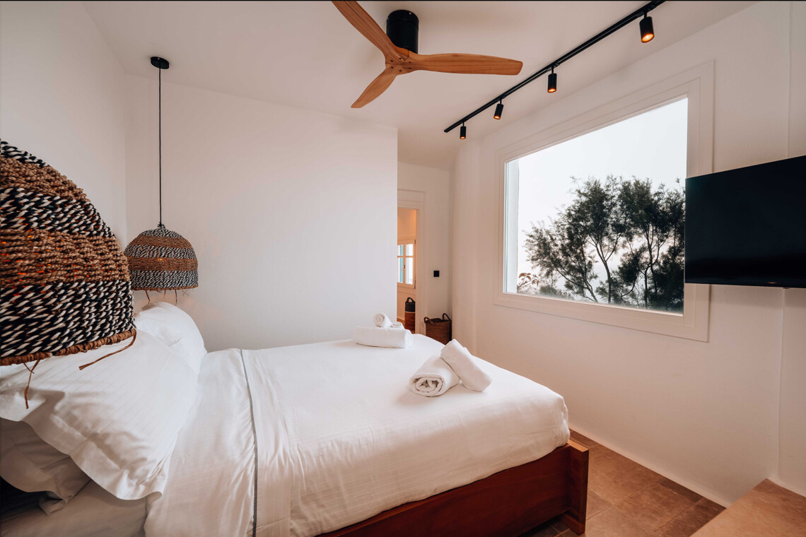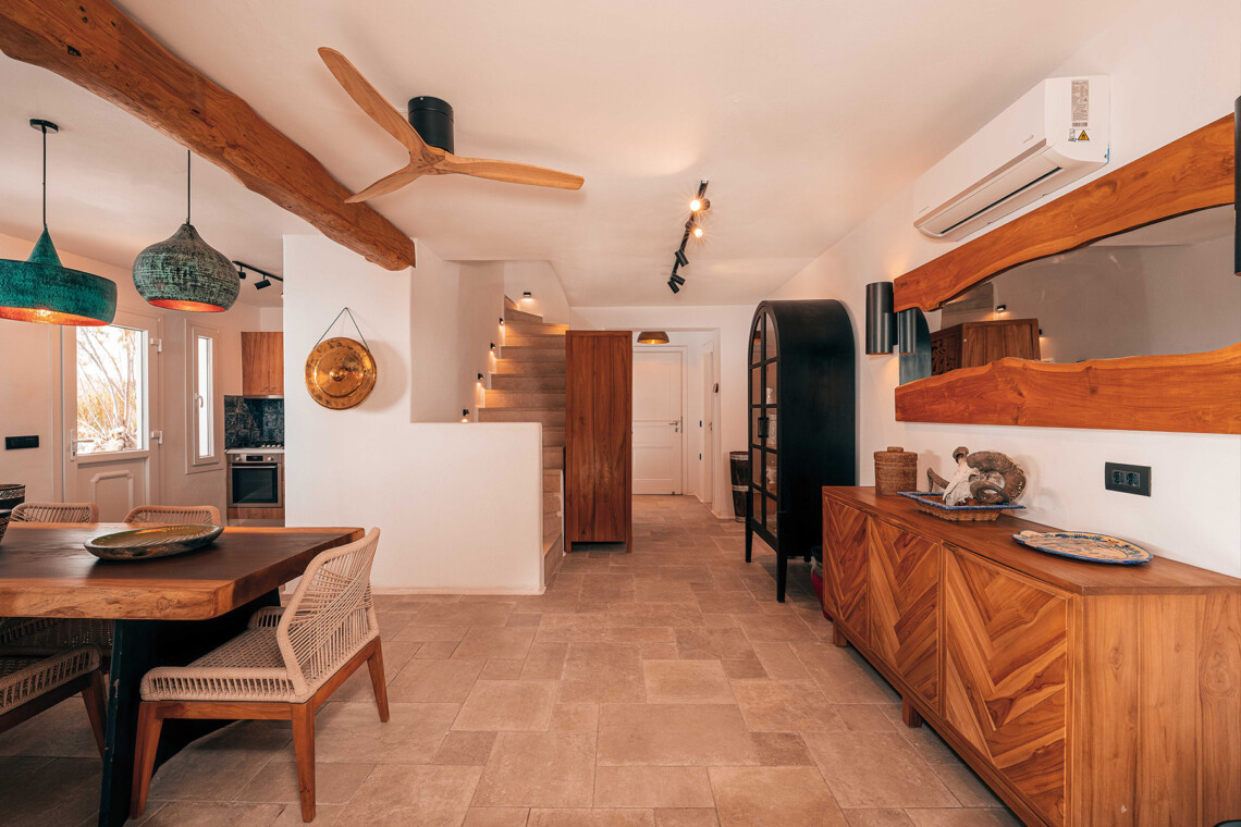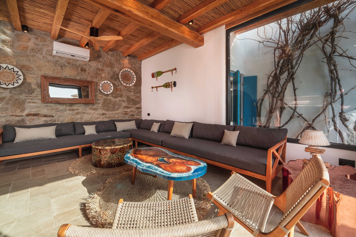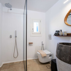 The main villa features a bright living room, dining space, and a fully equipped kitchen, along with four en-suite bedrooms – two on the ground level and two on the upper floor with private balconies overlooking the Aegean. An additional underground suite with its own entrance provides extra independence. The second building includes a kitchenette, two queen bedrooms with en-suite bathrooms, and a wine cellar, ensuring comfort and autonomy for guests who appreciate their own private space.