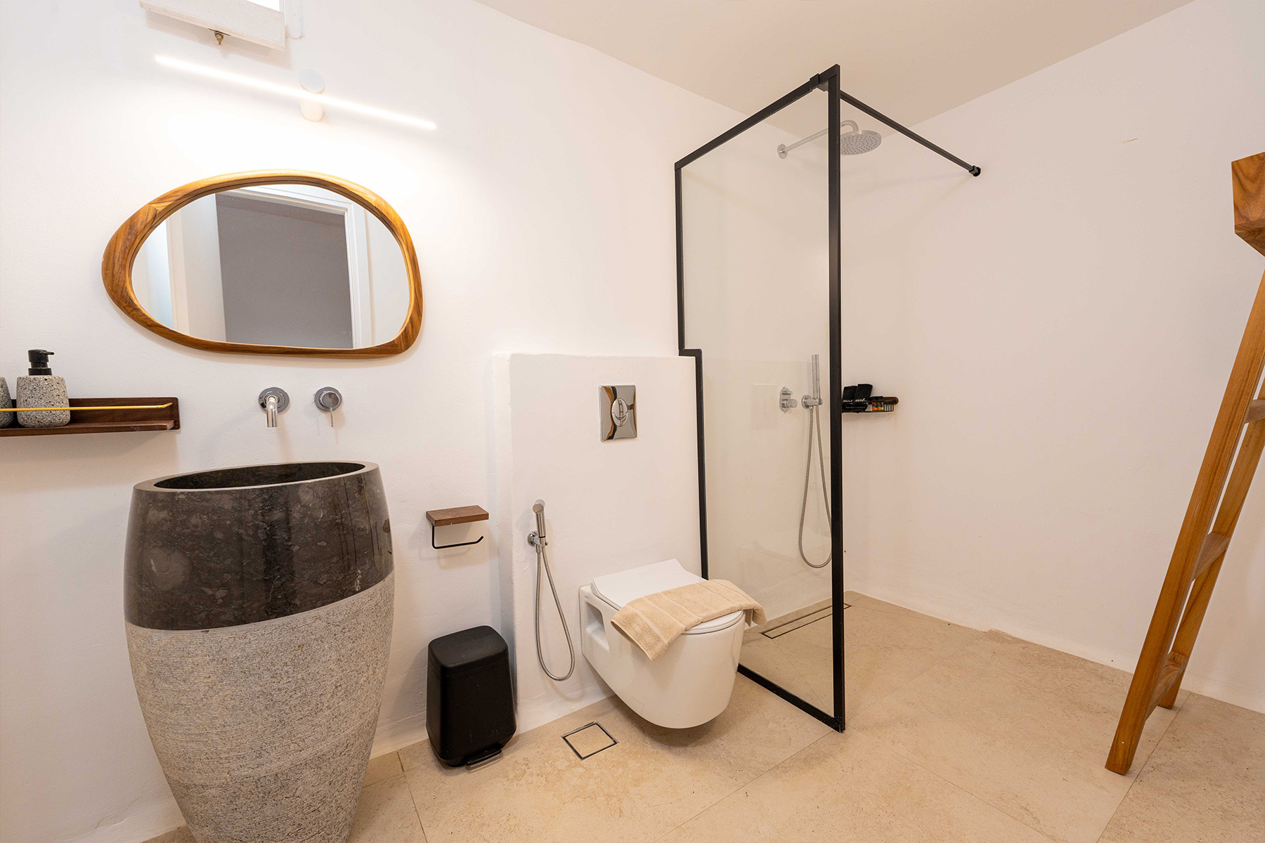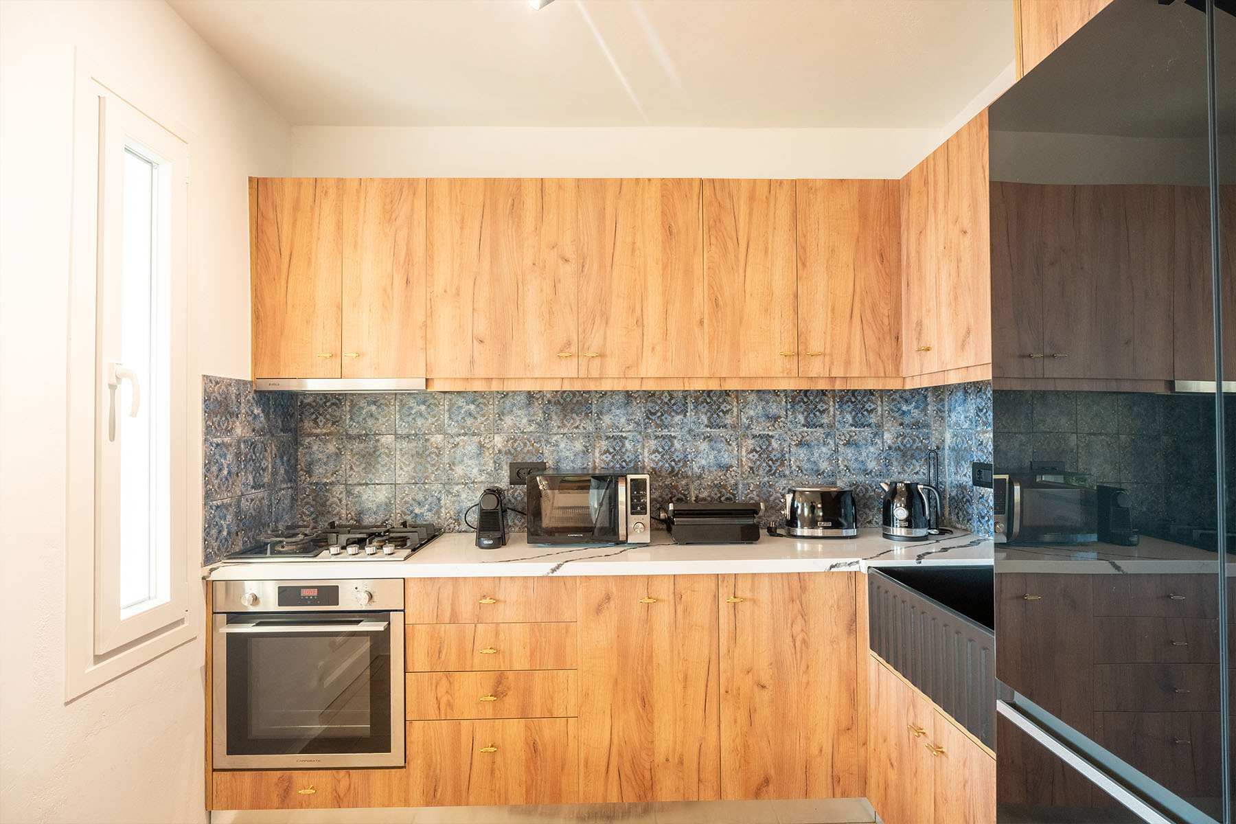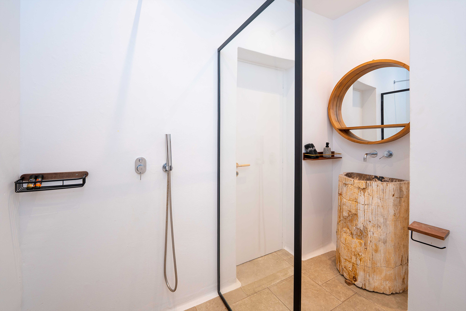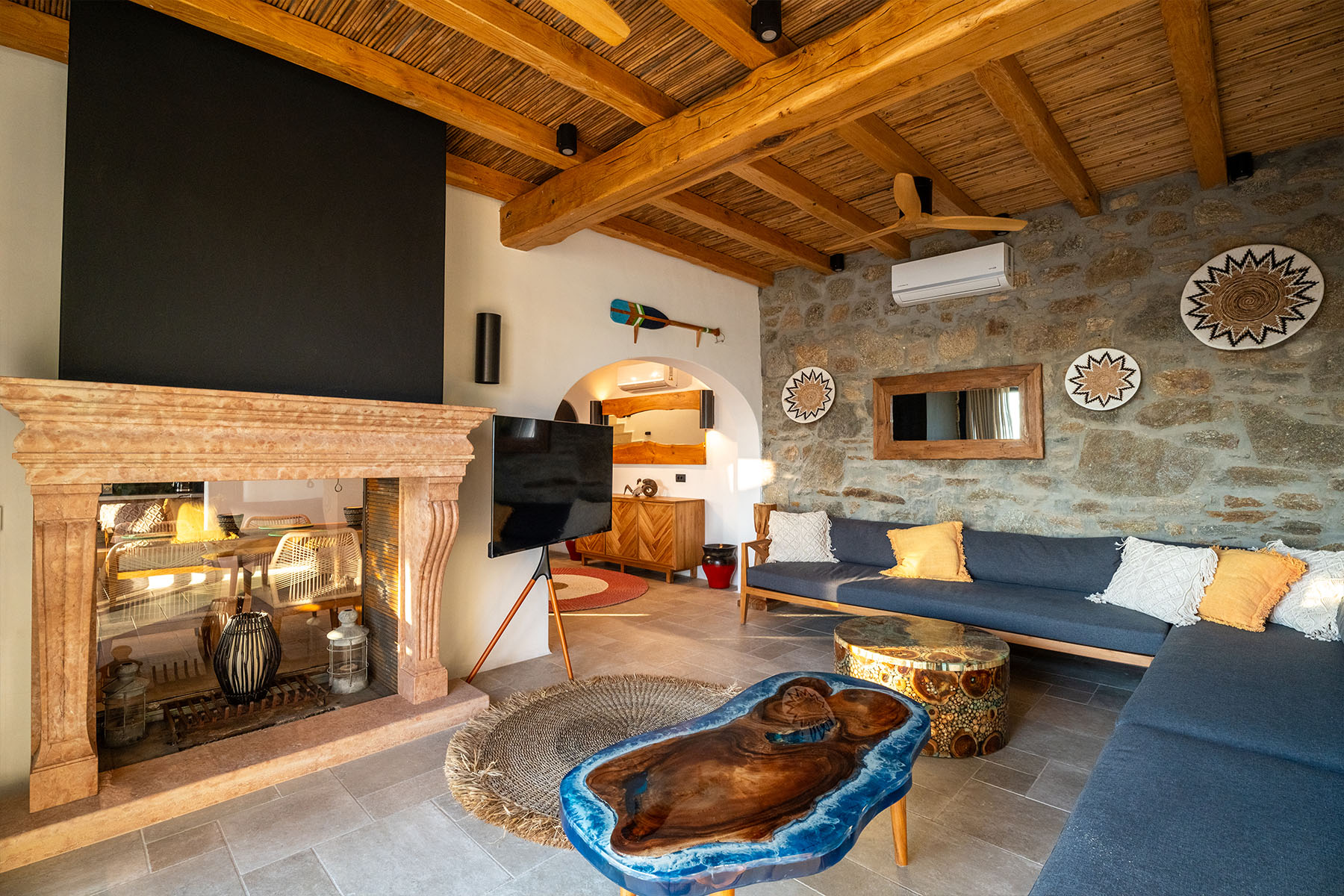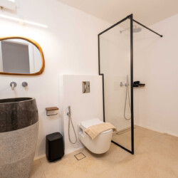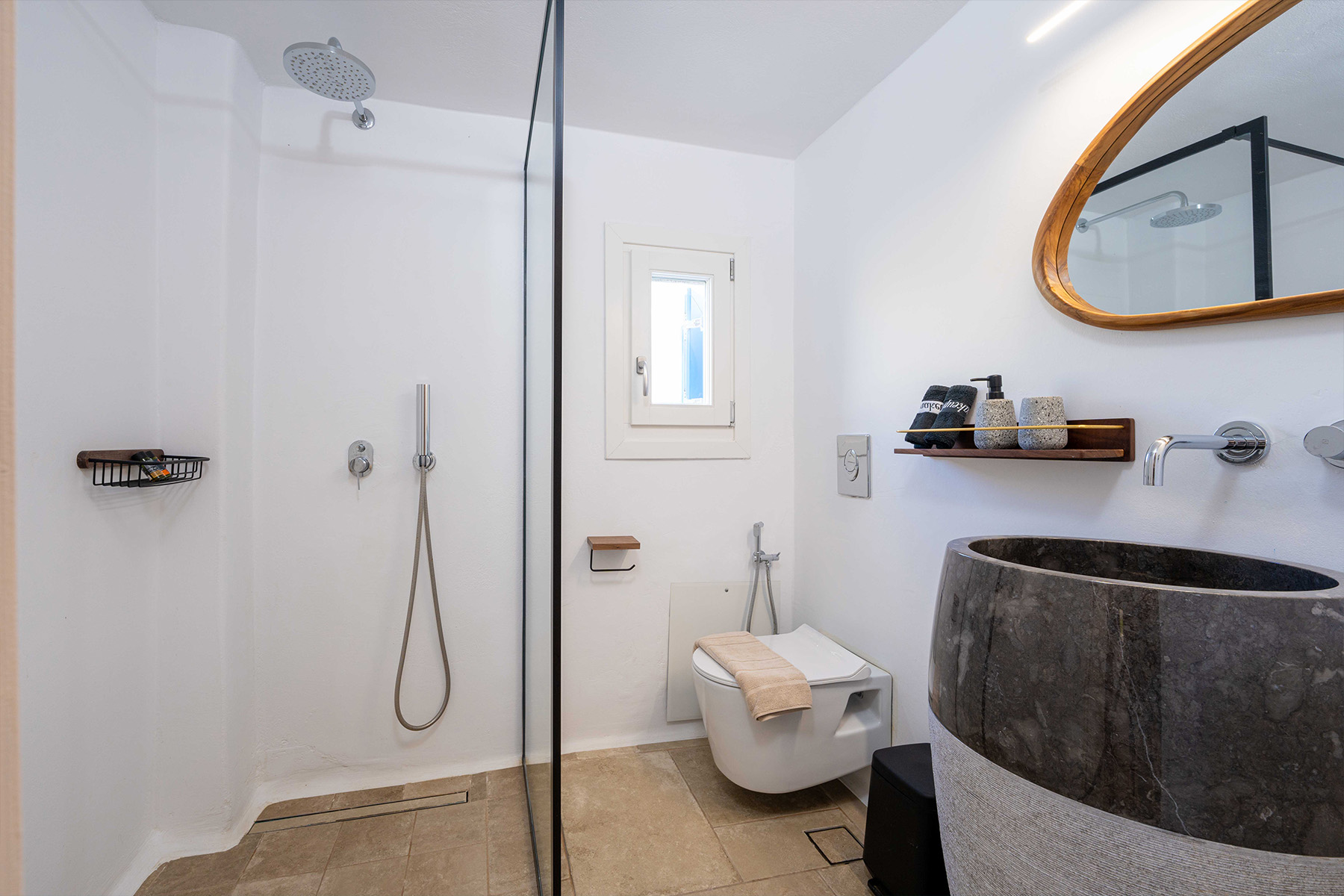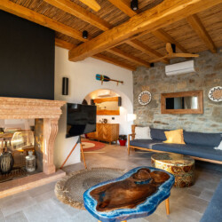 The main villa features a bright living room, dining space, and a fully equipped kitchen, along with four en-suite bedrooms – two on the ground level and two on the upper floor with private balconies overlooking the Aegean. An additional underground suite with its own entrance provides extra independence. The second building includes a kitchenette, two queen bedrooms with en-suite bathrooms, and a wine cellar, ensuring comfort and autonomy for guests who appreciate their own private space.